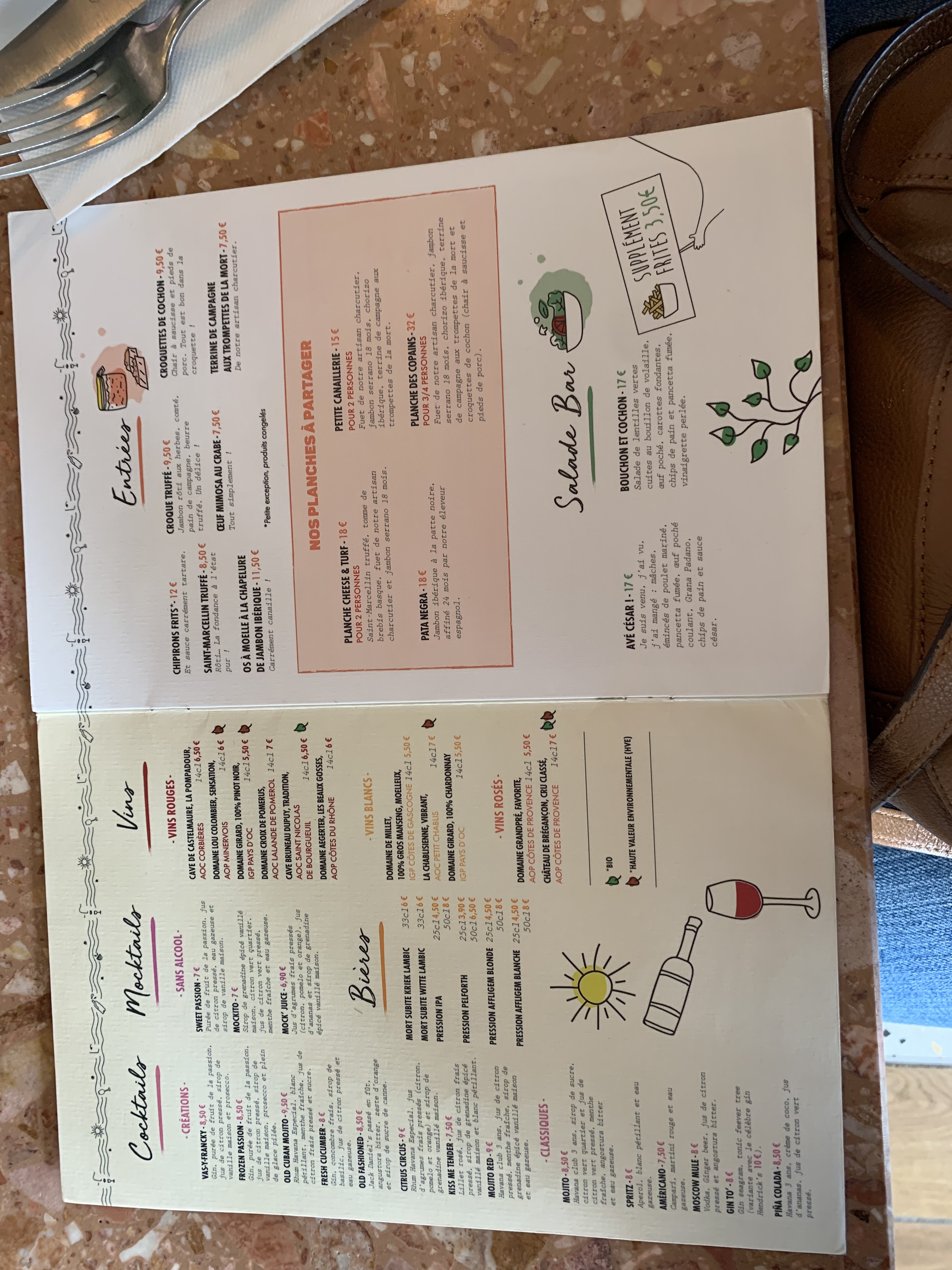 Bonjour , Première fois : - Les cocktails très bons ainsi que la tapenade en amuse bouche. - La planche à partager bonne globalement ( manque peut être d'un pickles ) et le fuet pas assez sec personnellement . terrine/beure aux herbes excellents au passage . - Le fish and chips bien servis la sauce bonne . - La basse coté , j'aurais pensé plus tendre , la sauce cèpes excellente , les garnitures salade / pomme allumettes portions généreuses . - Pas de dessert car bien calé , mais la prochaine fois oui . - Bonne ambiance et cadre/décor . - Le serveur et la serveuse étaient souriants et aimables . * Conclusion un solide 8/10 et nous reviendrons . Bon courage a l'équipe . Cordialement .