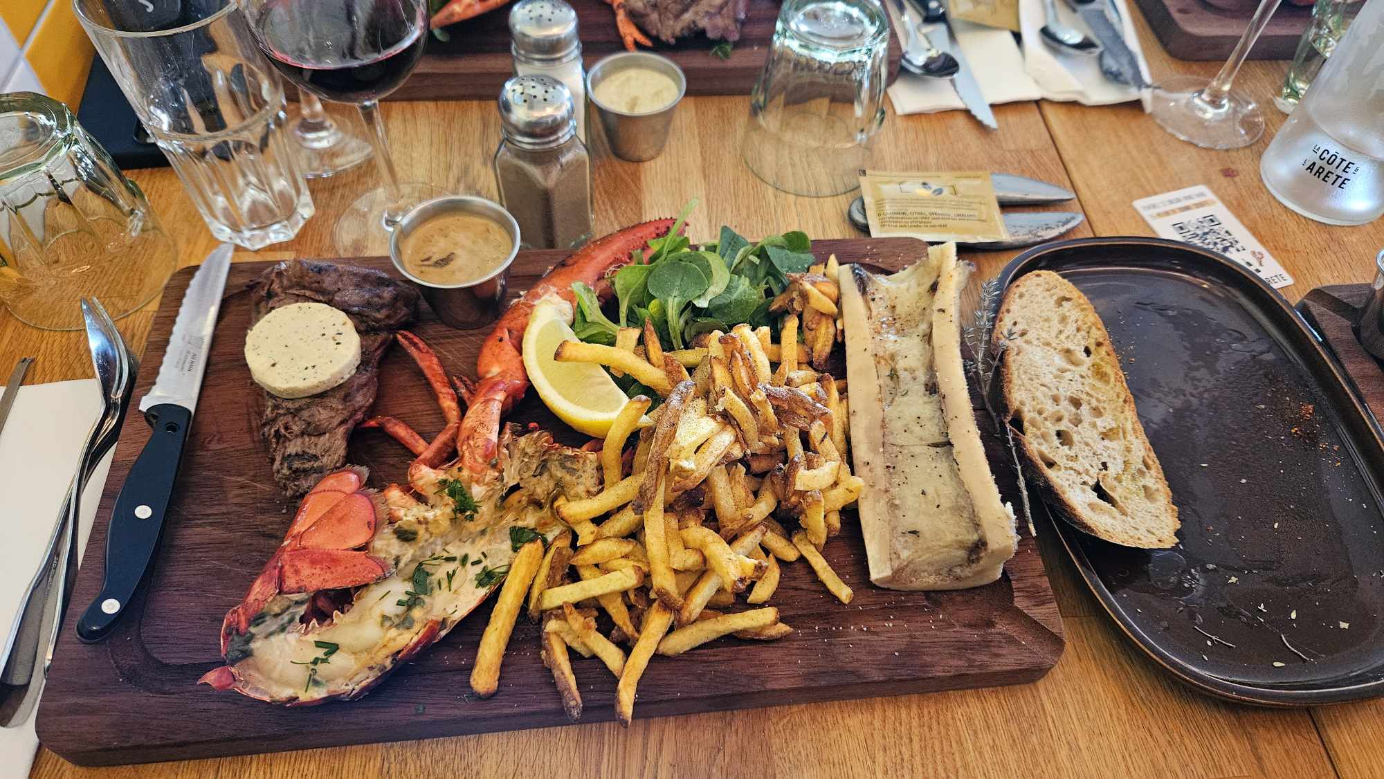 Une côte de boeuf excellente, des homards qui auraient gagné à être grillés au feu de bois plutôt que bouillis et une ambiance très agréable. Les serveurs étaient un peu perdus au moment de servir les apéros et les plats, ne sachant pas à quelle table aller, mais sympathiques malgré tout. Quelques améliorations à apporter dans la gestion du service mais rien à redire sur la nourriture.