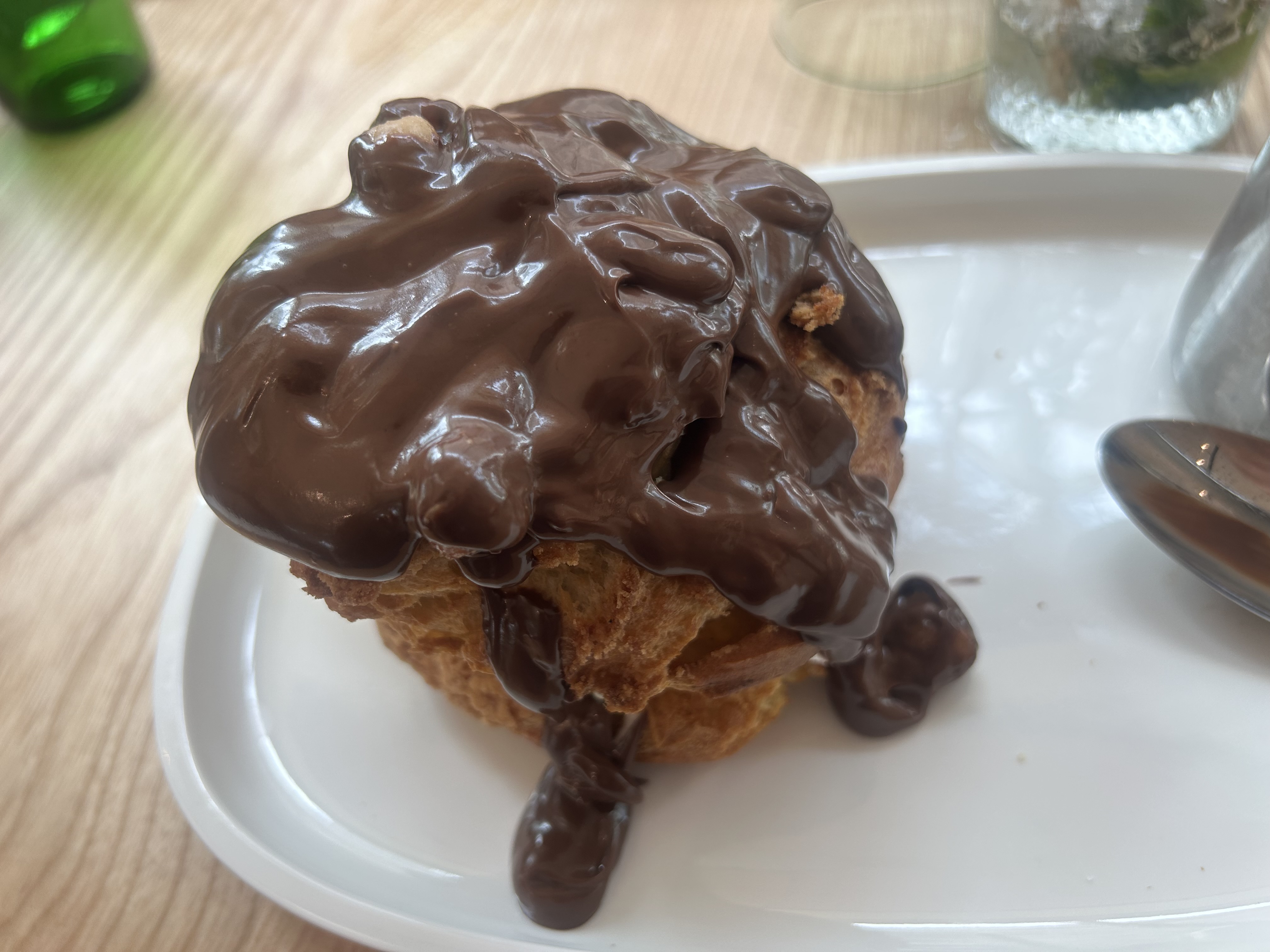 Viande juste magnifique Profiterole gigantesque, très gourmande, avec chocolat et noisettes. Excellent. On reviendra !