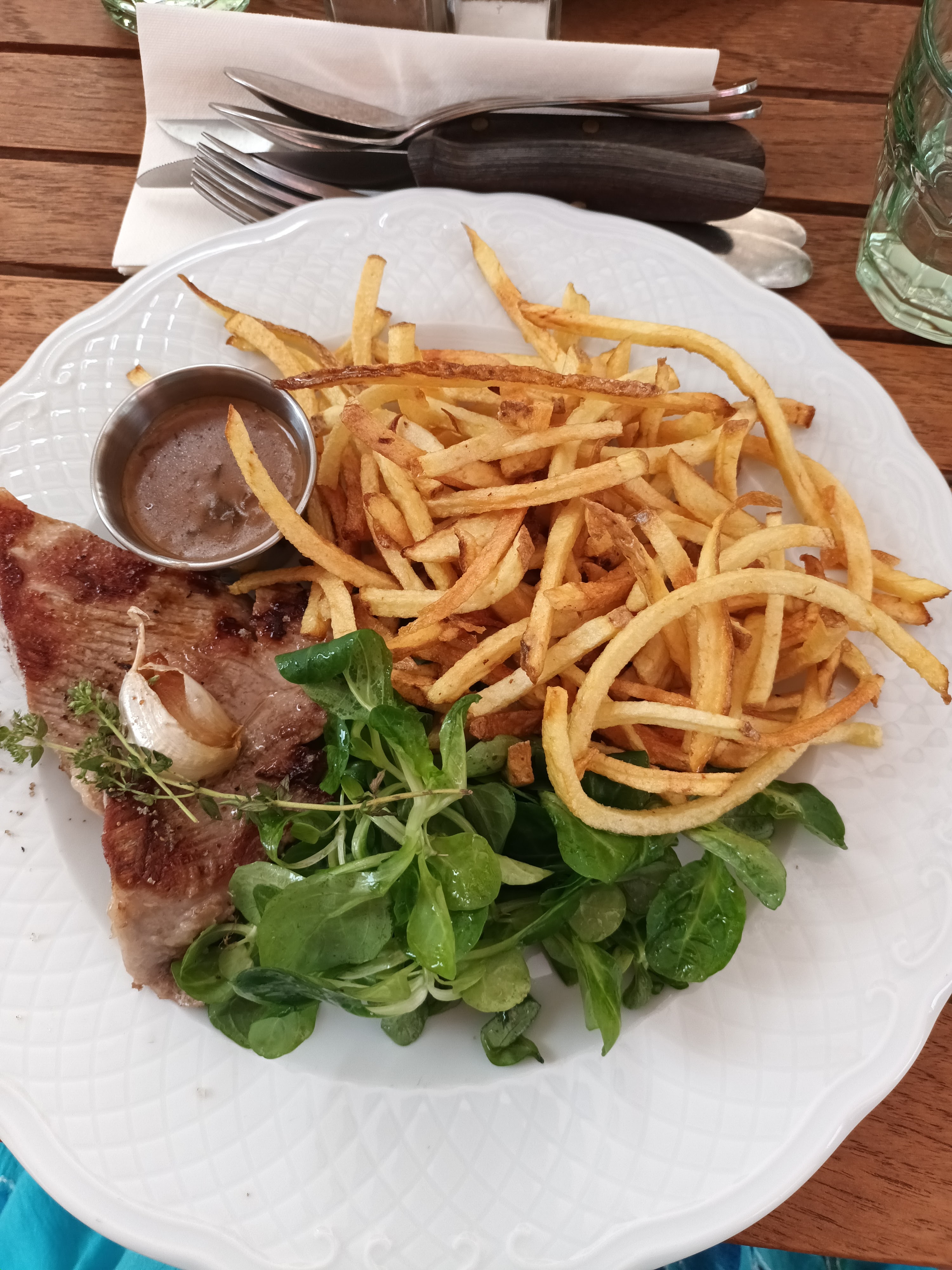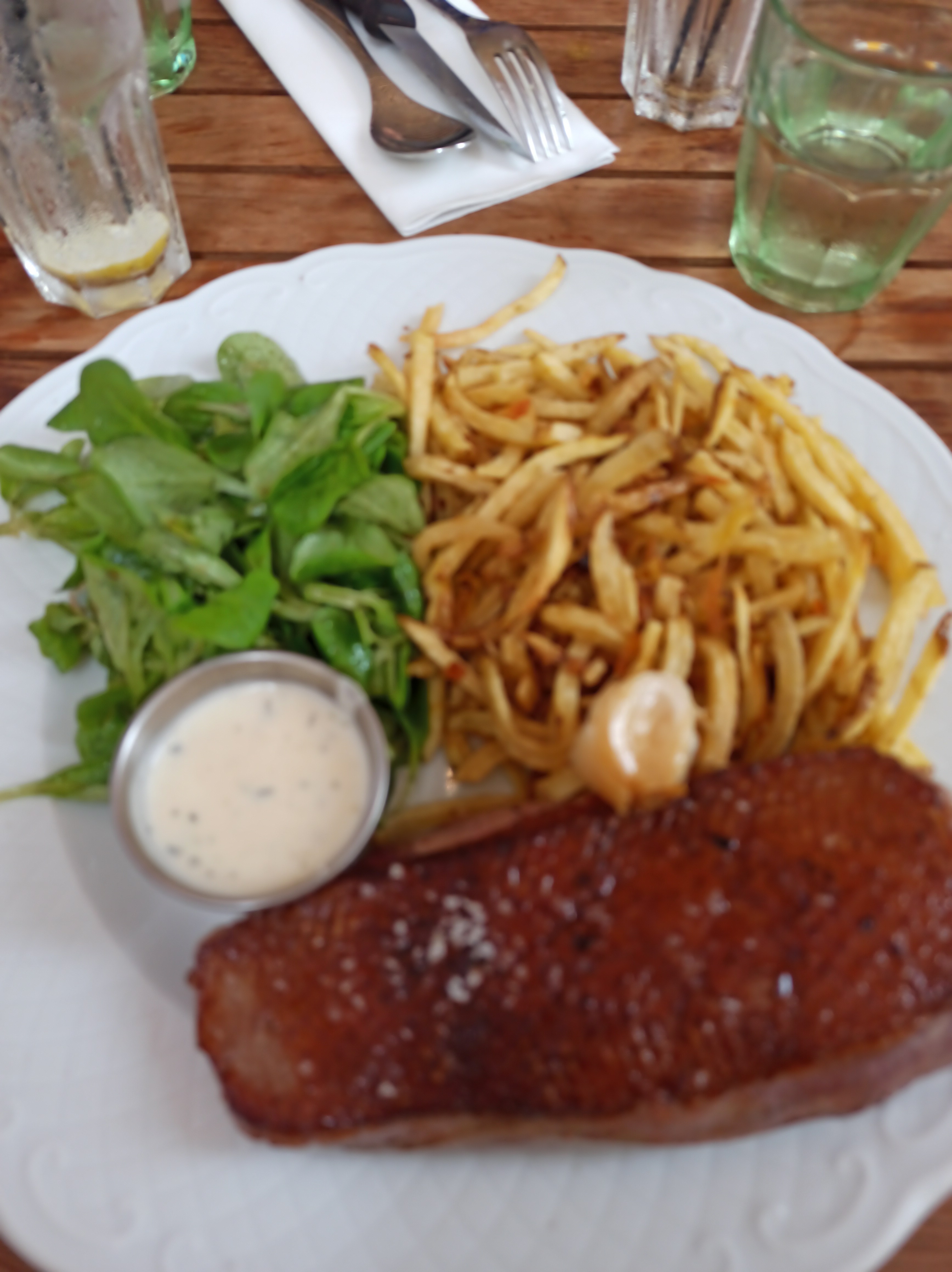 Viande très bonne (menu du midi) Frites trop fines de ce fait très grasses... Riz au lait trop cuit Service un peu lent Joli décor