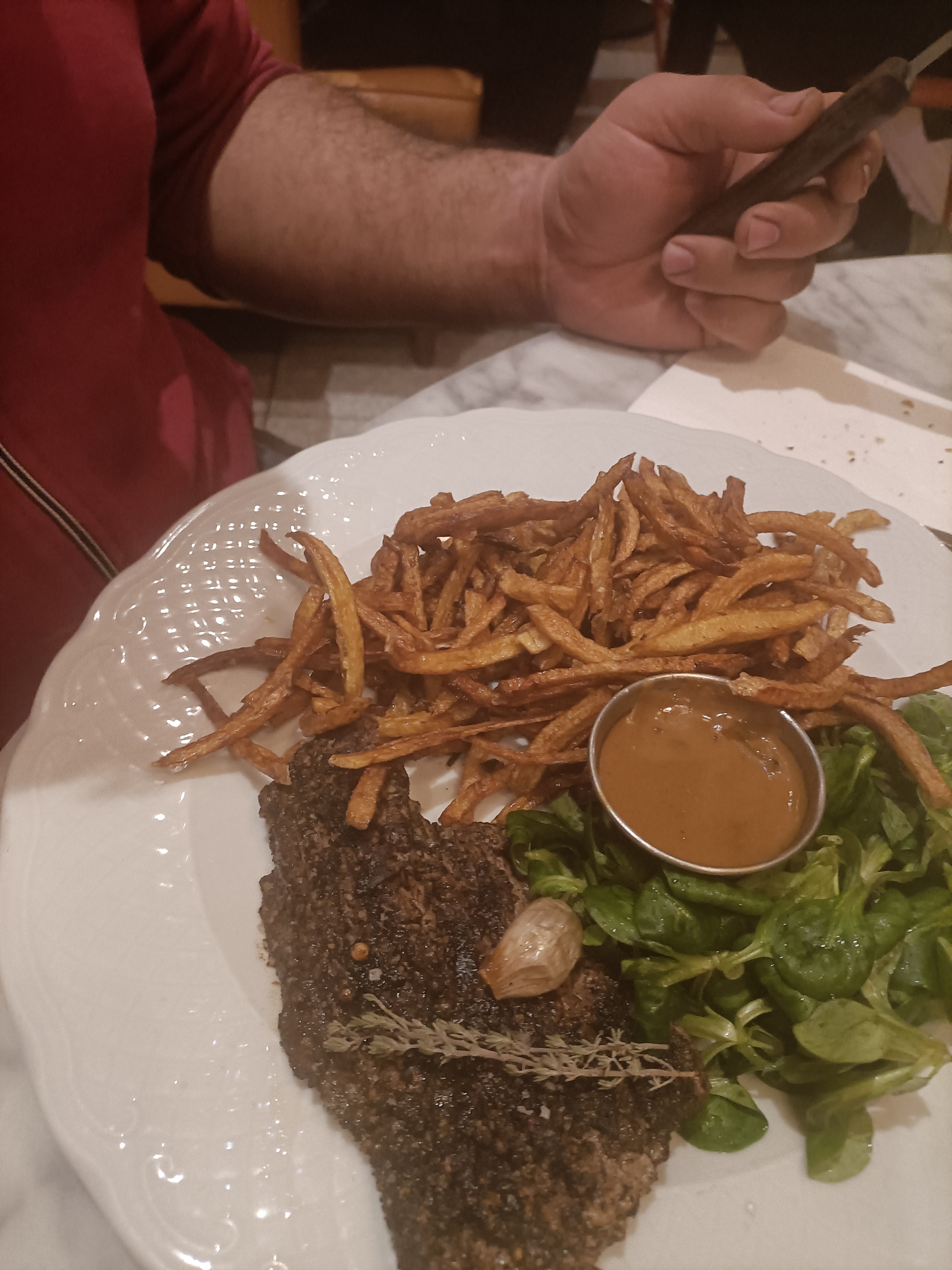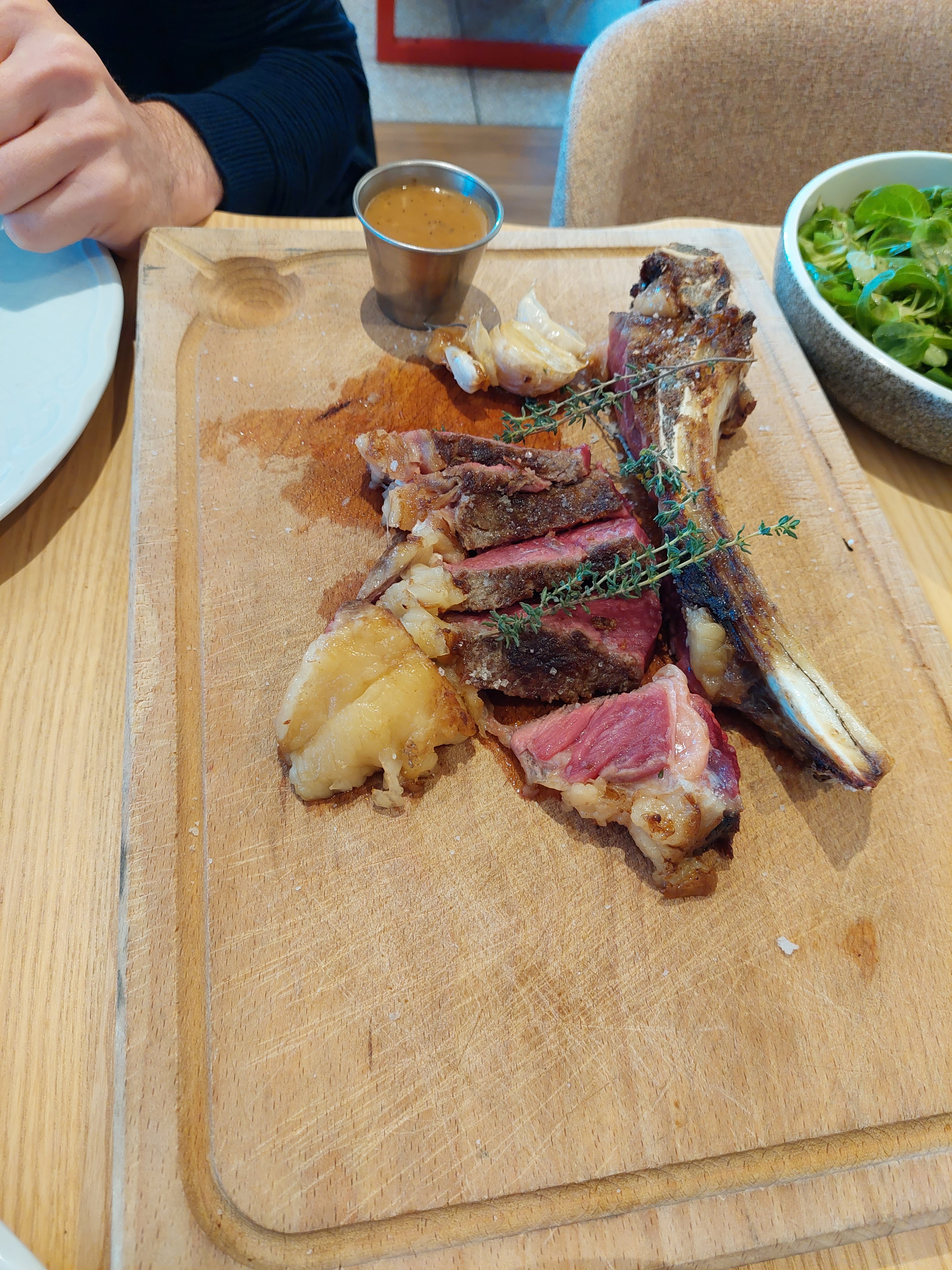Très bon moment passé famille mais quelques axes d'améliorations peut être : Servir de préférence la viande maturée sans herbes aromatiques, sans sel et sans ail Permettre au client de l'assaisonner comme il le souhaite Proposer de découper la viande devant le client... Salade trop huilée