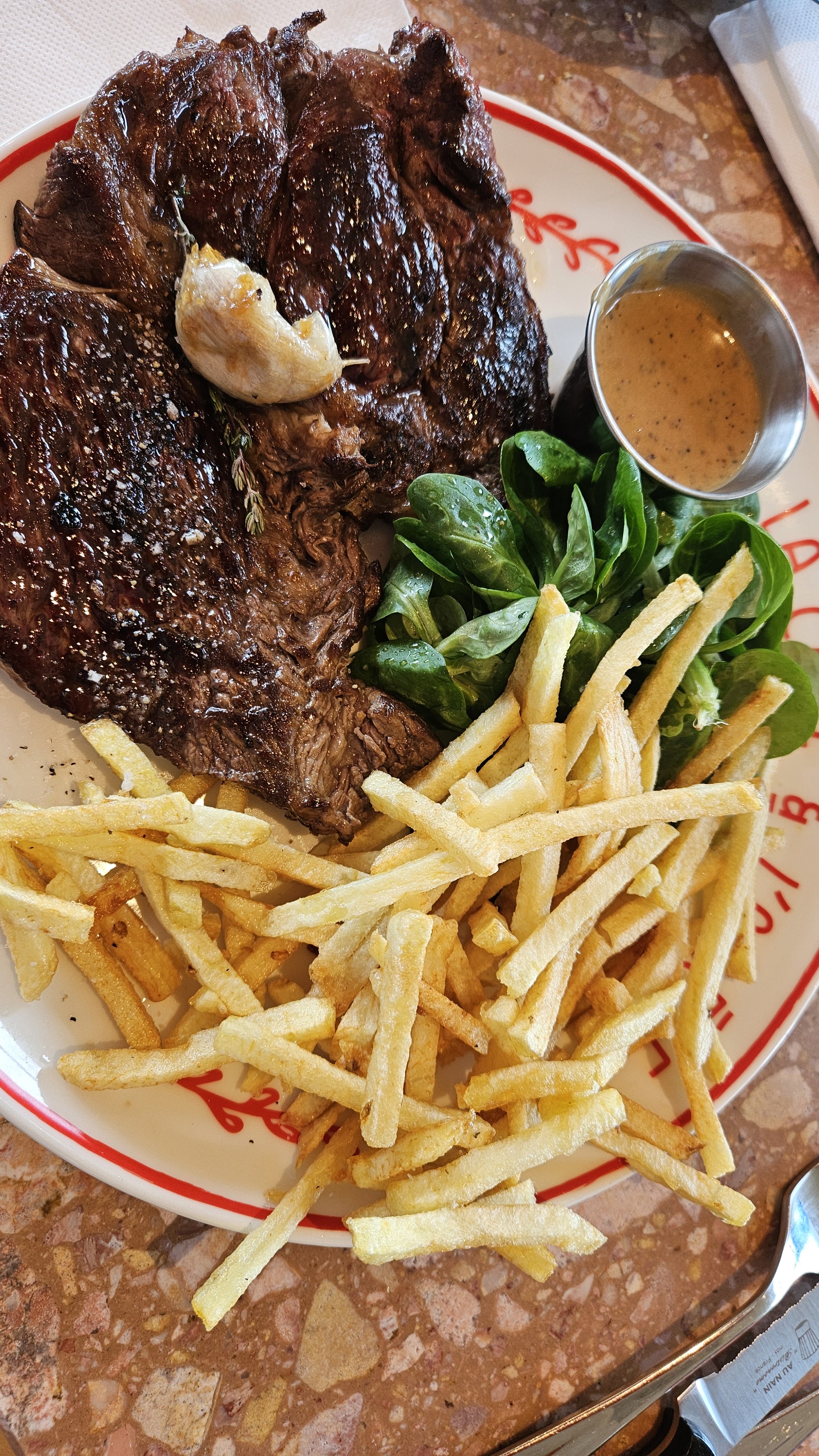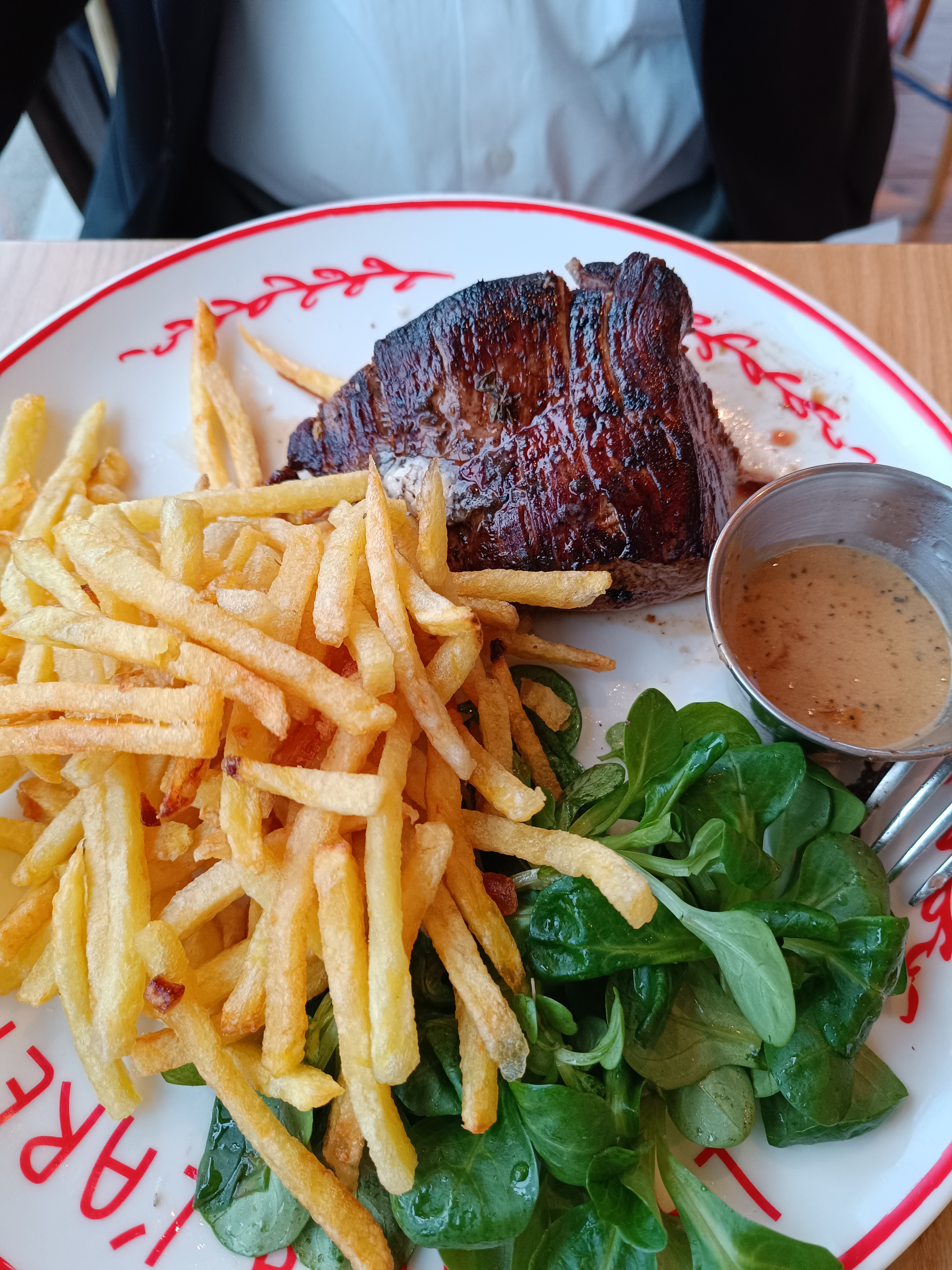 Viande très bonne, quantité satisfaisante, frites et salade à volonté. Profiterole excellente. Bon service. Un peu long entre chaque plat . Manque du personnel. Un peu bruyant.