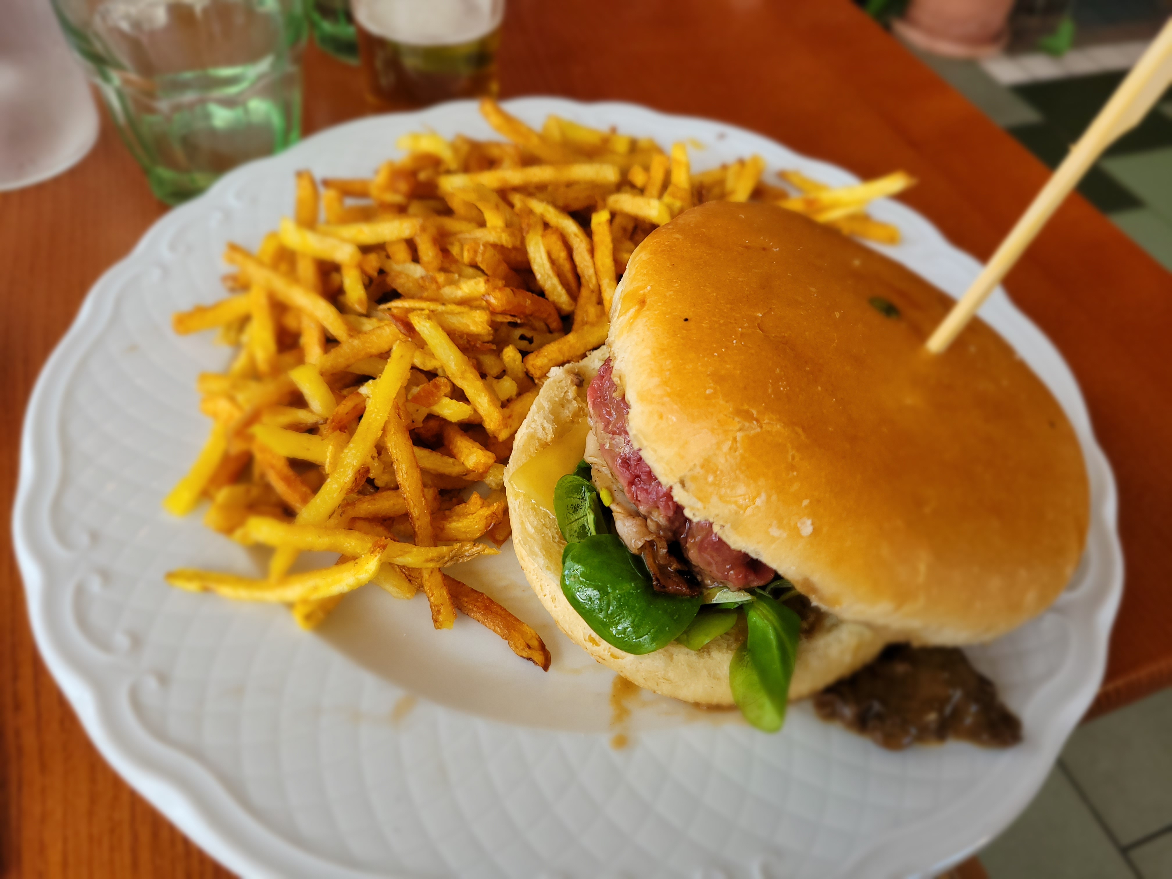De bons produits. Les cuissons sont bien gérées. Pour le Burger le fromage manque un peu de fondant. Et le pain est trop présent et masque le goût du steak haché qui est lui excellent. Mais cela reste quand même un bon Burger. Pour le service c est dommage de mettre en avant des origines de viande différentes si on ne sait pas expliquer leurs différences. La serveuse n à pas su nous expliquer la différence entre la viande d origine allemande et française si ce n est le pays ! C est dommage. Malgré cela cela nous avons bien mangé dans un cadre sympathique.