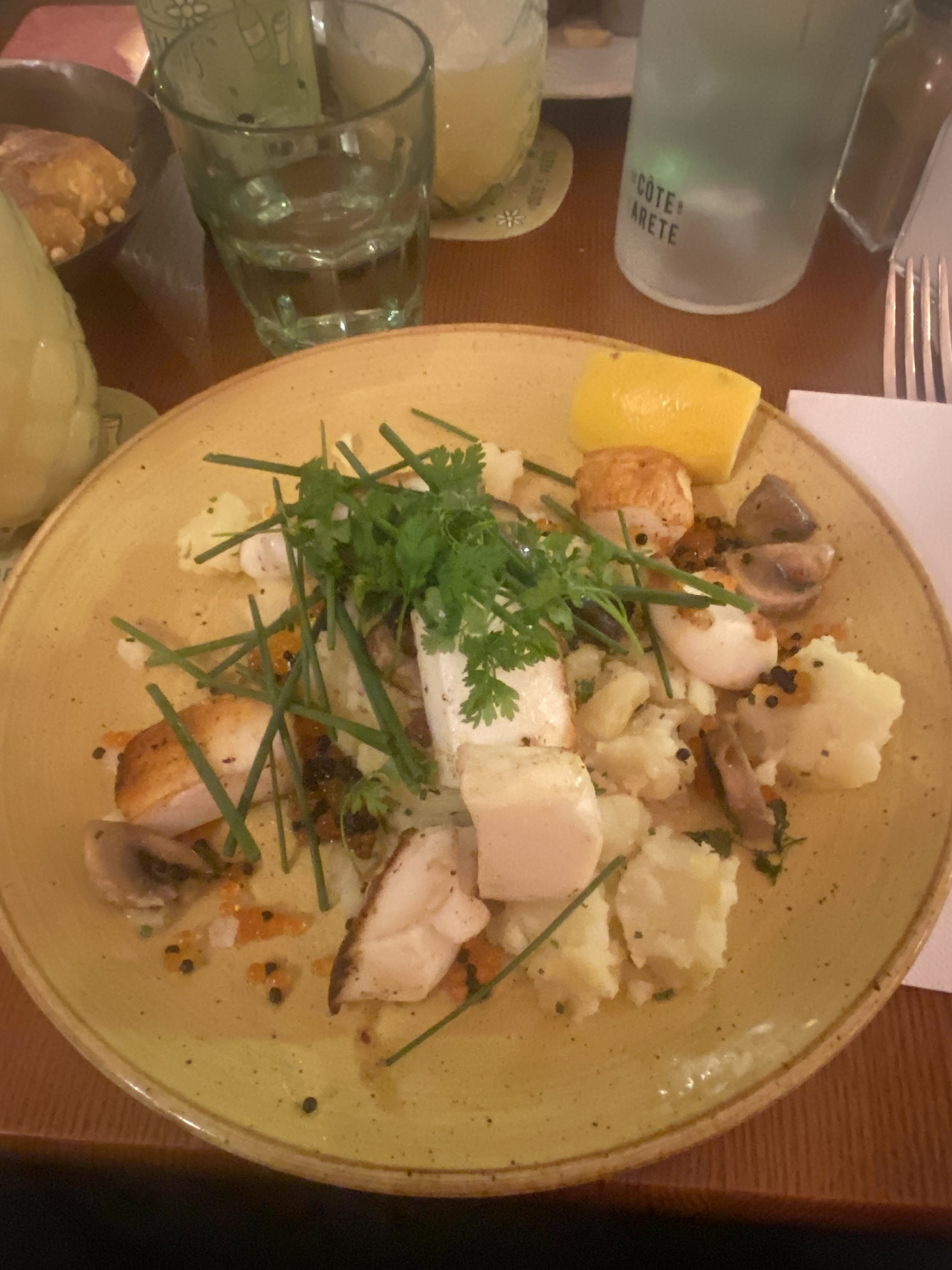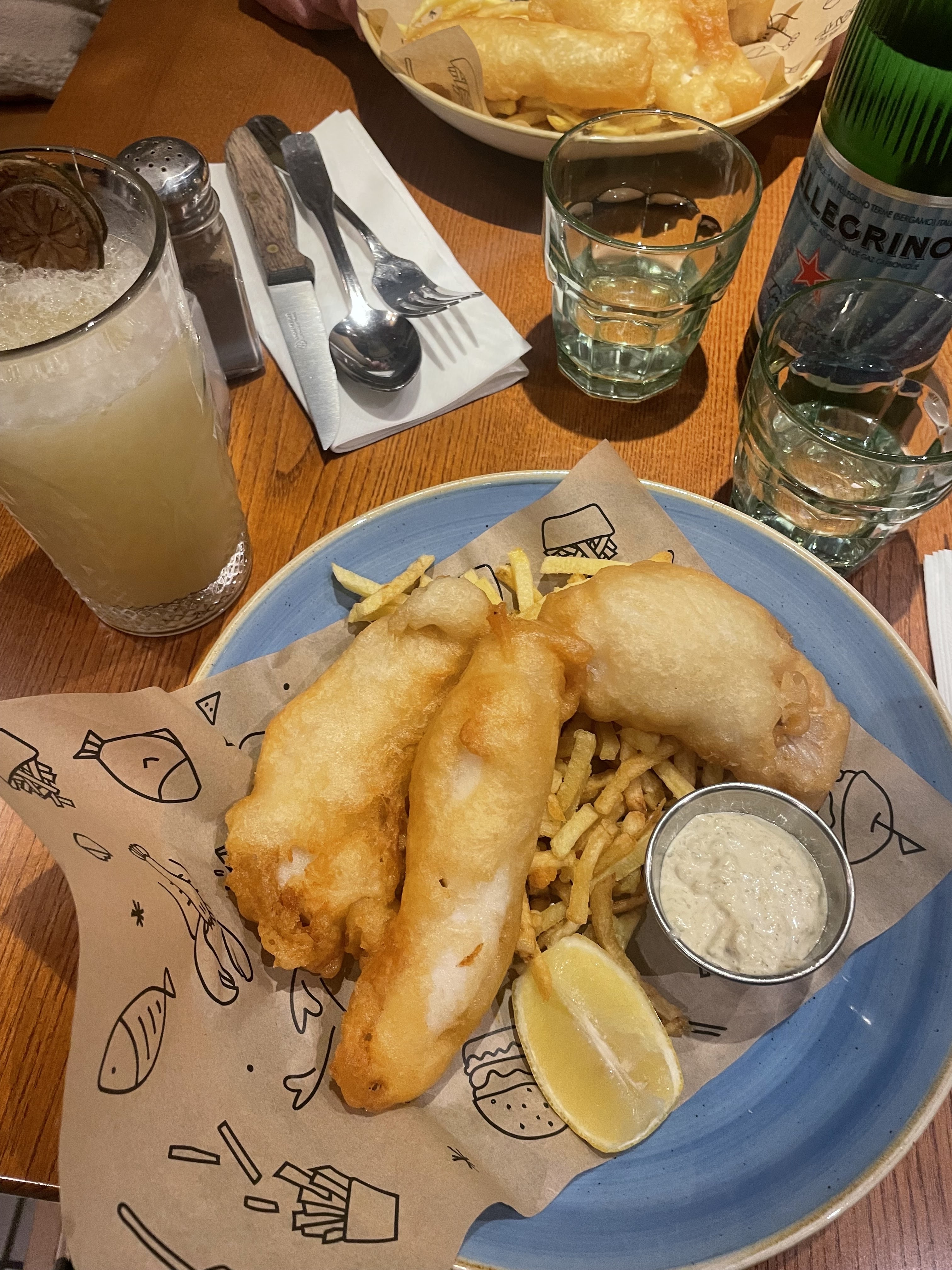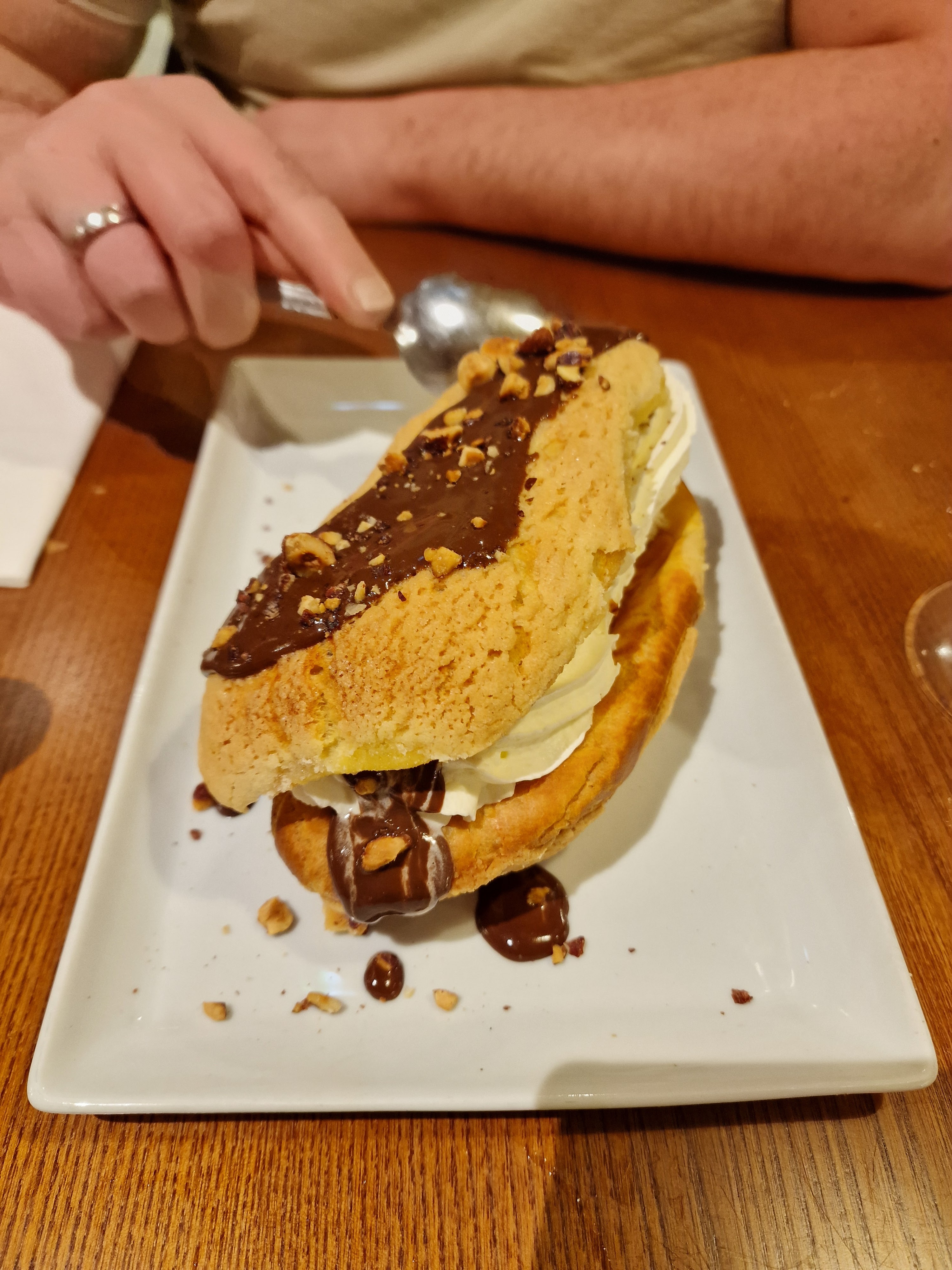 Plat bon, manquait un peu de salade avec le fish and ships, en général les restaurants mettent un peu de salade partout pas eux. Le chou de la profiterole était très sec.. A 9e le dessert il faut qu'il soit au top...