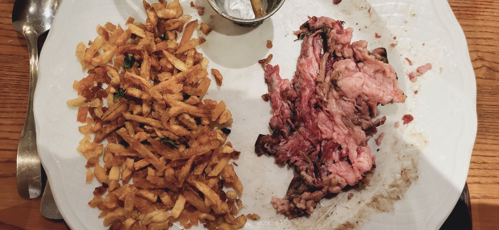 Nous étions 6 et tous extrêmement déçus ! Service très long du début à la fin ! Table non éclaircie jusqu'à notre départ, les verres d'apéro sont restés sur la table (voir photo) ! L'apéro.....normal ! Les entrées.....bof ! Le vin.....bien ! Les plats.....médiocres pour certains et bofs pour les autres: - 1 Tartare de Boeuf: sans + ! - 3 Fishs and Chips: très gras ! - 2 Basses-Côte Simmental persillées: à éviter: déjà les 2 ne se ressemblaient pas, comme si c'était 2 viandes différentes. Une était nerveuse et l'autre était très nerveuse ET hyper grasse (voir photo) ! Quasi 20 balles pour à peine 3 bouts de fourchette de viande, c'est très cher payé ! Et pour finir, les frites euhhh je n'appelle pas ça des frites mais des Allumettes fond de cuve ! Tellement déçus qu'on a décidé de partir parce que le serveur qui nous sort toutes les excuses du monde pour justifier l'état des viandes, ça nous à gonflé ! Au final, 190 € ! Sincèrement, passez votre chemin et allez plutôt en face; aux 3 Brasseurs !