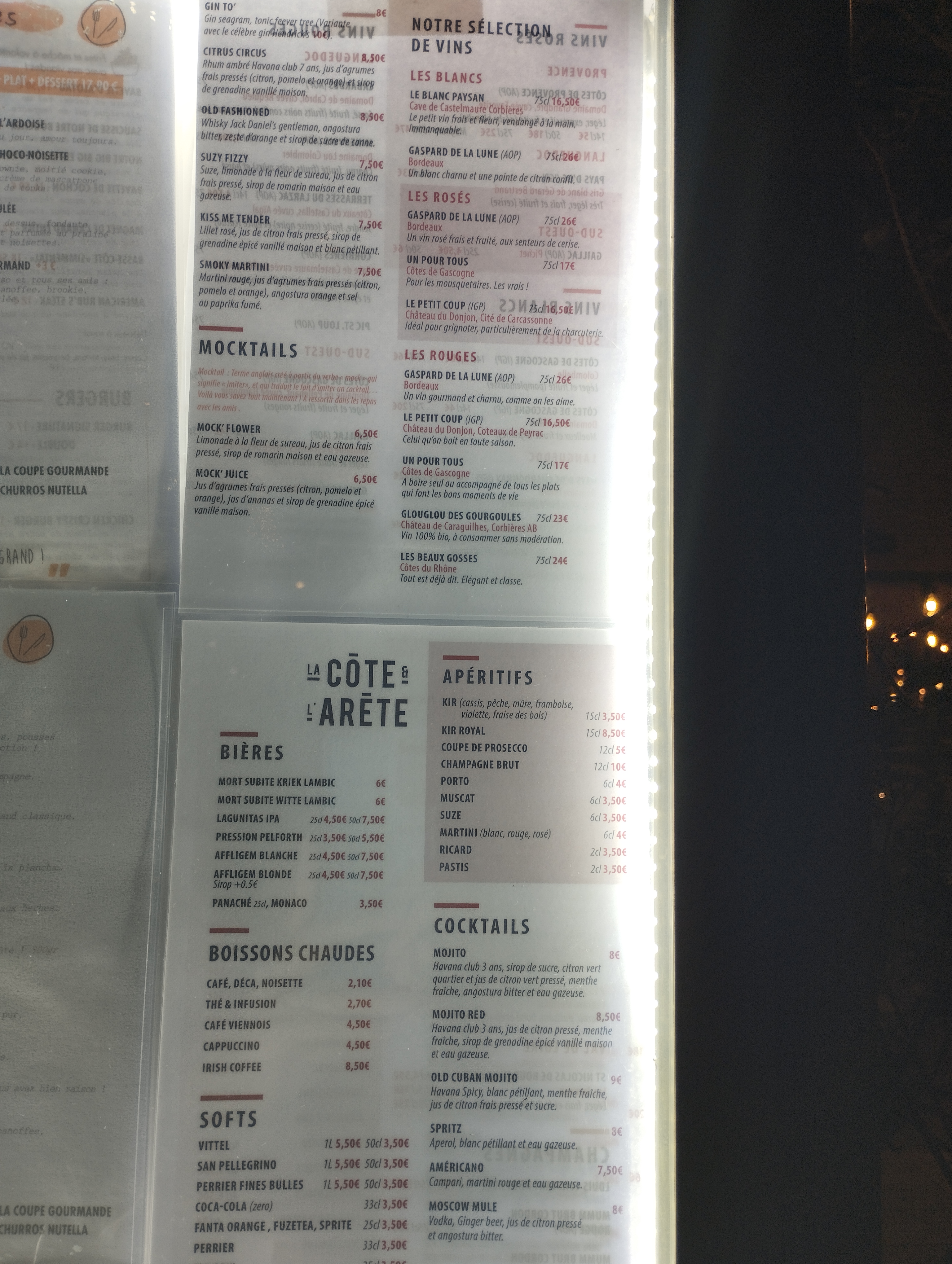 Étonnées par tous ces avis positifs ! Ayant dîné au restaurant DE LA CÔTE À L'ARÊTE hier soir 20 Janvier 2024), mon amie et moi nous faisions une joie de découvrir cet établissement afin de fêter un petit évènement personnel... Grande fut notre déception sur plusieurs points !.. - 2 cocktails/apéritifs plus que quelconques pour patienter...longtemps ! - Personnel désorganisé (clients arrivés après nous et servis avant ! par exemple..), même si sympathique... - Nous avons beaucoup trop attendu et avons réclamé par 2 fois nos plats ! - Frites à volonté grasses (voire dégoulinantes) et peu appétissantes ! - Cuisines éteintes et fermées avant la fin du service !!! (toujours ce problème d'organisation !) - En guise de dessert le café gourmand était à la limite du ridicule...(9€, c'est un gag !?) - Pour résumer, 90€ pour ce repas...euhhhh....vraiment pas sûre que l'on nous y revoit ! Reste un cadre joli et agréable, une viande de qualité, et un personnel dans l'ensemble sympathique... Voilà....Voilà....mon (notre) ressenti dans les grandes lignes !
