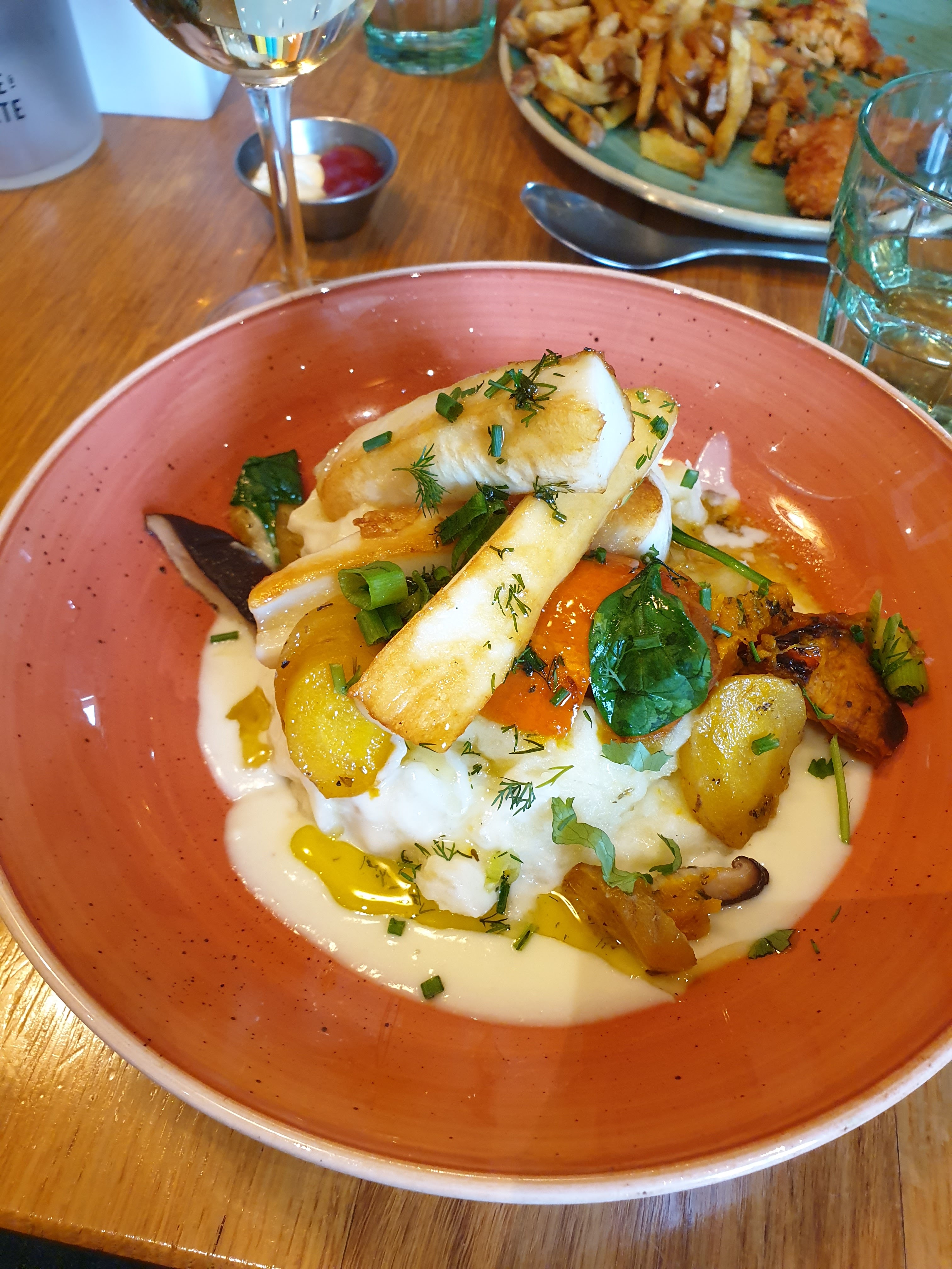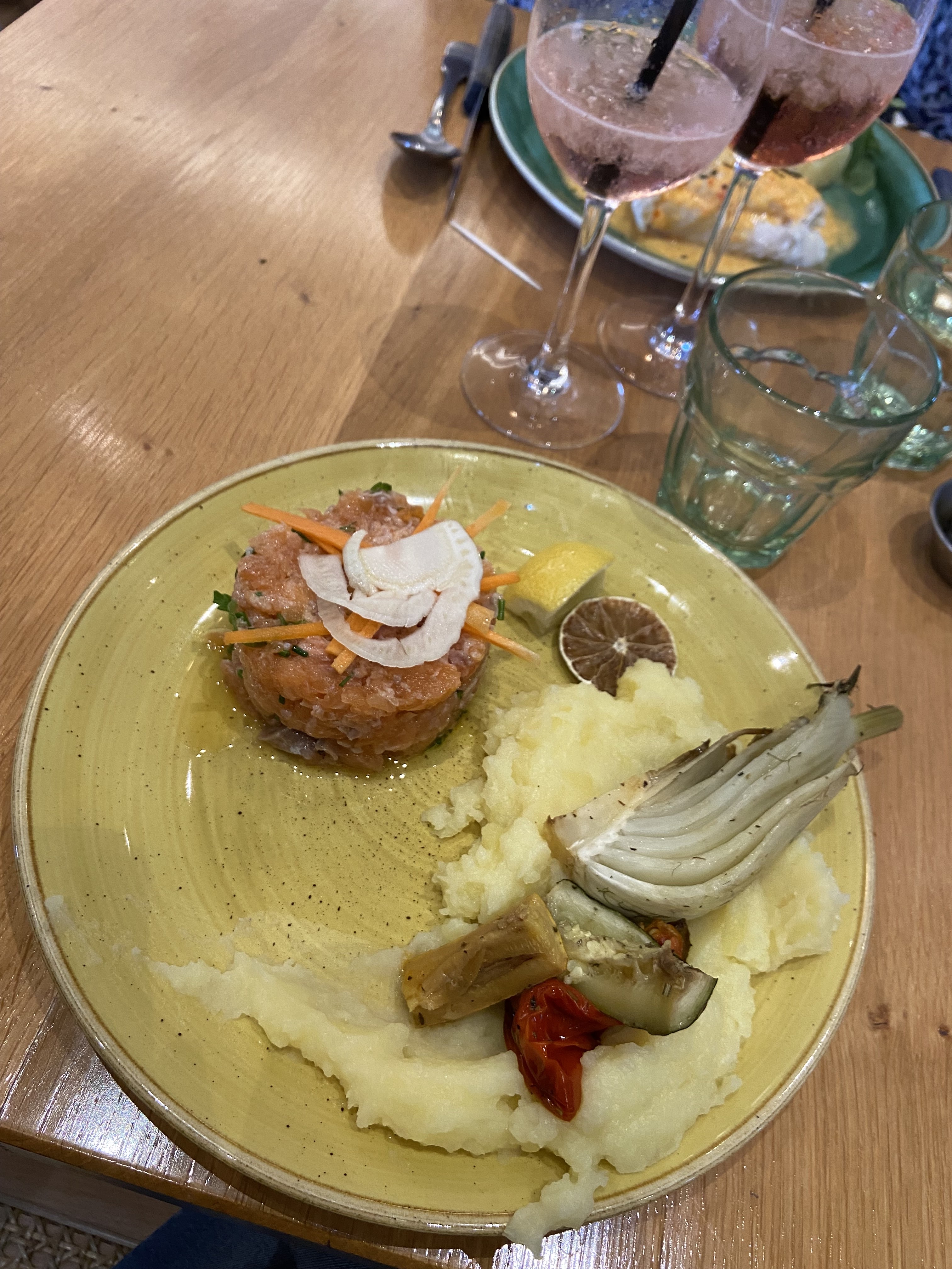 La Pina colada n'avait pas beaucoup de goût et don fish&chips un peu sec, mon tartare de saumon très bon ! Les vins au verre à 8,50€ c'est abusé... La moyenne dans les bars et restaurant est de 5€, 6€ max. Les planches à partager avaient l'air plus goûteuses... Le café gourmand à des petits dessert supers bons, et c'est rare donc bravo.