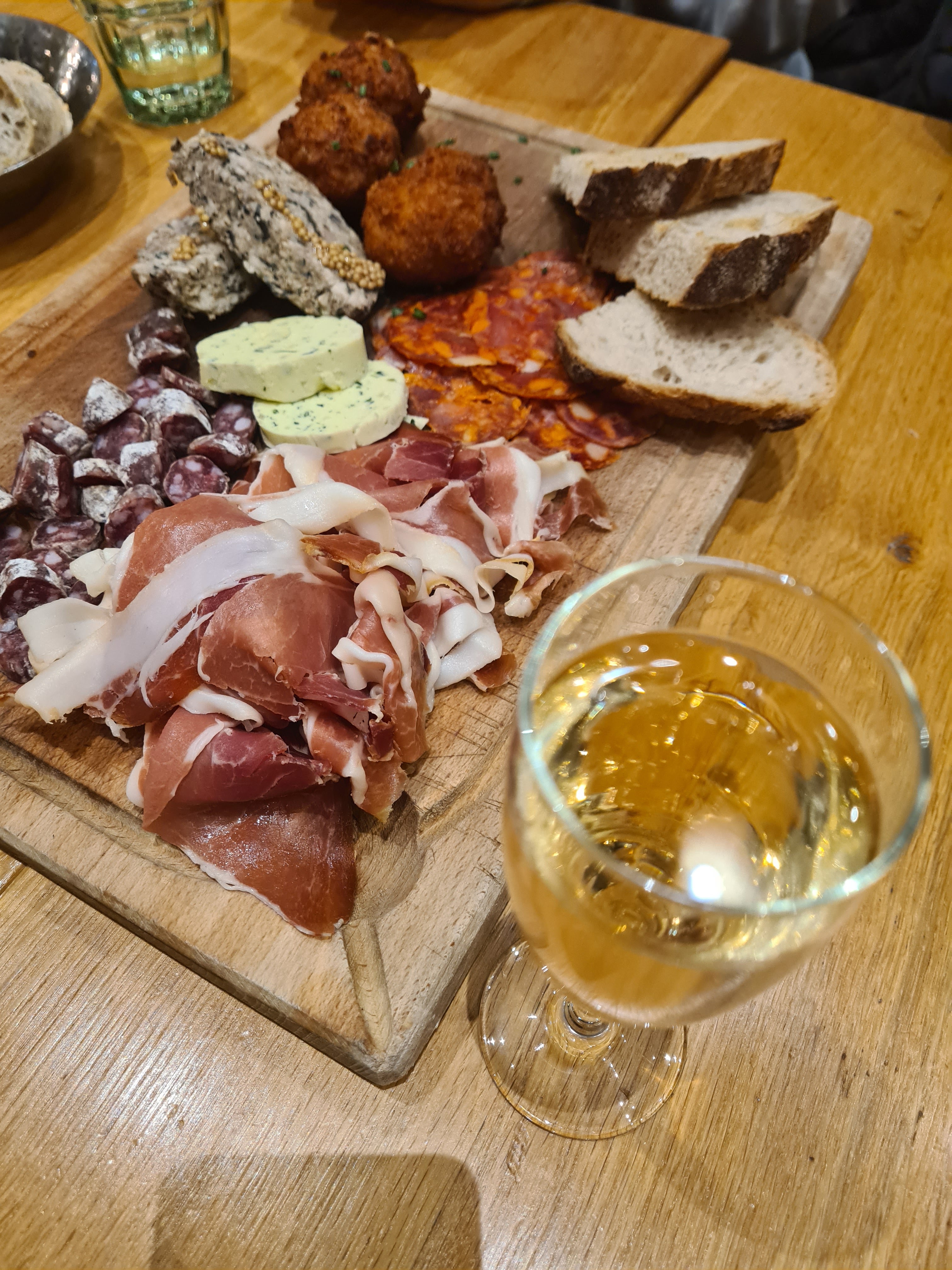 Déçu pas le plat un camenbert rôti au truffes C est un camenbert de 6 cm de diamètre environ et 2 tranche de pain 11 € pas de salade Pas de charcuterie Une planche de charcuterie 6 morceaux de jambon et 2 morceaux de pain 18 € Une honte Et après il se plaignent qu il n y a pas de clients