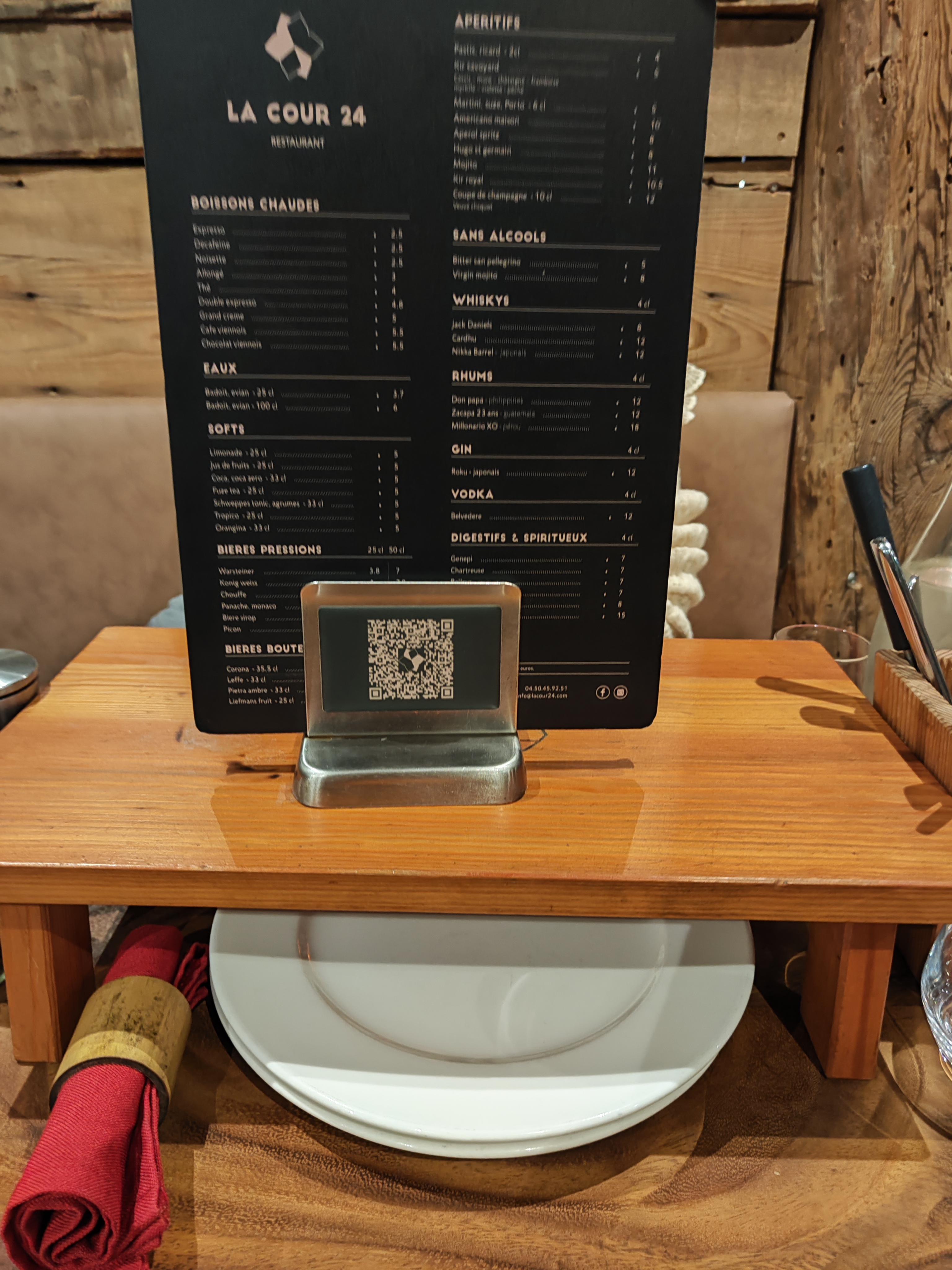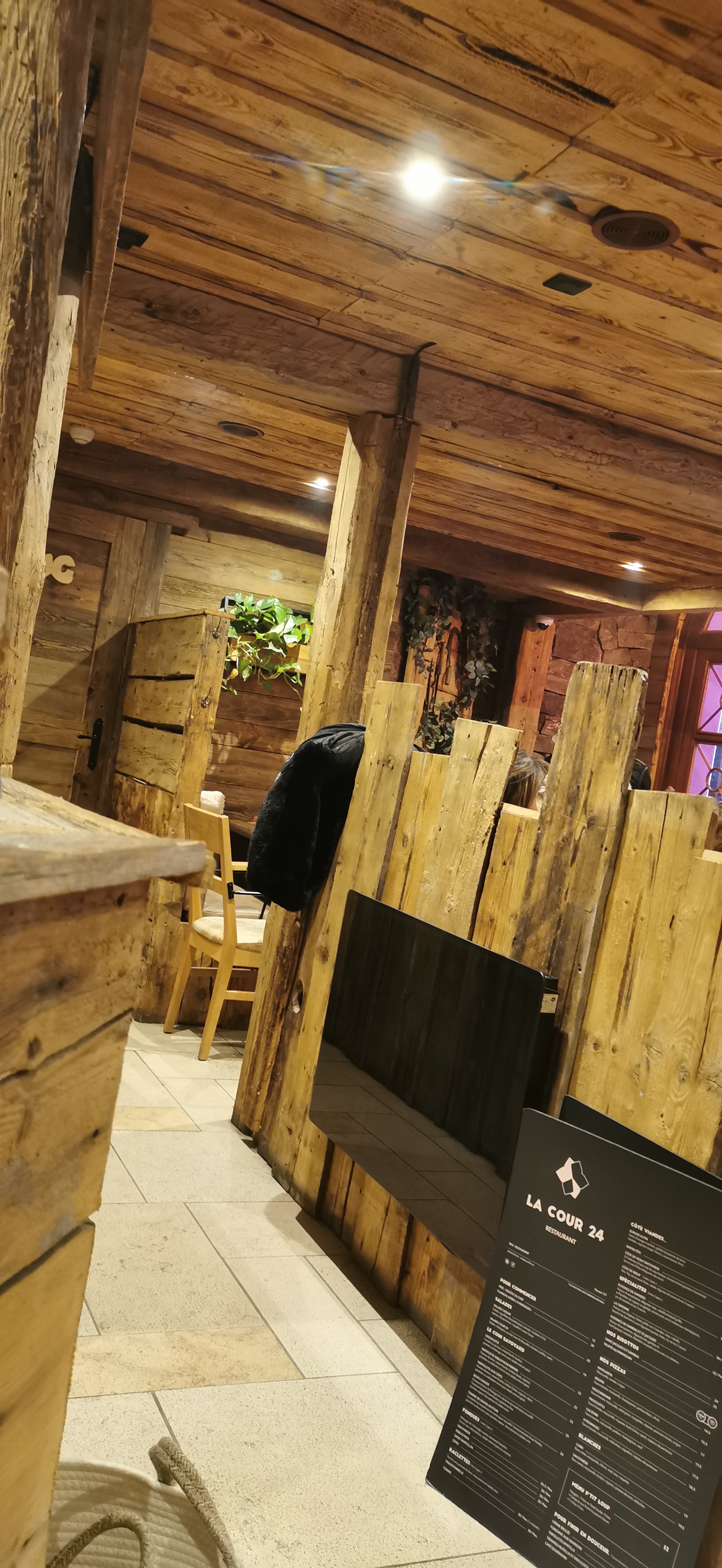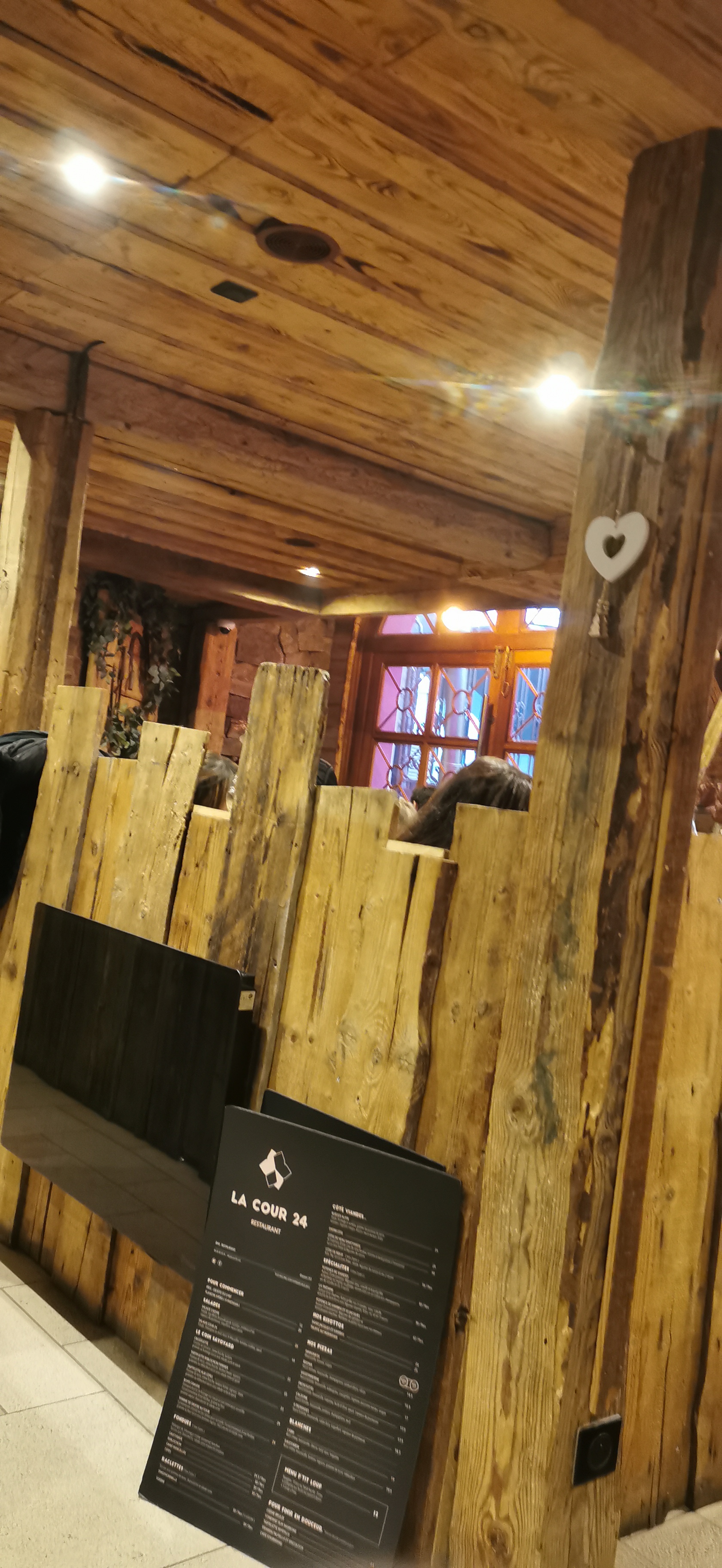 Restaurant au charme savoyard avec son bois, ses banquettes et coussins. Cependant très très serré à l'intérieur. Je regrette le fait qu'on nous annonce lors de la réservation une unique possibilité pour 6 à 19h30, on nous installe juste à côté de la porte des toilettes, Le claquement de la porte de ces derniers et du coup le vibrement du bois sur nos banquettes est extrêmement désagréable tout du long de notre repas alors que... plusieurs tables disponibles pour 6 sont vides et l'ont été tout du long de la soirée. En ce qui concerne les plats commandés 3 sur 6 n'allez pas: la boite chaude était ( sans exagération) tiède , non fondante. Filet de perche complètement non salé, burger on cherche la sauce ! Nous n'avons pas renvoyé les plats car nous craignons beaucoup trop d'attente et avec ces claquements de porte de WC nous ne désirions pas perdre de temps. Je souligne que la serveuse en salle été présente et extrêmement souriante. Nous sommes du secteur et découvrons ce soir la cour 24 je le definirais comme un sympathique restaurant touriste. Difficilement j'y retournerai car malgré le partage de notre ressenti aucune réaction du personnel.