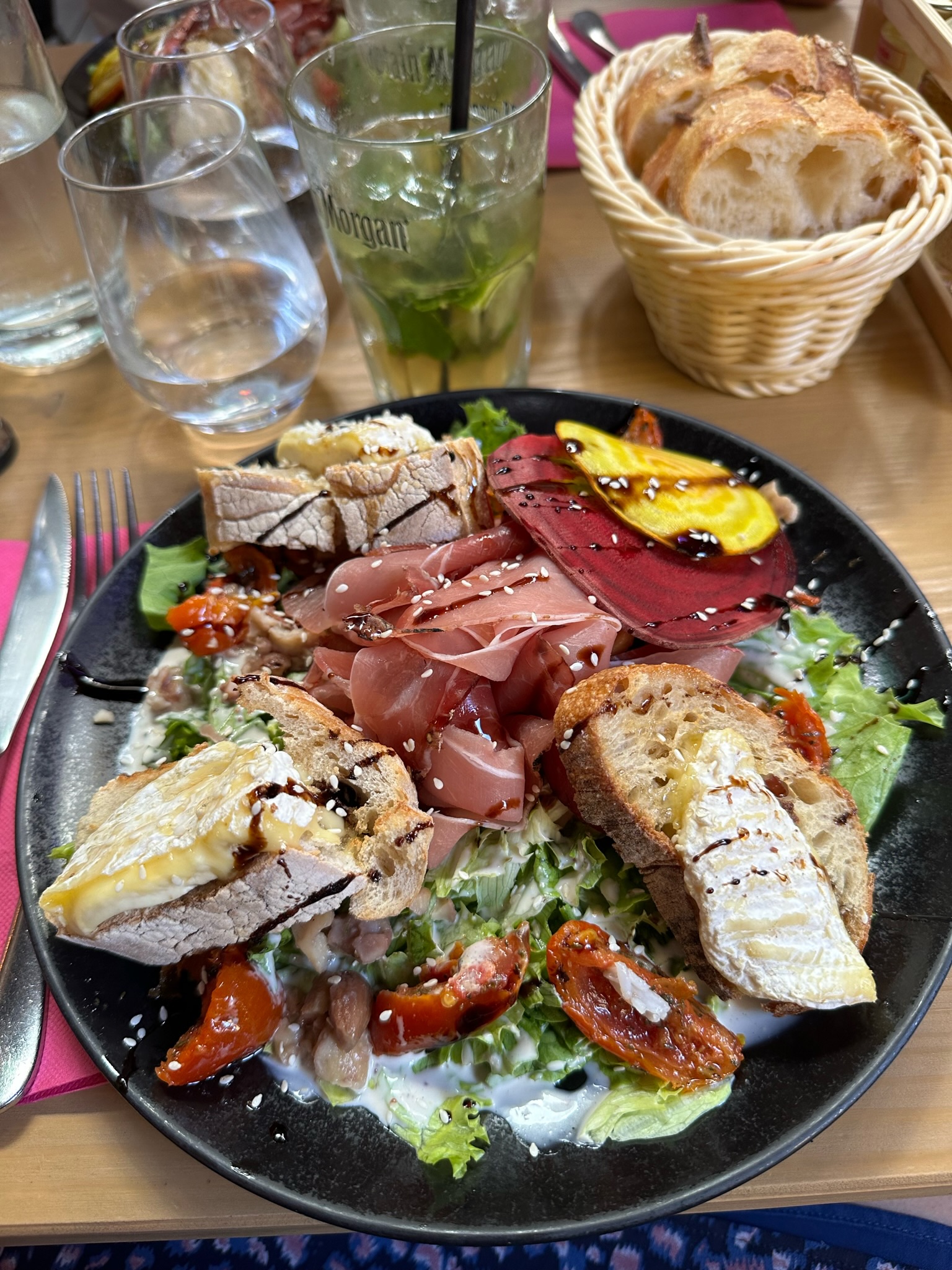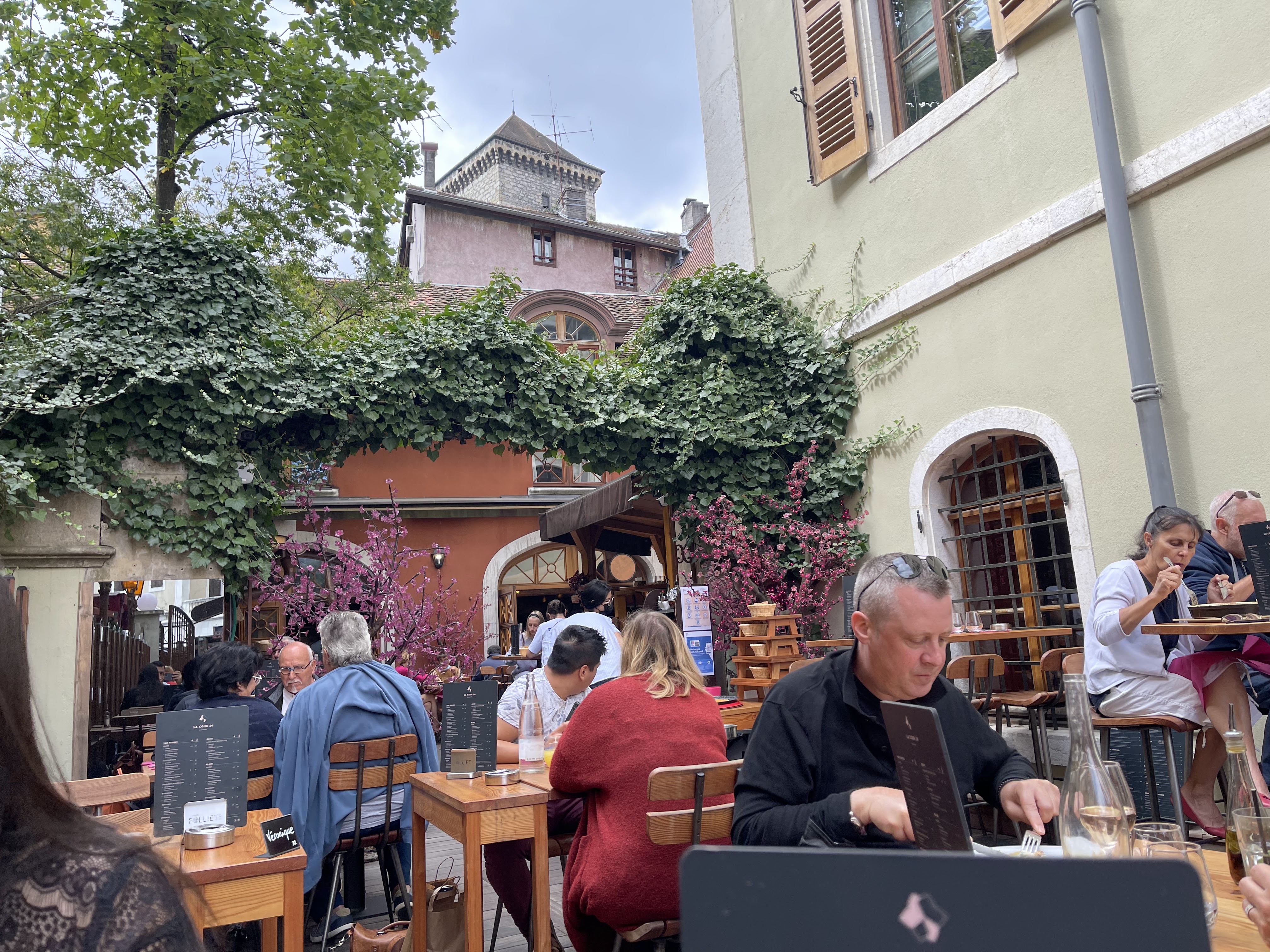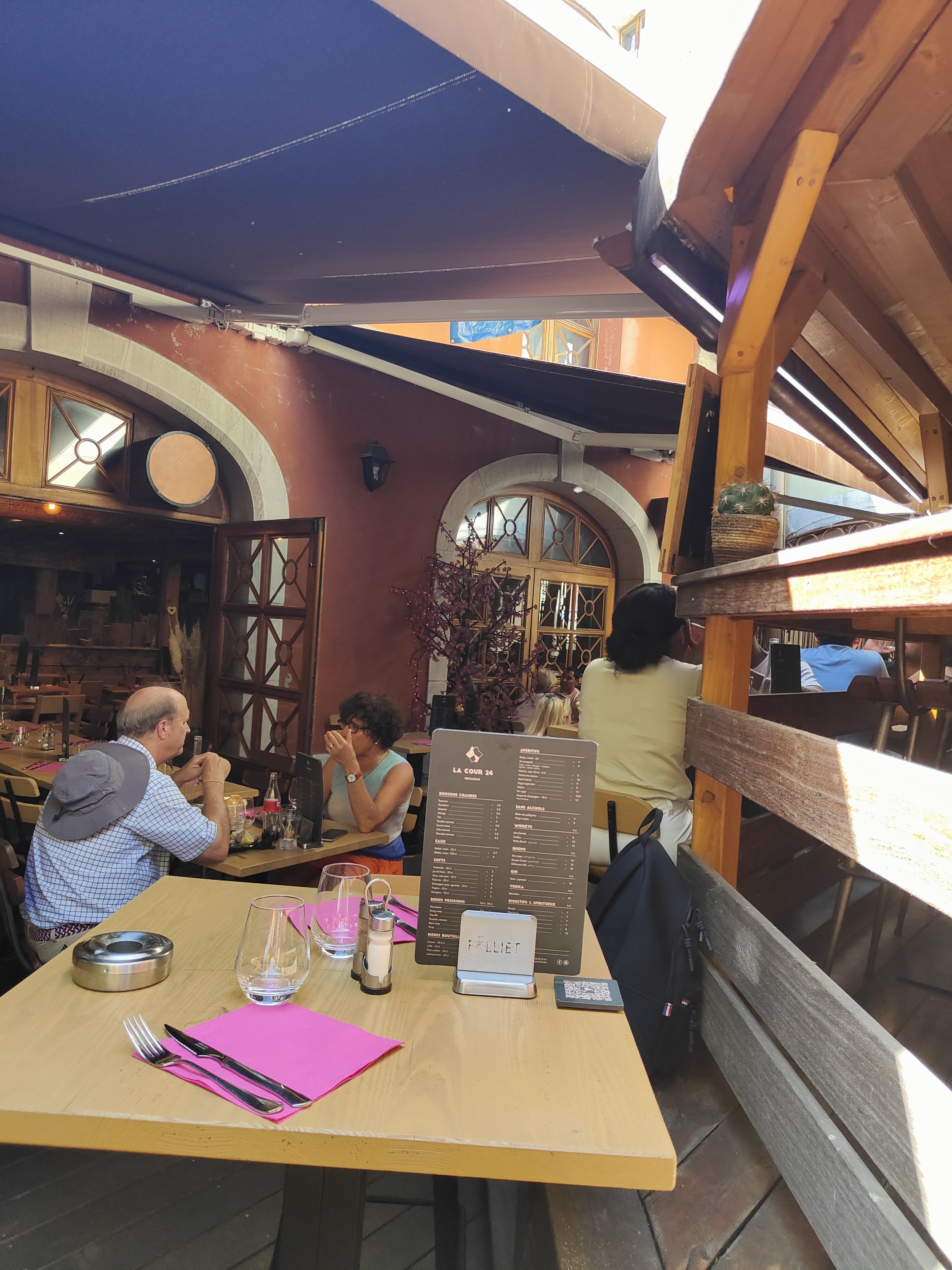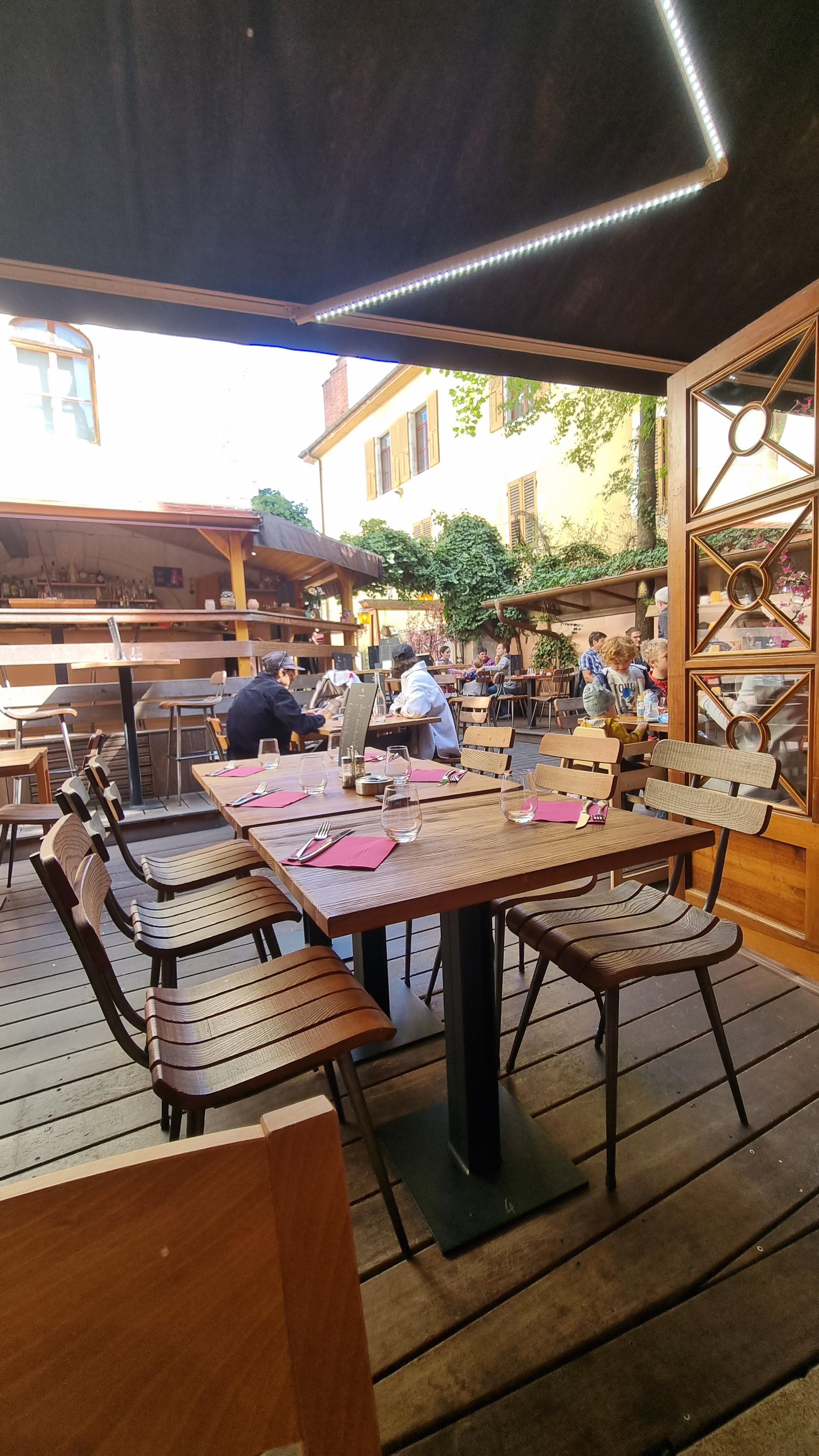 Restaurant chaleureux, jolie cour bien décorée, au pied de la vieille ville et du lac. Service ok. Nous avons commandé la salade cour 24 : très bonne, et le fromage fondu dans sa boite : bon aussi. Dessert tarte au citron revisitée : très bonne ; un peu moins enjouée par le café gourmand. si nous repassons un jour à Annecy, nous y retournerons assurément !