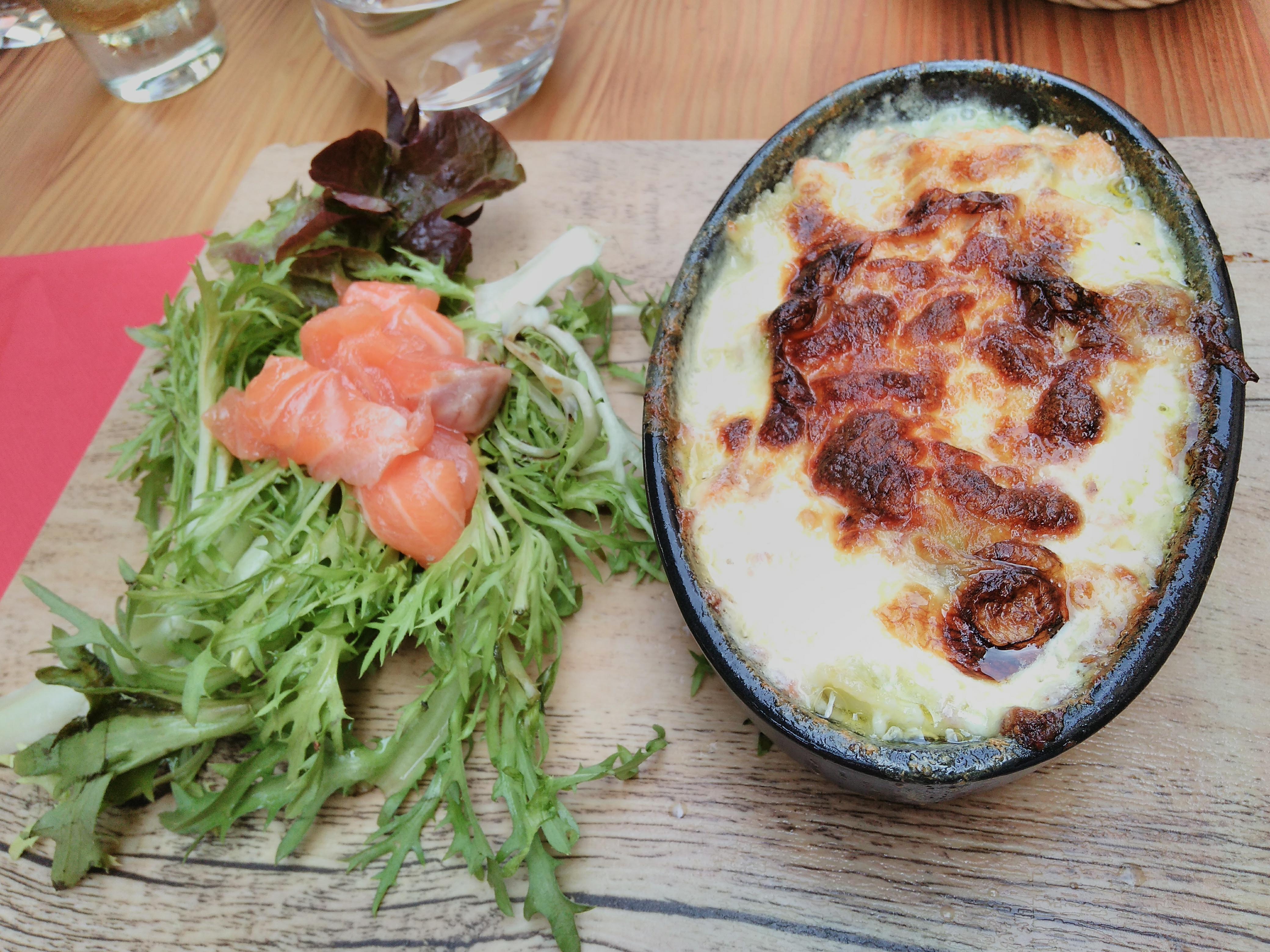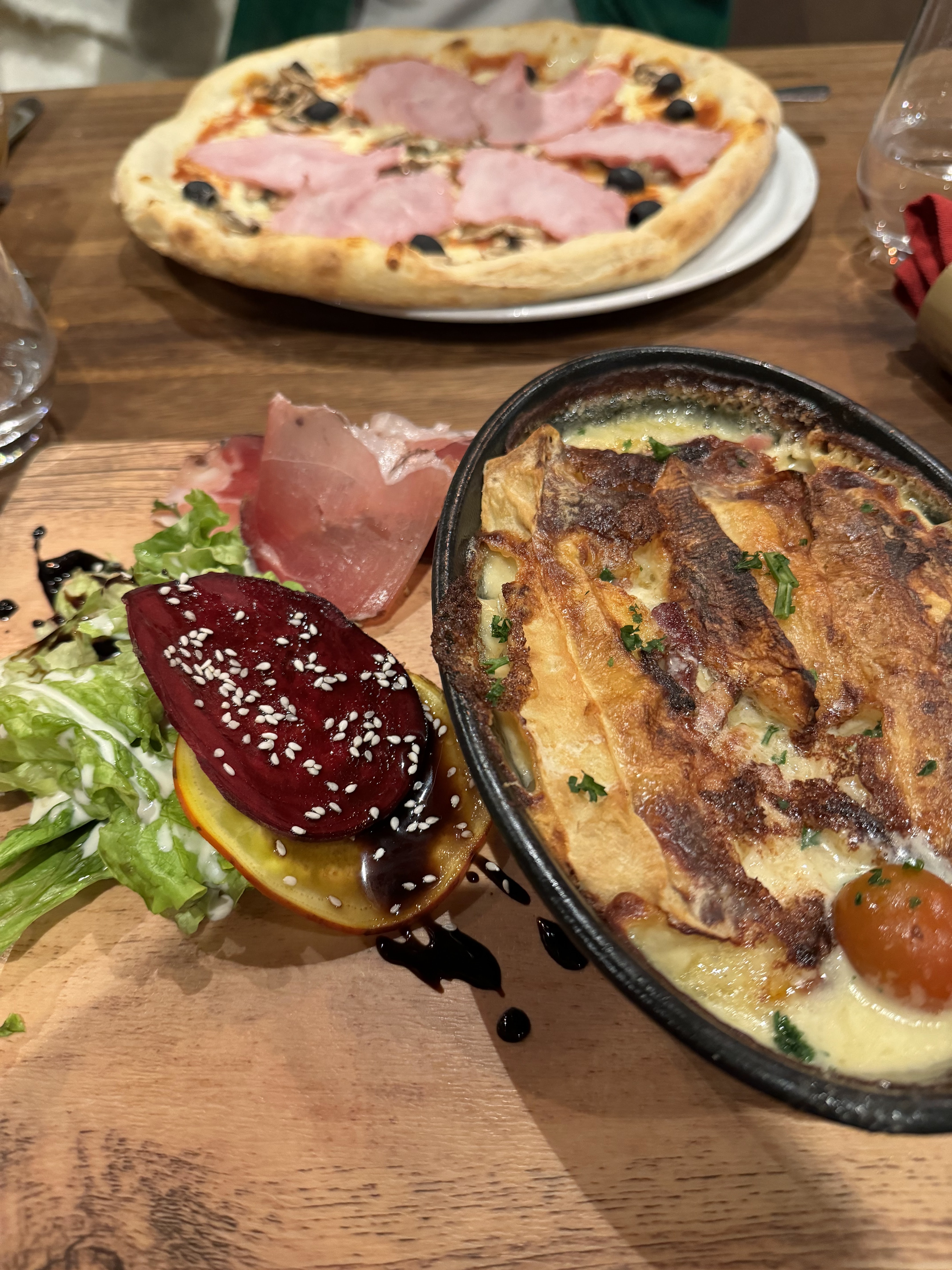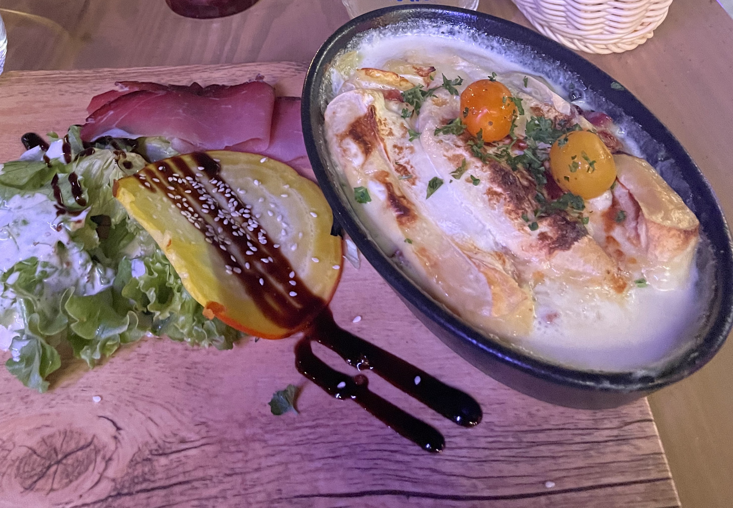 Nous avons pris une croziflette et une tartiflette… malheureusement beaucoup trop de crème. Ça baigner dans la crème… donc pas facile de sentir le goût du fromage et des cèpes. Cadre très sympathique cependant.