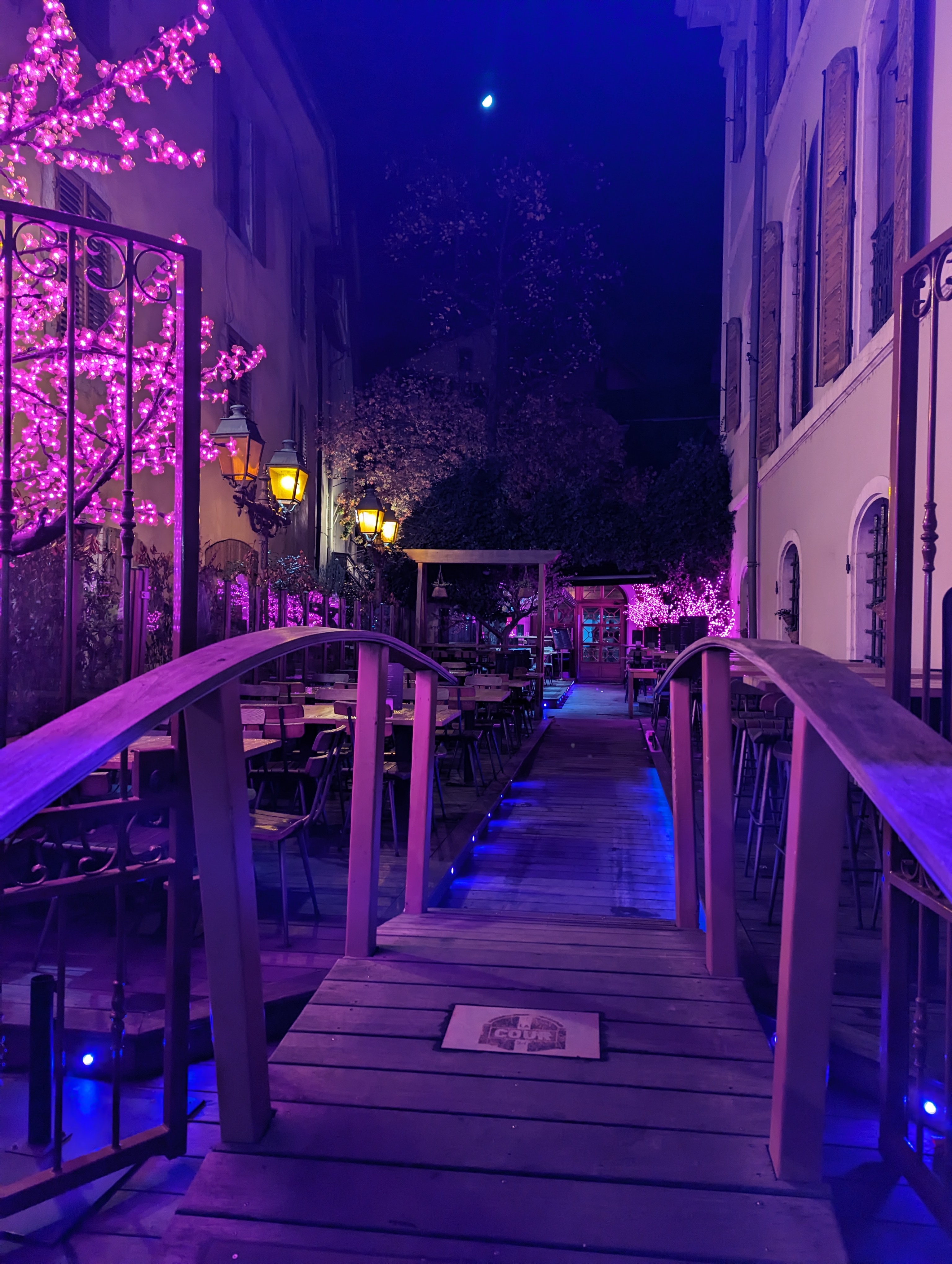 Nous cherchions un restaurant dans annecy qui n’étais pas un attrape touriste. Nous avons finis par tombé sur ce restaurant et avons trouvé le cadre magnifique. C’est un très bel endroit, qui serait parfait pour un dîner romantique. Nous avons mangé des poké bol, ils étaient très bon et j’ai pu ramener le miens dans une boîte car c’était trop copieux. Ensuite nous avons prix le dessert au citron qui était également très bon. Les prix ne m’ont pas paru exorbitant nous restons à Annecy dans une rue passante alors on s’en doute bien évidemment. Les serveurs était très agréable, ils nous ont trouvé une table sans réservation à 21h. En revanche ce que je pense être le responsable du restaurant lui étais moins agréable et semblais tout aussi peu désagréable avec ces employés et les autres serveurs. Travaillant dans le métier cela m’a interloqué. J’ai presque eu de la peine pour eux. C’était très subtil mais il semblais extrêmement directif.