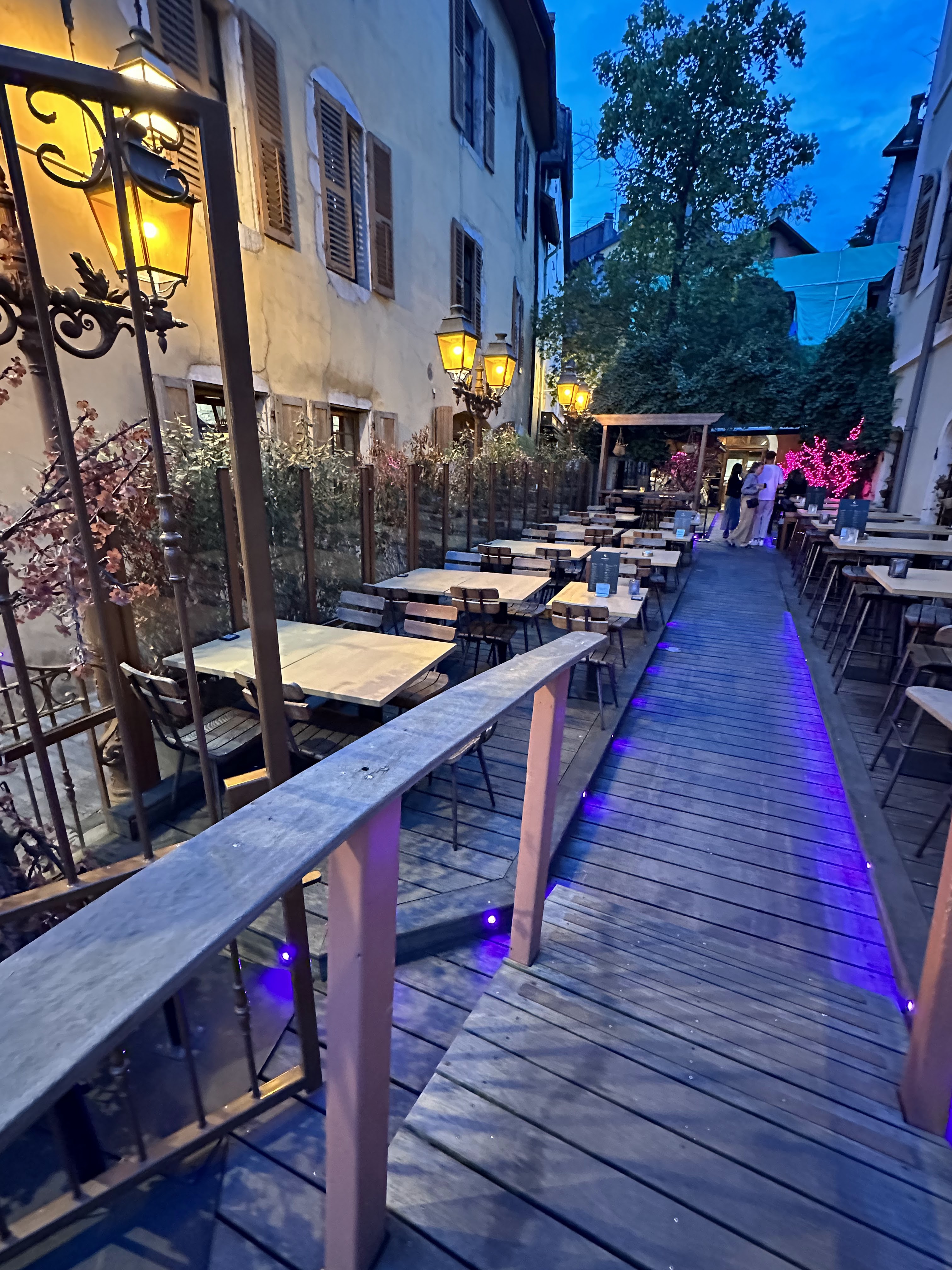 Cadre magnifique on y mange vraiment bien, restaurant situé face au thiou beaucoup de passage, mieux réserver car beaucoup de monde Le personnel est souriant accueillant et sympathique Quand on va a Annecy c'est le restaurant où on réserve Top