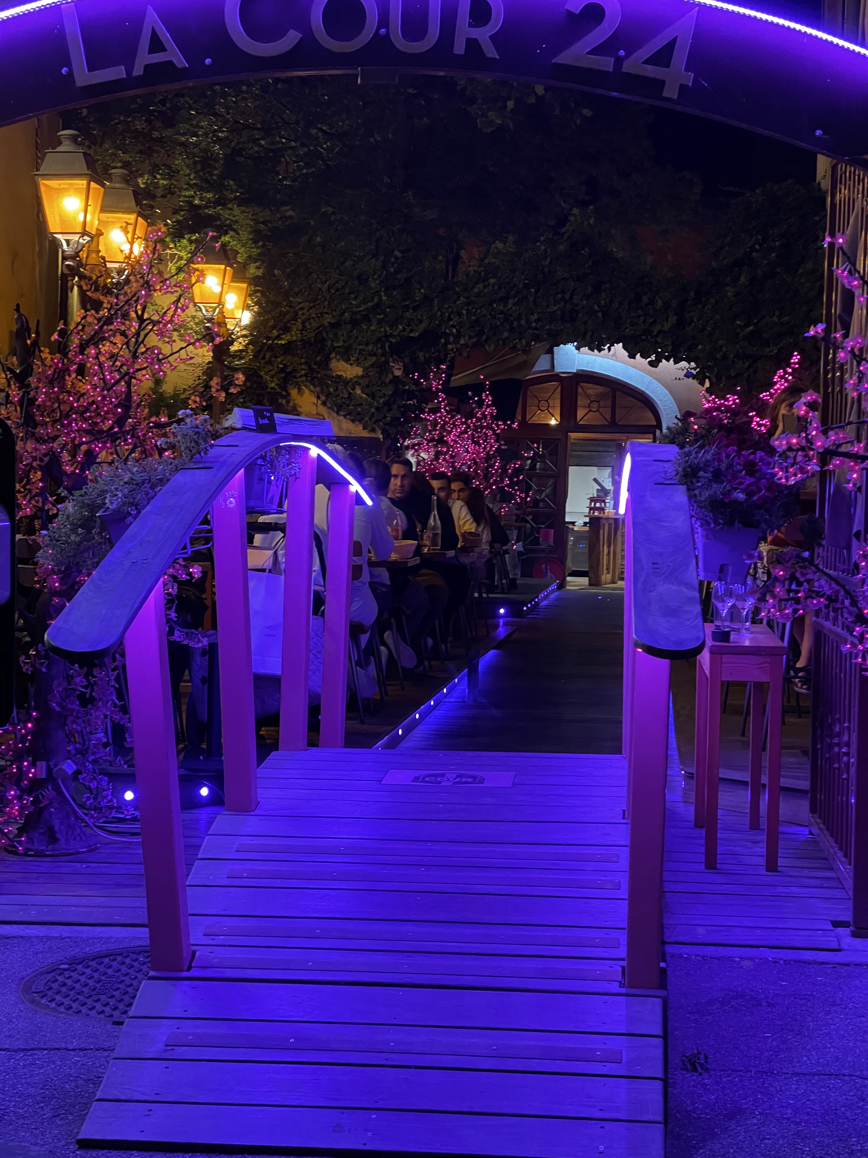 Très belle soirée la vie en rose à la Cour 24. Réservation personnalisée avec le prénom de mon mari sur la table (on est fan). Service très aimable. Dans l'assiette, c'est savoureux et généreux. Cour très agréable et décoration soignée avec les cerisiers roses éclairés qui rendent l'ambiance très romantique.