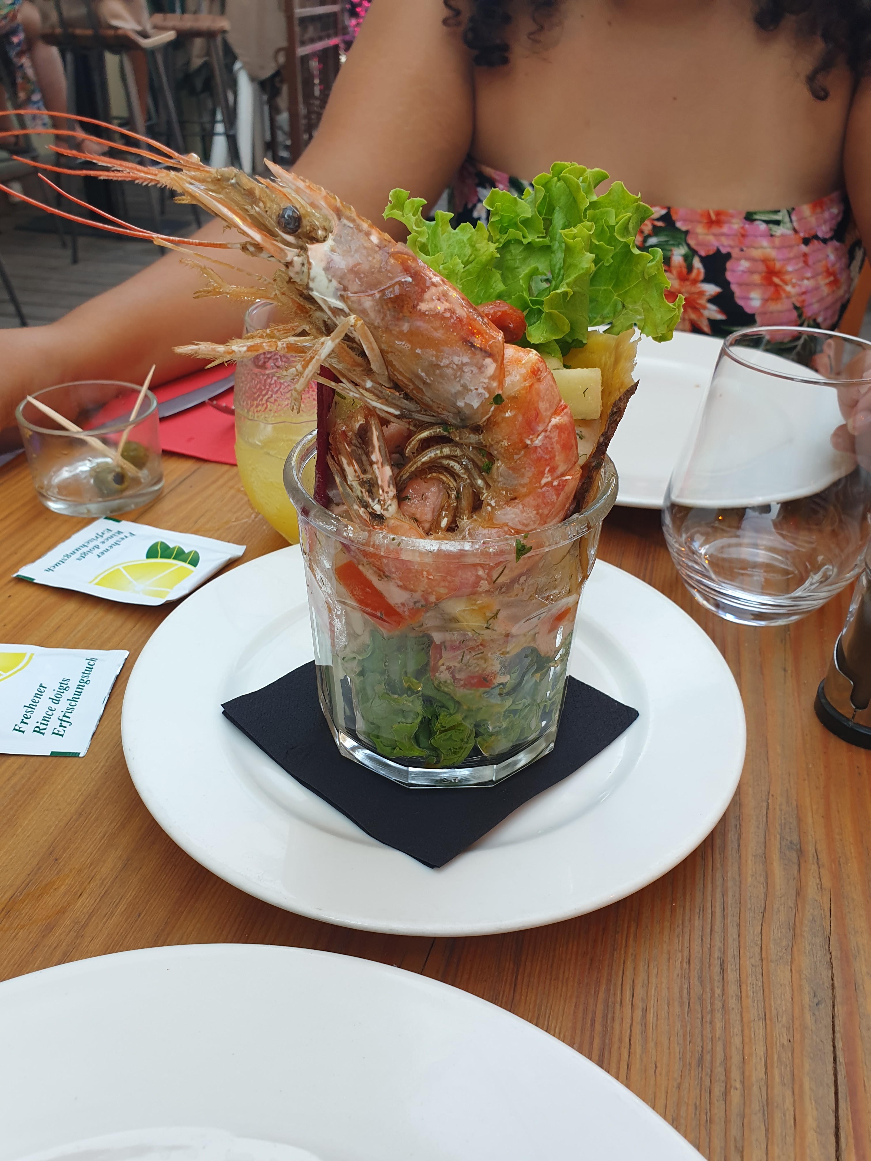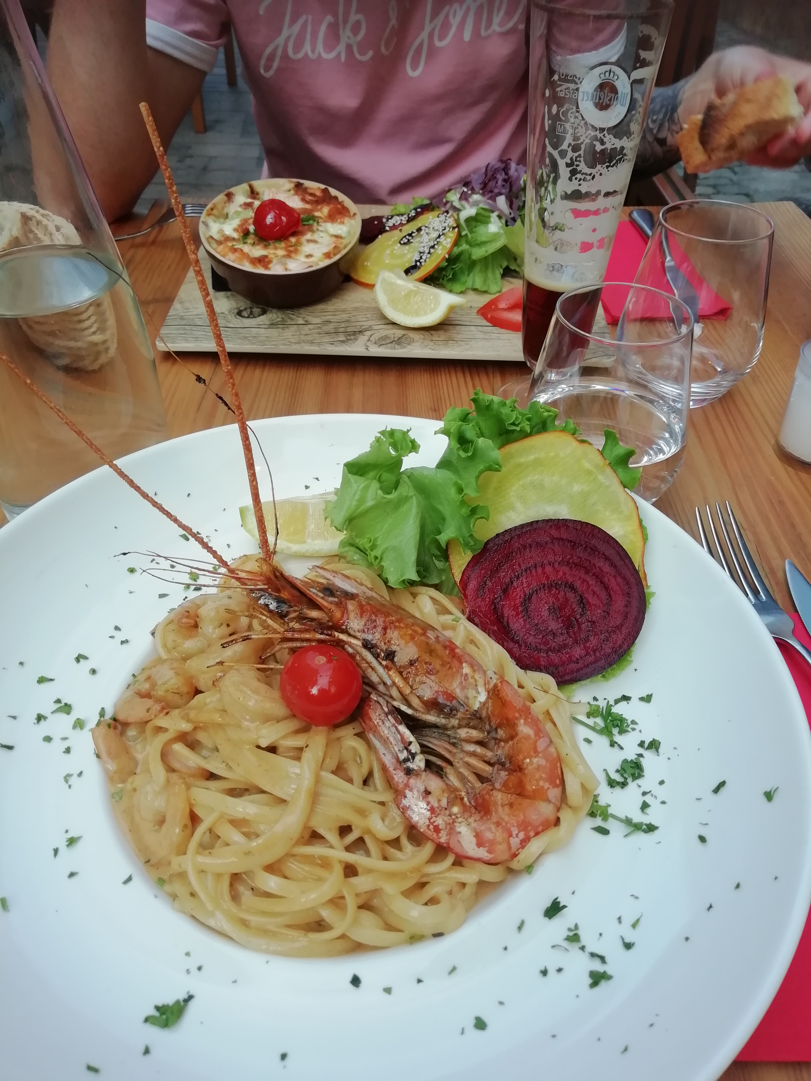 J'ai pris des linguines gambas j'ai eu une gambas entière et le reste des crevettes. Mon conjoint a pris des ravioles au saumon il est resté sur sa faim et en plus elles étaient sèches. A l'apéritif toutes les autres tables ont eu des olives et nous rien. Nous avons pris une bouteille de vin blanc très bon. Du coup nous sommes allés prendre le dessert ailleurs car globalement déçu. Le serveur pas agréable attente très longue