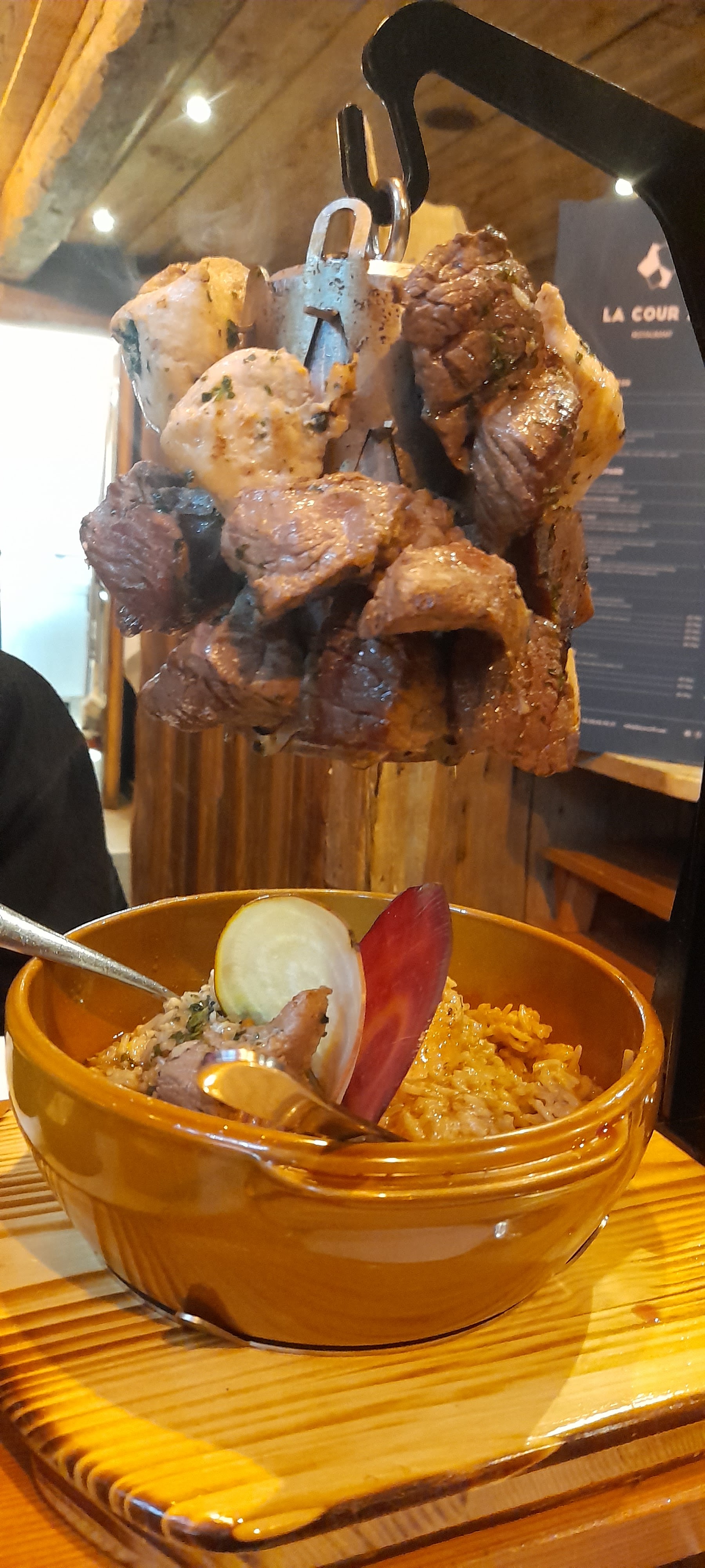 Séduite par la façade du restaurant qui est quand même très attrayante, je décide de dîner ici. Je commande une Potence de Viandes (poulet, veau, bœuf) servie avec du riz crémeux aux champignons. Le riz était excellent, cependant, la viande était soit pas très cuite, soit trop cuite et difficile à mâcher. Je donne un 3* Parceque le gérant nous a fait un geste sur la note, très appréciable.