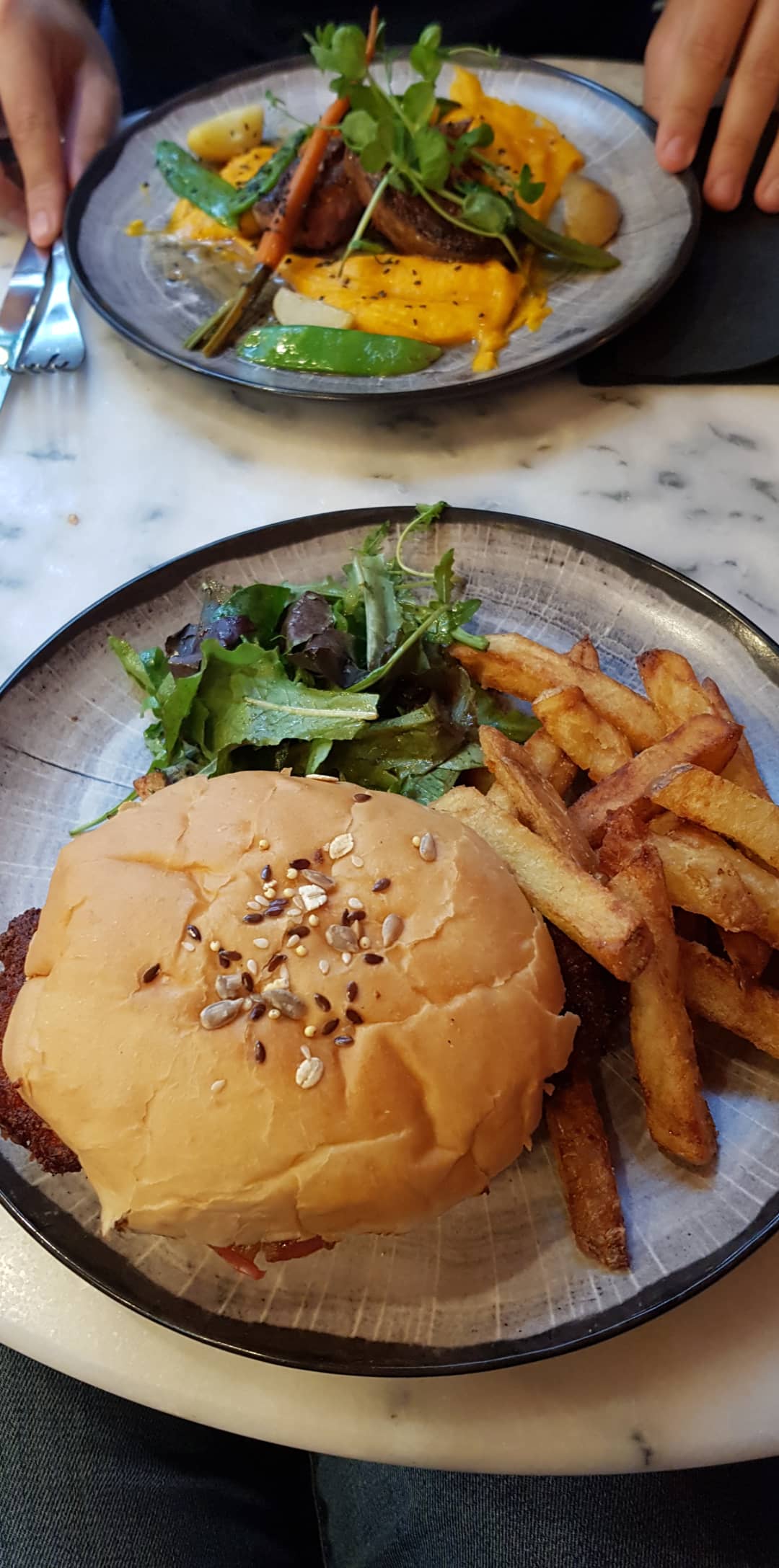 Des amis nous ont suggéré ce restaurant qu'ils aiment beaucoup, et nous n'avons pas été déçus ! Une carte qui faisait très envie. Une entrecôte et des frites de patates douces très bonnes. J'ai aussi testé le burger végé ! Un régal ! Et poussette friendly ! L'ambiance et la déco sont aussi agréables que le service ! 👏