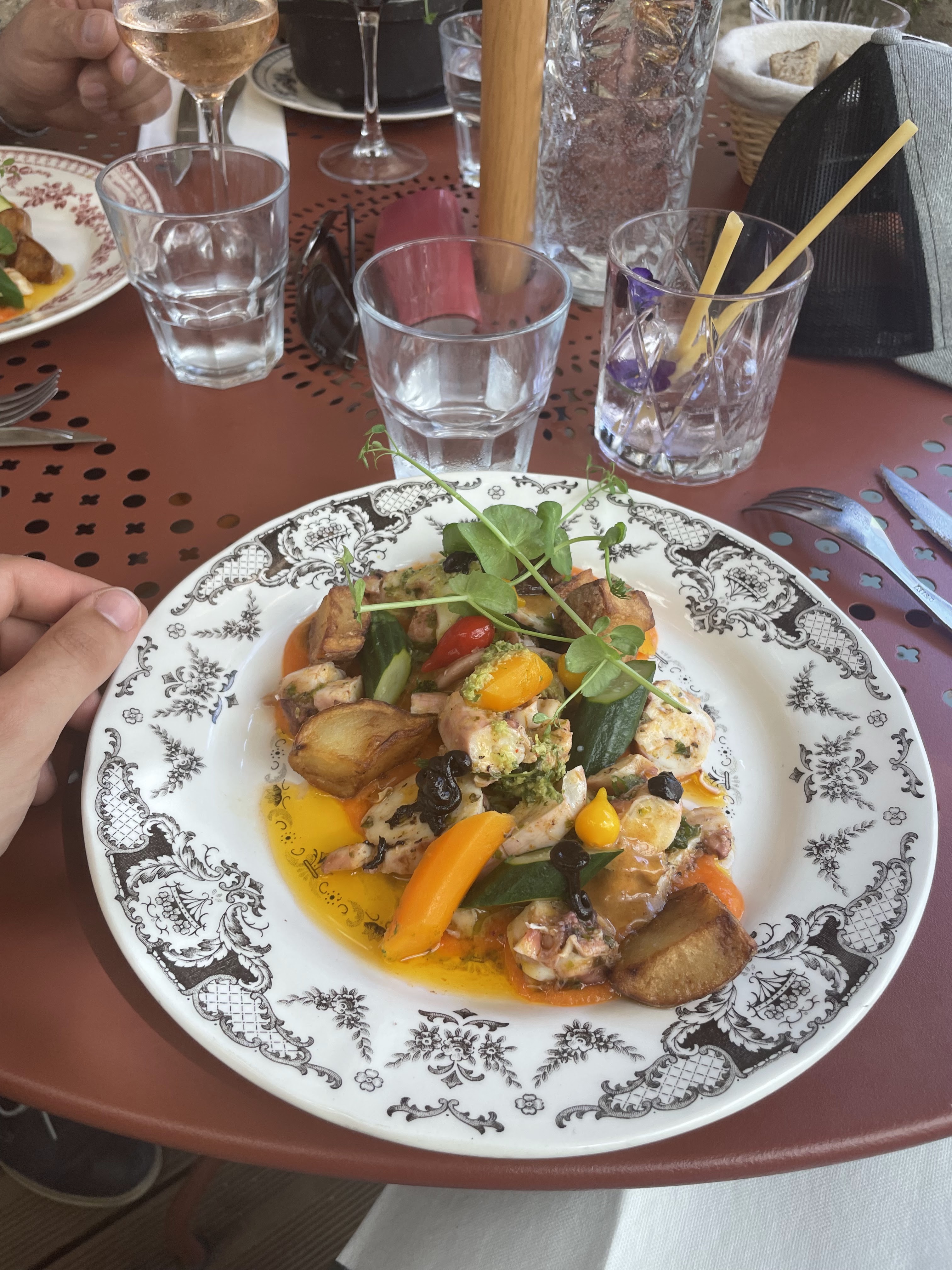 Cadre sympa mais très déçu de la proportion des assiettes, 2 petites pommes grenailles dans l’assiette et très peu de légumes, très cher pour la quantité, un cocktail + un plat + un dessert avec une figue et une petite boule de glace et un café le tout pour une modique somme de 41 euros !!! Rapport qualité prix non conseillé