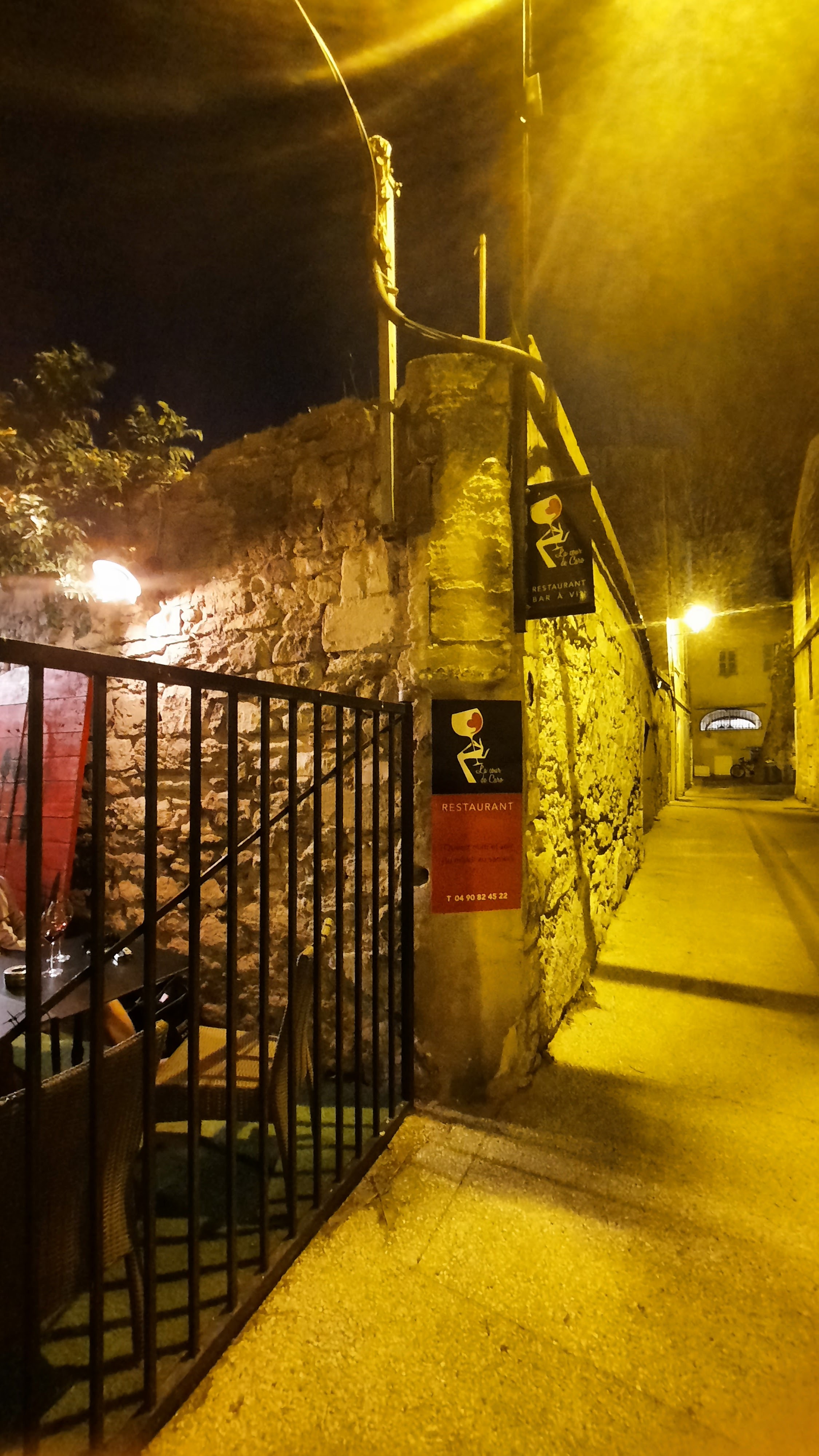 La Cour de Caro ne paye pas de mine quand on se pointe vers 19h30 et que le restaurant est vide mais l’accueil du patron en cuisine devant lequel on passe en entrant et de la patronne sont très sympathiques. La salle comme la petite terrasse ombragée ont du charme et la carte est limitée. Le caviar d’aubergines est délicieux mais servi moulée dans un ramequin rond ne lui donne pas meilleure allure - à revoir vite la présentation ! S’en suit un steak tartare et un filet de poisson à l’huile d’Olive vierge. C’est bon mais ça manque un peu de saveur, il faudrait améliorer tout ça pour rendre l’endroit vraiment plaisant. Le vin était bon en bouteille de 50cl. Rapport qualité prix correct, présente l’avantage d’être au calme après une journée chargée au festival.