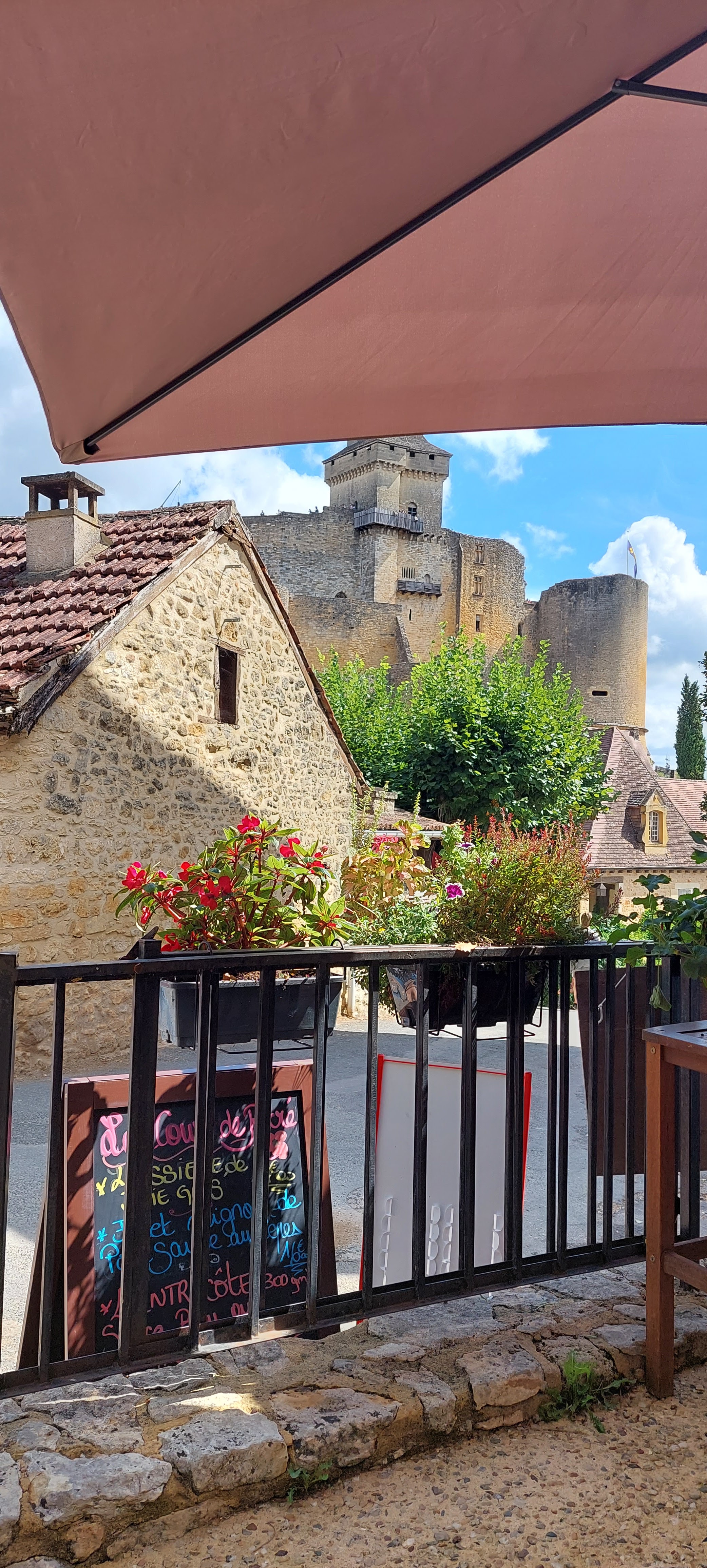 Arrivé en premier pour le service du midi. Serveuse souriante et accueillante qui nous a place à la meilleure table ( magnifique vue sur le château ) Ensuite nous avons mangé une véritable cuisine du coin avec une très bonne salade perigourdine. Et un gâteaux aux noix au top