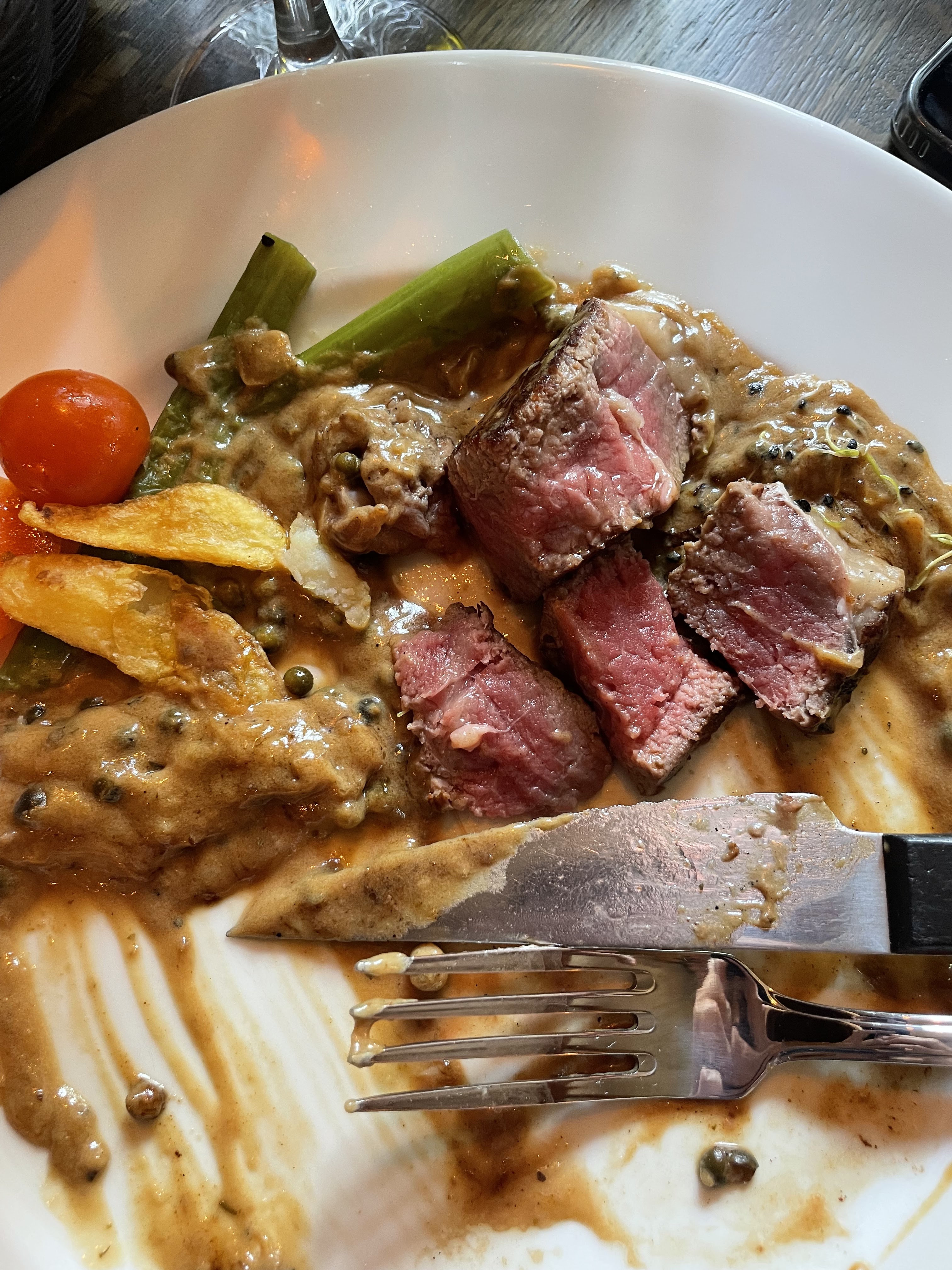 C'est la première fois de ma vie que je mange un filet de bœuf avec des nerf à l'intérieur bizarre, la sauce aux girolles avec trois girolles dedans les pommes de terre sautées on se demandait si elle n'était pas de la veille ou du service du midi en tout cas ça ça n'avait pas le goût de la pomme de terre sautées fraîche leur choucroute est très très mais très acide dommage pour nous on n'a pas passé un super moment
