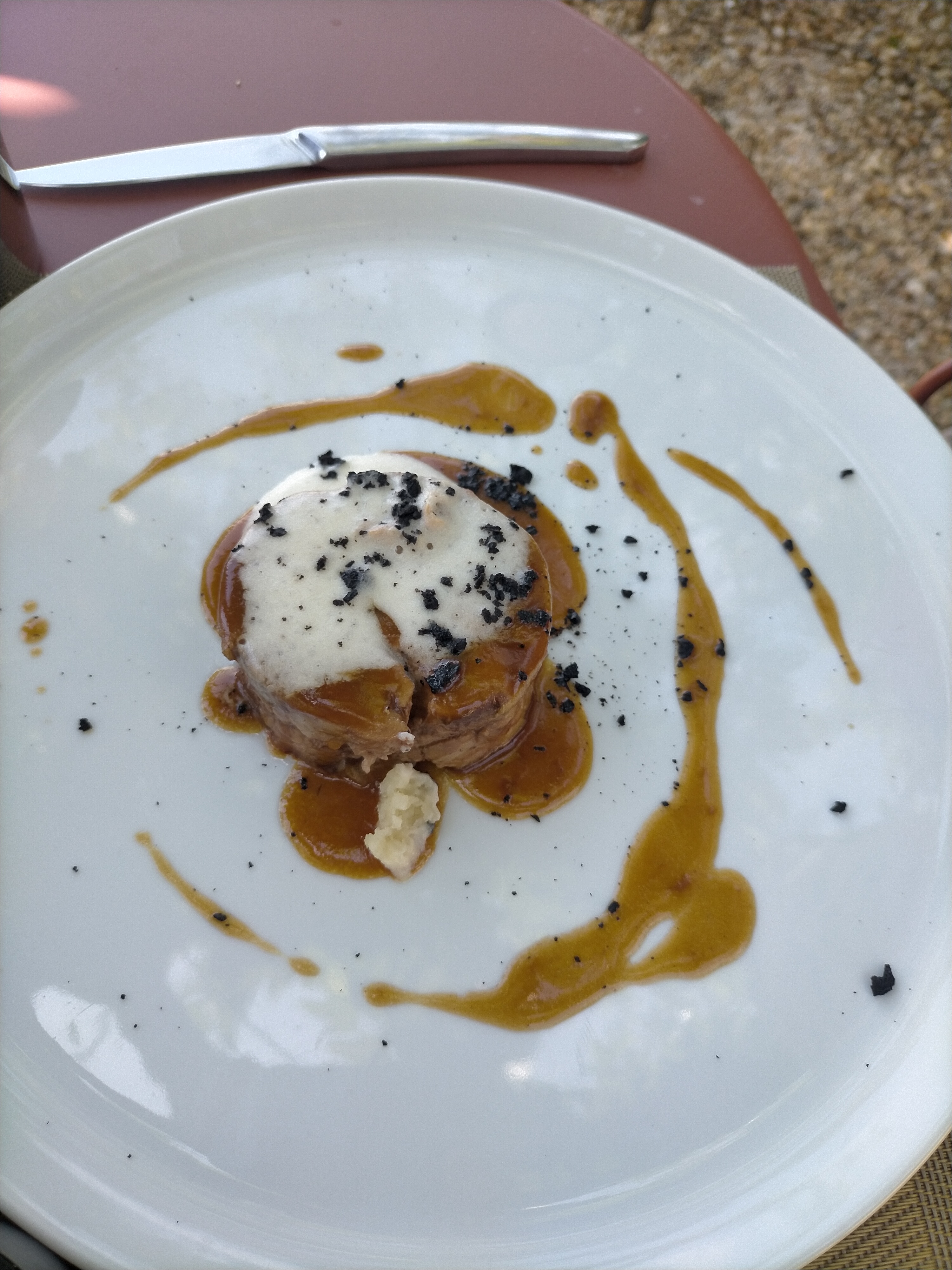 Tout d’abord, le lieu est très agréable agréable et la bâtisse particulièrement bien rénovée, et nous avons apprécié le moment passé dans la cour du château à l’occasion de l’anniversaire de mon épouse . Le service aussi agréable mais avec quelques bémols. Un des serveurs qui parle uniquement anglais, ce qui n’est pas un problème pour nous mais qui peut l’être pour certaine personnes …. Mais ce qui est un peu c’est qu’il a fallu régulièrement appeler pour demander du vin, du pain, le supplément fromage… Personne ne vient vous le proposer et c’est bien dommage. Mais là où il y a le plus de progrès à faire c’est pour u niveau de la cuisine. Un gaspacho de tomate en amuse-bouche sans aucun assaisonnement, une entrée, truite fumée ou la quantité est vraiment très juste (bien pour un repas en 5 ou 7 services ce qui ne n’est pas le cas ici) et qui manque aussi cruellement d’assaisonnement. Mon plat une selle d’agneau , purée d’olive et crème d’ail ne correspond malheureusement pas à son intitulé … un tout petit bout de selle, très bonne au demeurant, avec … une côte d’agneau … bonne aussi mais ce n’est pas ce qu’on attend lorsque l’on commande de la selle … et la crème d’ail est quasiment inexistante dans l’assiette. Le dessert, déclinaison de pêche n’était pas vraiment à mon goût mais à le mérite d’être bien exécuté et de proposer quelque-chose d’original avec des spaghettis à l’hibiscus. Les plats de mon épouse étaient eux un peu plus réussis avec une salade de petit épeautre et œuf parfait plutôt agréable (malgré la aussi un assaisonnement un peu léger), un rouget/ratatouille avec une très bonne sauce aux arêtes et un dessert au chocolat classique mais assez bon. A 48 euros pour entrée/plat/dessert et 58 euros avec le fromage, ça rend la proposition un peu chère et presque «prétentieuse » , en tous cas pas à la hauteur de ce qu’on attend pour un menu à ce prix là .