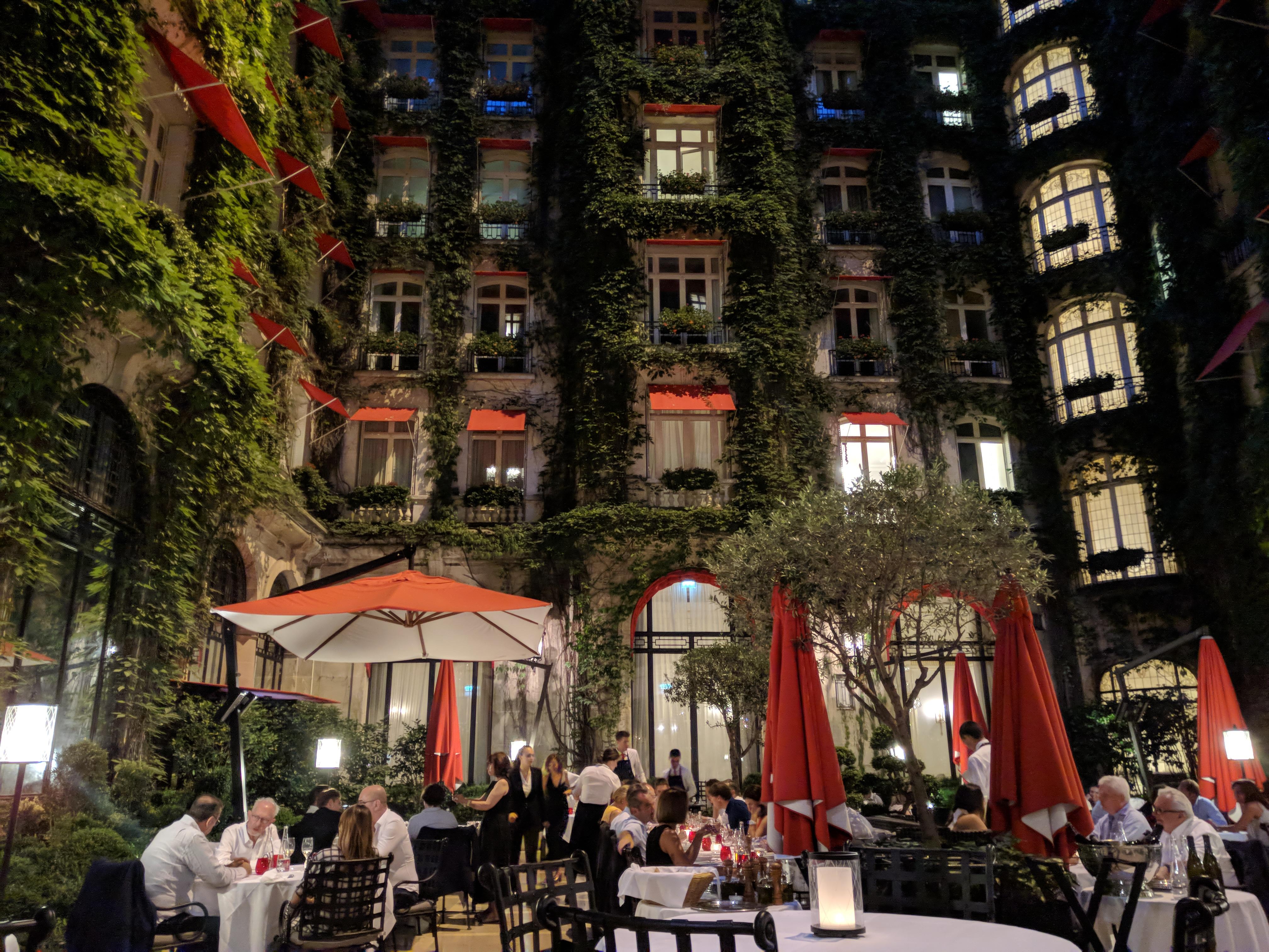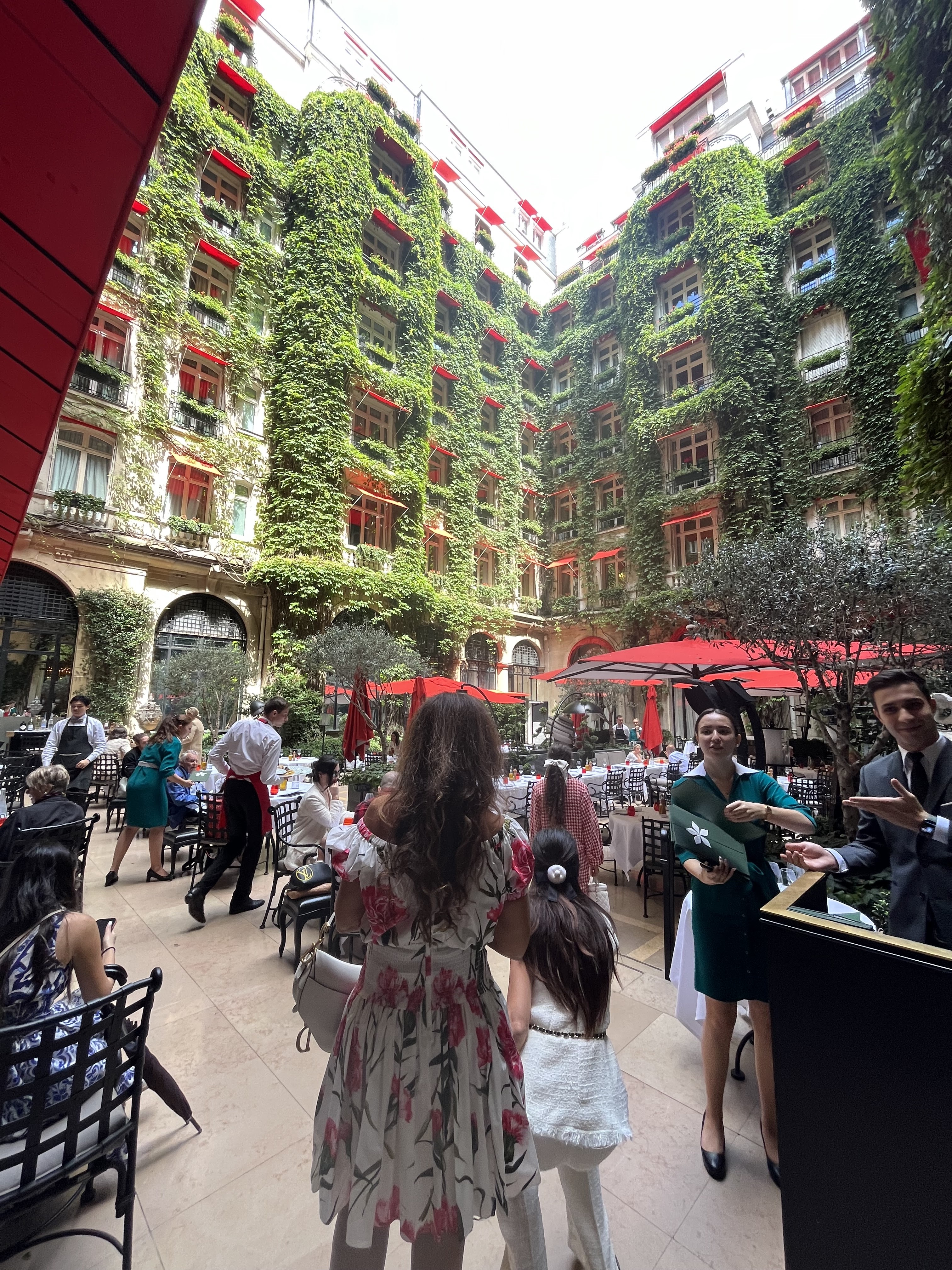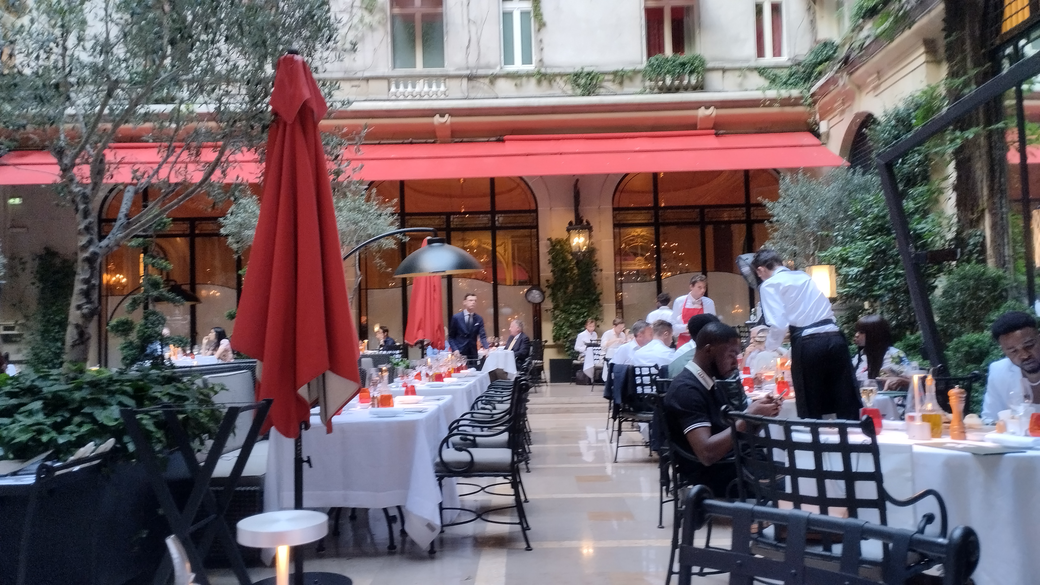 Cadre très agréable, authentique, atypique, calme pour déjeuner et passer un moment en toute tranquillité. Le personnel est attentif et aux petits soins avec vous. Bémol principal, le coût de chaque plat par rapport à l'assiette. Le Tartare de thon préparé à la minute devant nous était très bon, mais ne valait pas à mon sens 42€. De même pour le poisson Saint-Pierre de madame à 78€. Les plats sont bons mais aucun signe distinctif pour les sublimer d'une façon à correspondre avec le cadre exterieur ou la renommée du Plazza Athénée. Facture à 240€ pour une entrée à partager, 2 plats et 2 verres de vins. A ce prix là nous pouvons faire un étoilé en menu unique à 5 ou 7 services. Content d'avoir essayé le lieux cependant car expérience sympathique pour le cadre et nous sommes tout de même sorti de table l'estomac plein.