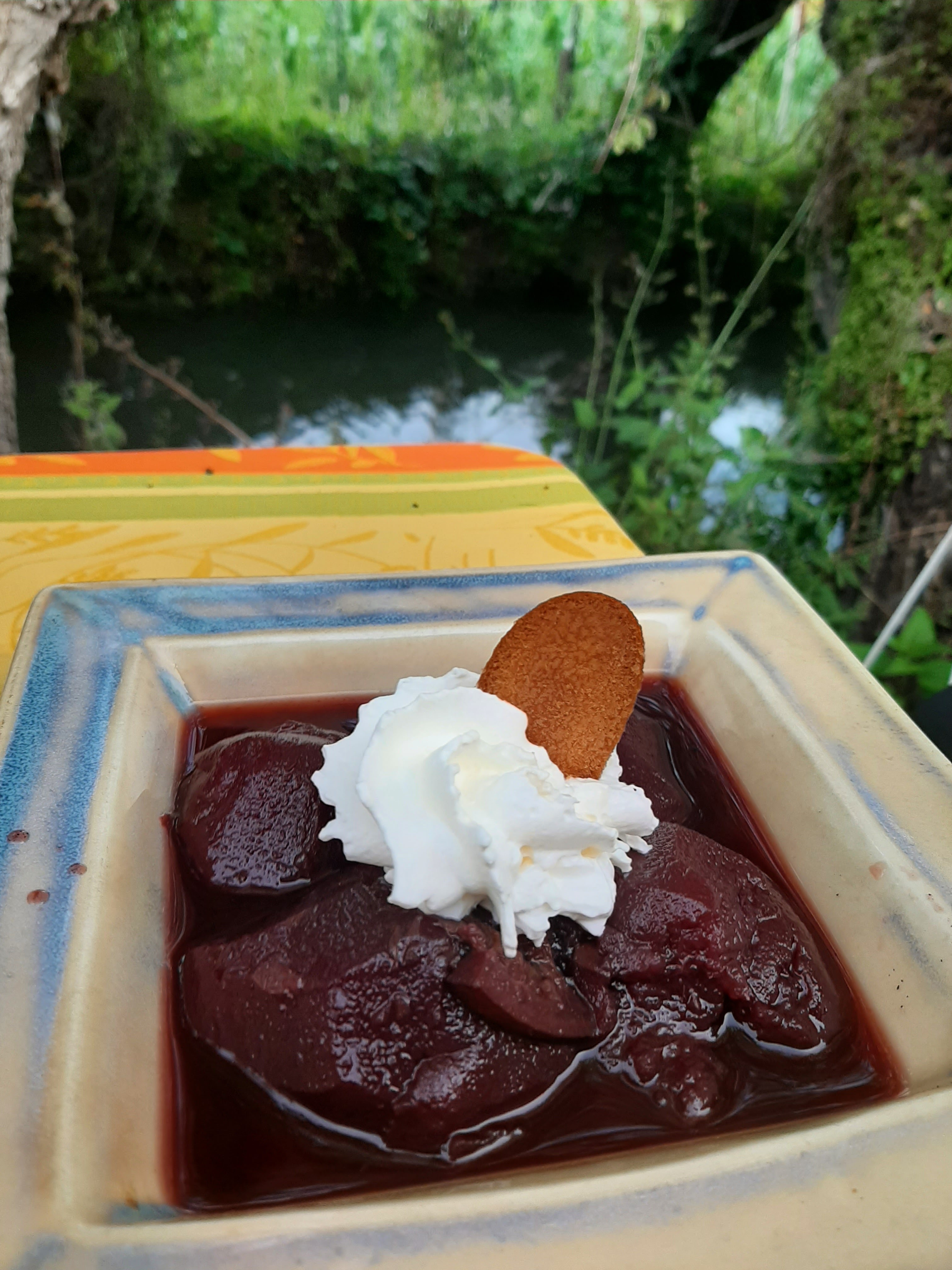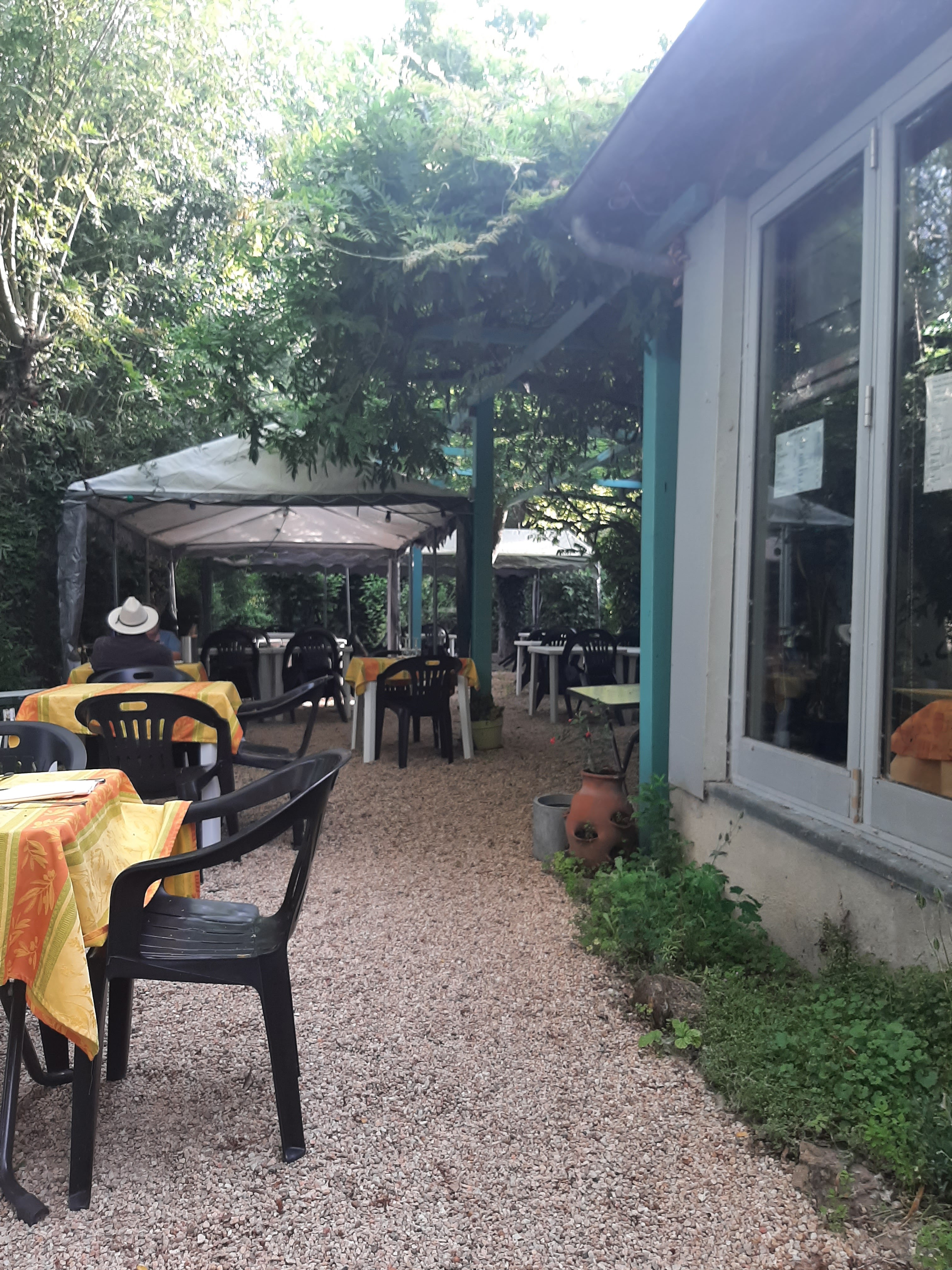 agréable terrasse le long d'un ruisseau ombragé, peuplé de poissons et de canards. Bonne cuisine. En dessert, les pruneaux étaient copieux et excellents, préférable à la tarte Tatin. Attention, le Coca est servi au verre, sans glaçon ni tranche de citron. Un lieu idéal pour passer un bon moment dans la tranquillité et la verdure