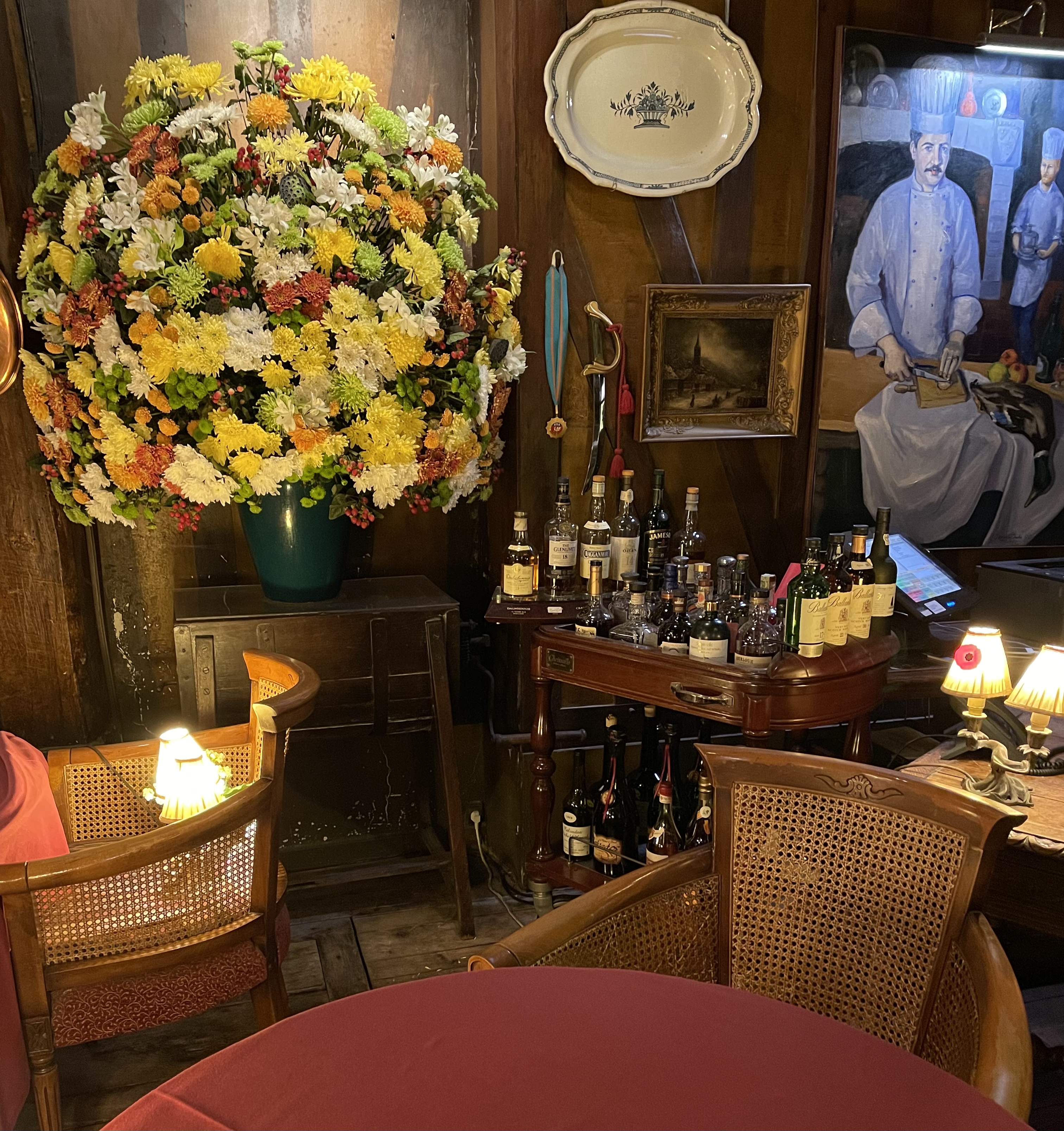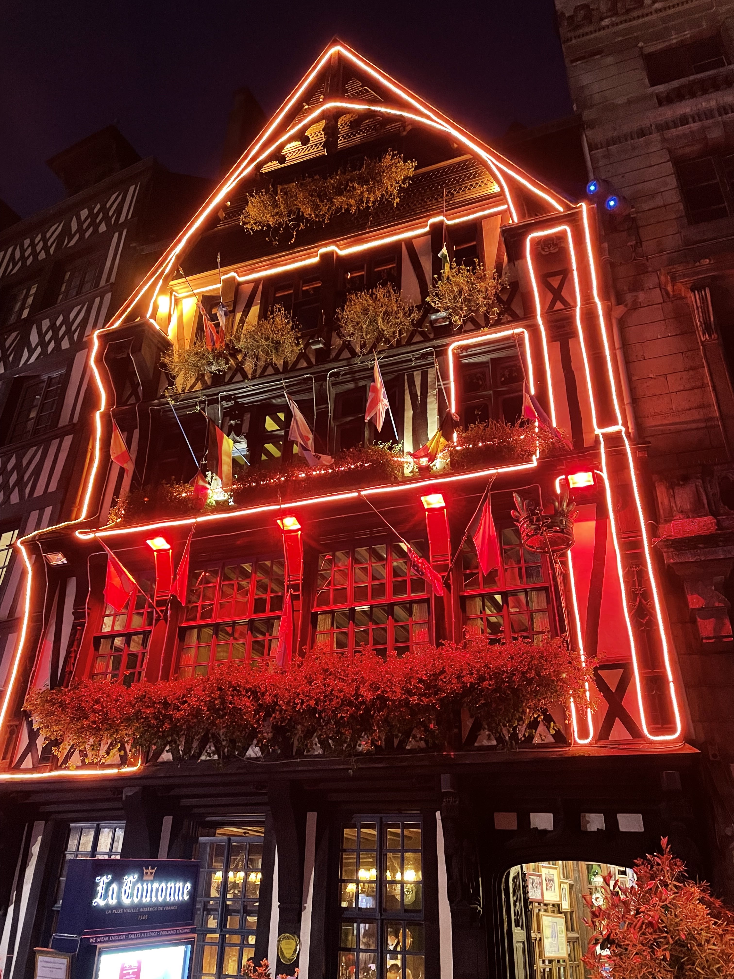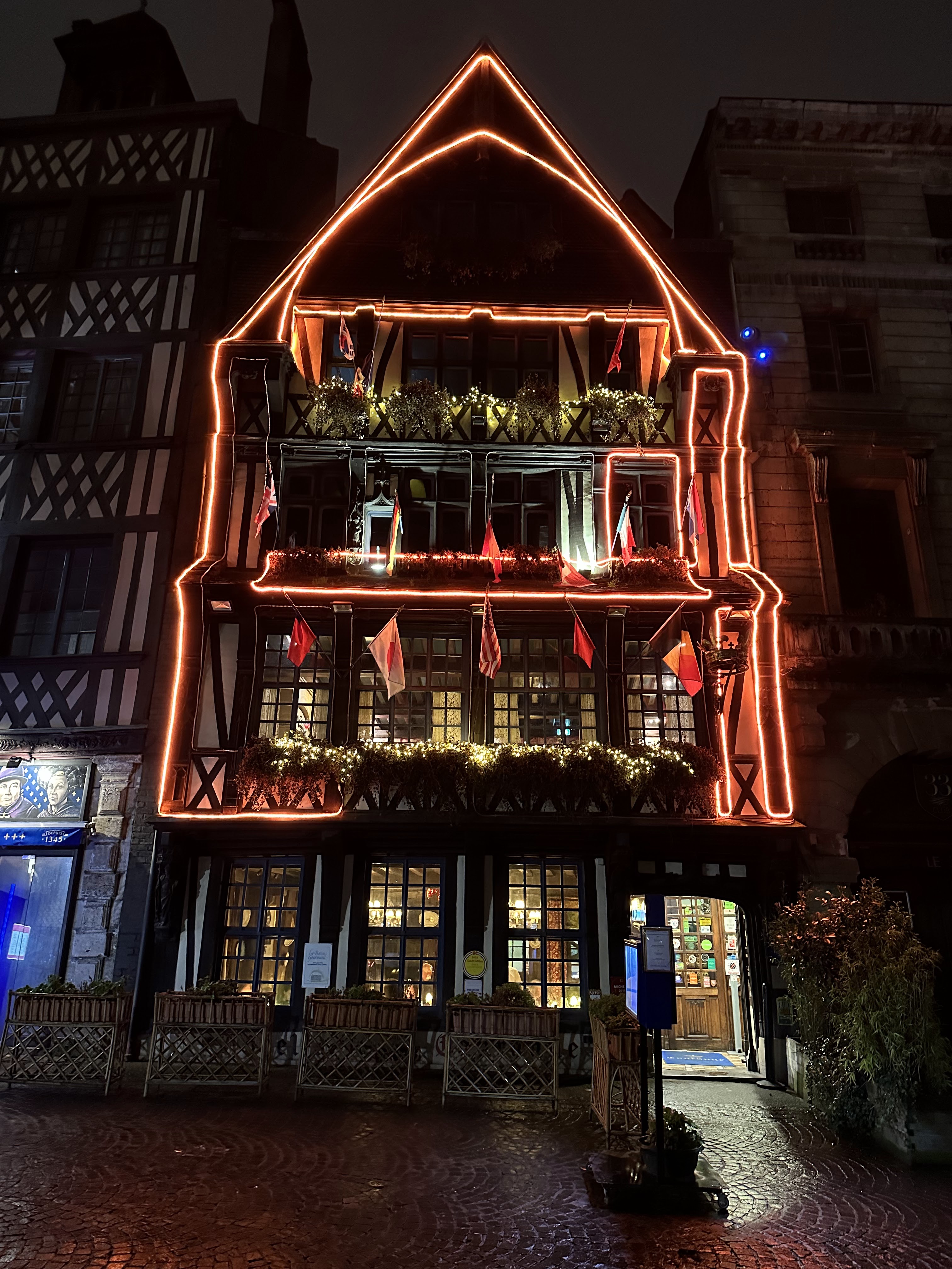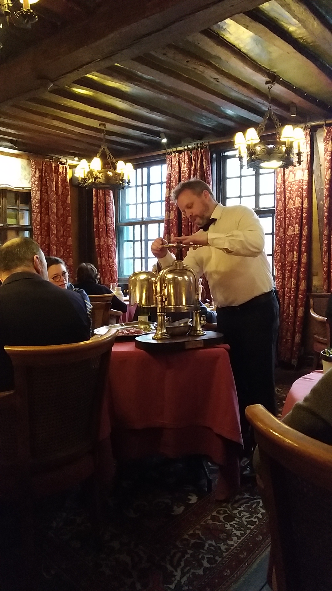 restaurant le plus vieux de France, si je ne me trompe pas de l'an 1345, c'est à tenter, ce n'est pas aussi excessif que nous pourrions imaginer menu à partir de 38€, ils ont une spécialité que j'ai préférée voir sur la table du voisin le canard Rouennais à la presse, je vous laisse découvrir, soirée romantique assurée, à conseiller !!!