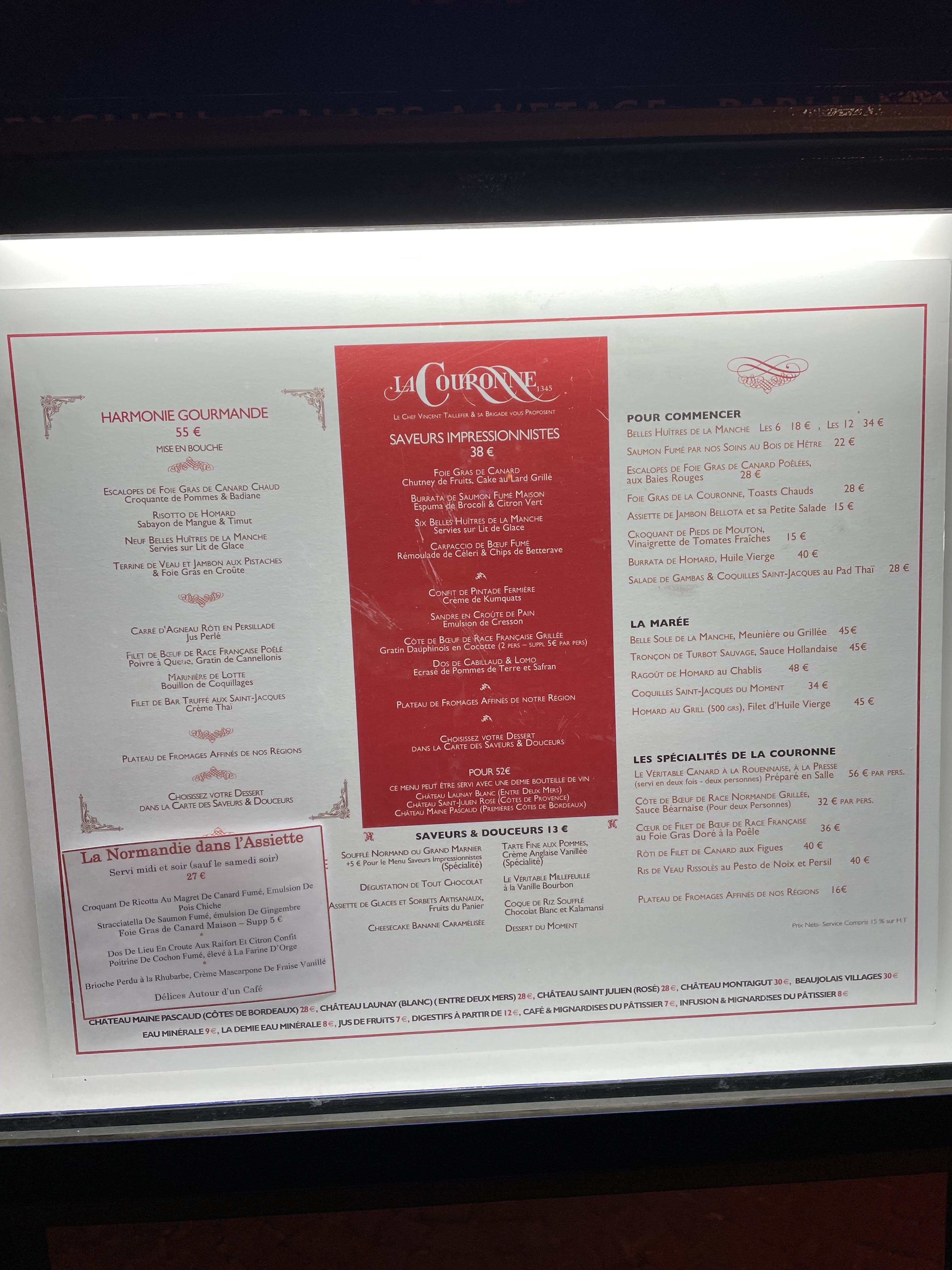 Nous sommes le 2 avril, le jour de l’anniversaire de mon mari. Nous souhaitons découvrir le restaurant la couronne car nous avons entendu que de bons commentaires Nous décidons de réserver. Nous sommes quatre ce soir. Là nous arrivons dans le restaurant, typiquement normand très chaleureux et agréable. Nous découvrons que plusieurs artistes sont venus découvrir cette très ancienne auberge en entrée, nous avons choisi le foie gras ainsi que les huîtres très bien servi les places en généreux très frais. Ensuite nous avons pris le rôti Danio, Et le poisson tout était délicieux. Les légumes était cuit Parfaitement bien le la petite purée de carotte Était du velours délicieux, nous avons pris en dessert la tarte aux pommes ainsi que le fameux millefeuille L’ambiance était au rendez-vous. Le serveur était à l’écoute. Patient souriant agréable je vous recommande le serveur. (Alain.) Des prix raisonnables pour une qualité de produits, ainsi qu’un bel endroit pour passer un bon moment entre amis, entre amoureux etc. je recommande vivement et fortement ce restaurant
