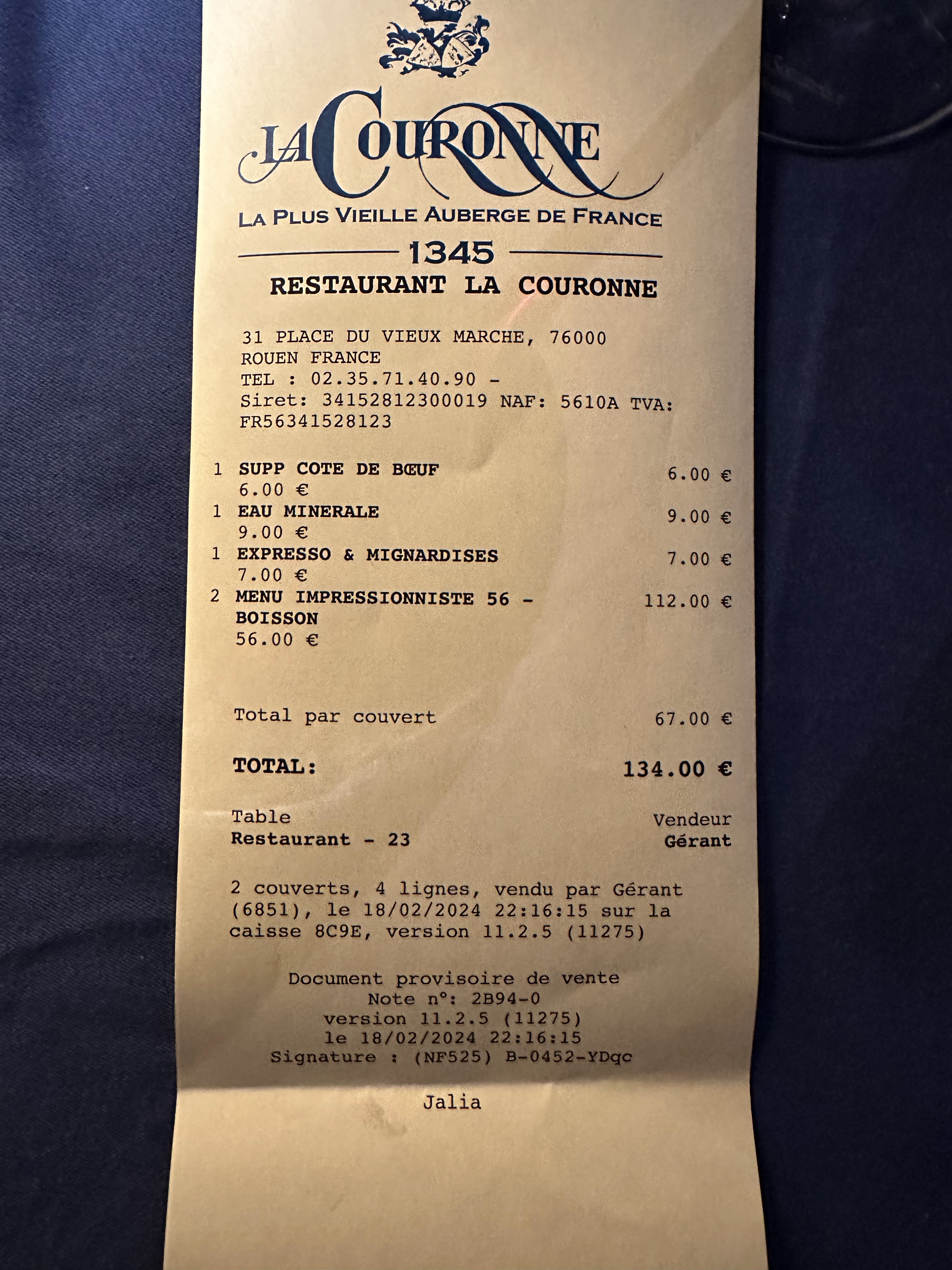 A l’occasion d’un week-end à Rouen, passage dans le restaurant La Couronne juste avant de partir. Le service est top, les serveurs sont à l’écoute et très gentils. La nourriture est bonne et le cadre est vraiment atypique qui change de nos habitudes ! Je recommande.