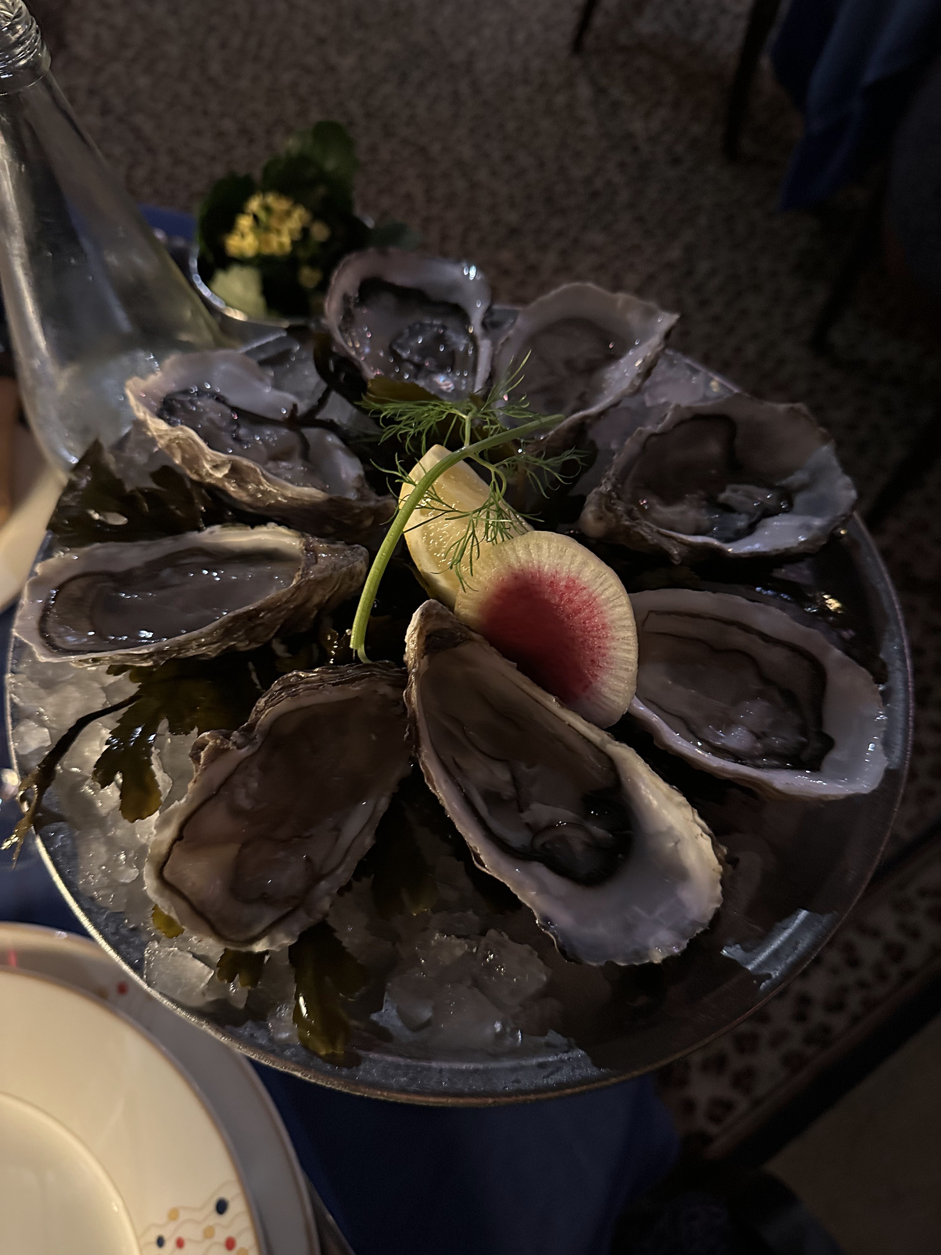Comme c'est le cas dans de nombreux restaurants de nos jours, il n'y a pas assez de serveurs pour le nombre de tables. Il nous a fallu 40 minutes pour prendre un verre d'eau et une bouteille de vin. Pour gagner du « temps », le pain attendait déjà à table à notre arrivée. Ce restaurant vit de sa réputation de son passé glorieux. Une fois que la nourriture a commencé à arriver, les choses se sont beaucoup améliorées. Nous avons commencé avec des huîtres qui n'étaient pas aussi fraîches que celles que nous avions au marché local. Mais il faut s’y attendre. Le plateau de fromages était incomparable et vous pouviez en choisir autant que vous le souhaitiez. Mon partenaire a choisi le menu 59 e et j'ai choisi le menu 49 e. Mais le restaurant m'a surclassé au 59e et sélection de fromages. Ce qui compense le démarrage lent. Si vous aimez dîner dans un lieu chargé d'histoire, alors ceci est fait pour vous.