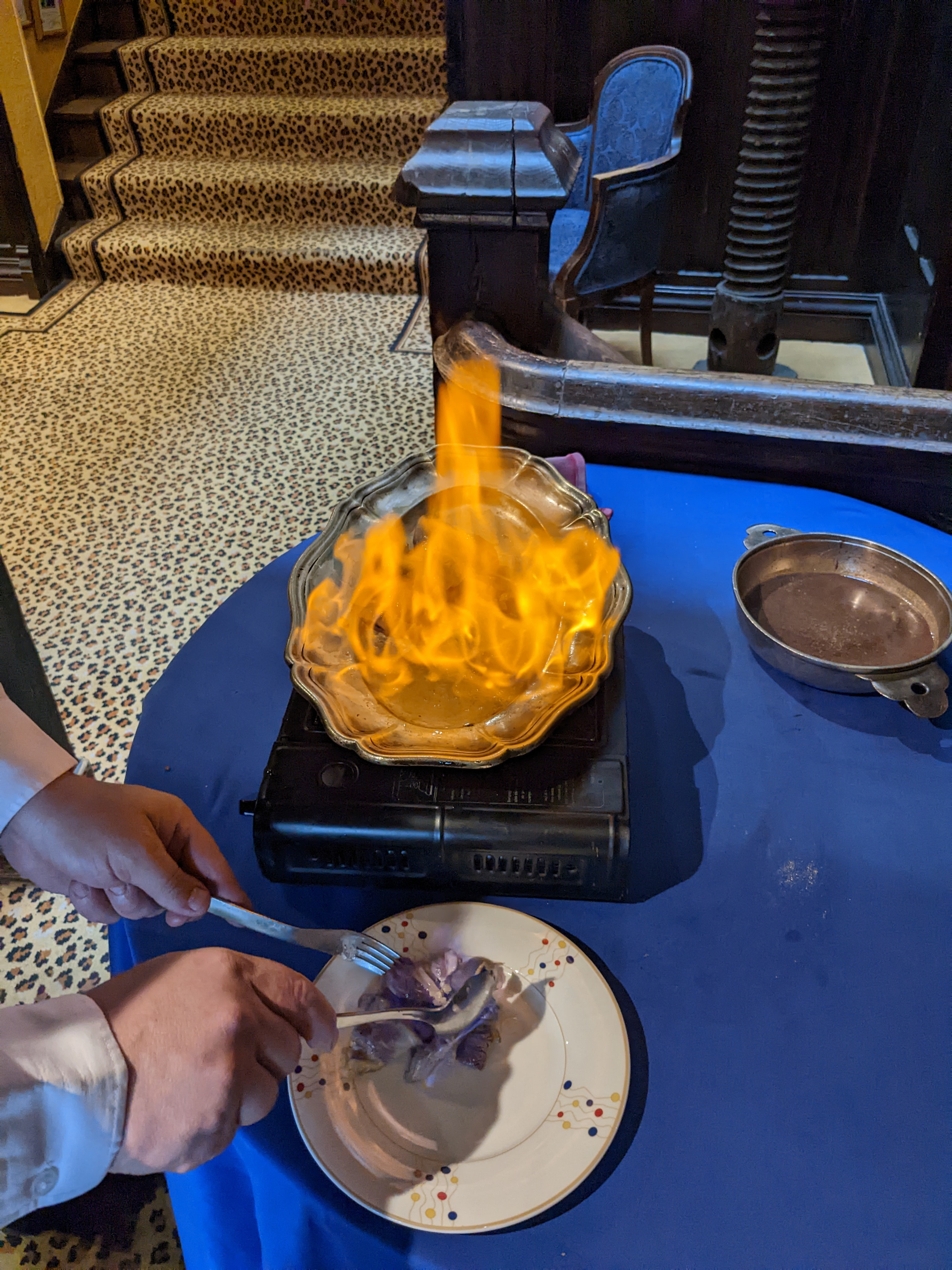Un établissement! La vie est trop courte pour ne pas ressentir le charme de ce bâtiment et de son personnel. Après être passé devant ce qui ressemble certainement à un piège à touristes de l'extérieur avec ses feux et drapeaux rouges, nous sommes finalement revenus et avons décidé que nous allions vivre l'aventure. Les surprises se sont succédées et nous nous souviendrons certainement de notre visite pendant des années. Prestation exemplaire ! Nous nous sommes sentis honorés d'être si bien pris en charge, nous sentant mal. La nourriture était vraiment délicieuse, nous étions très satisfaits de notre énorme steak et de nos desserts.