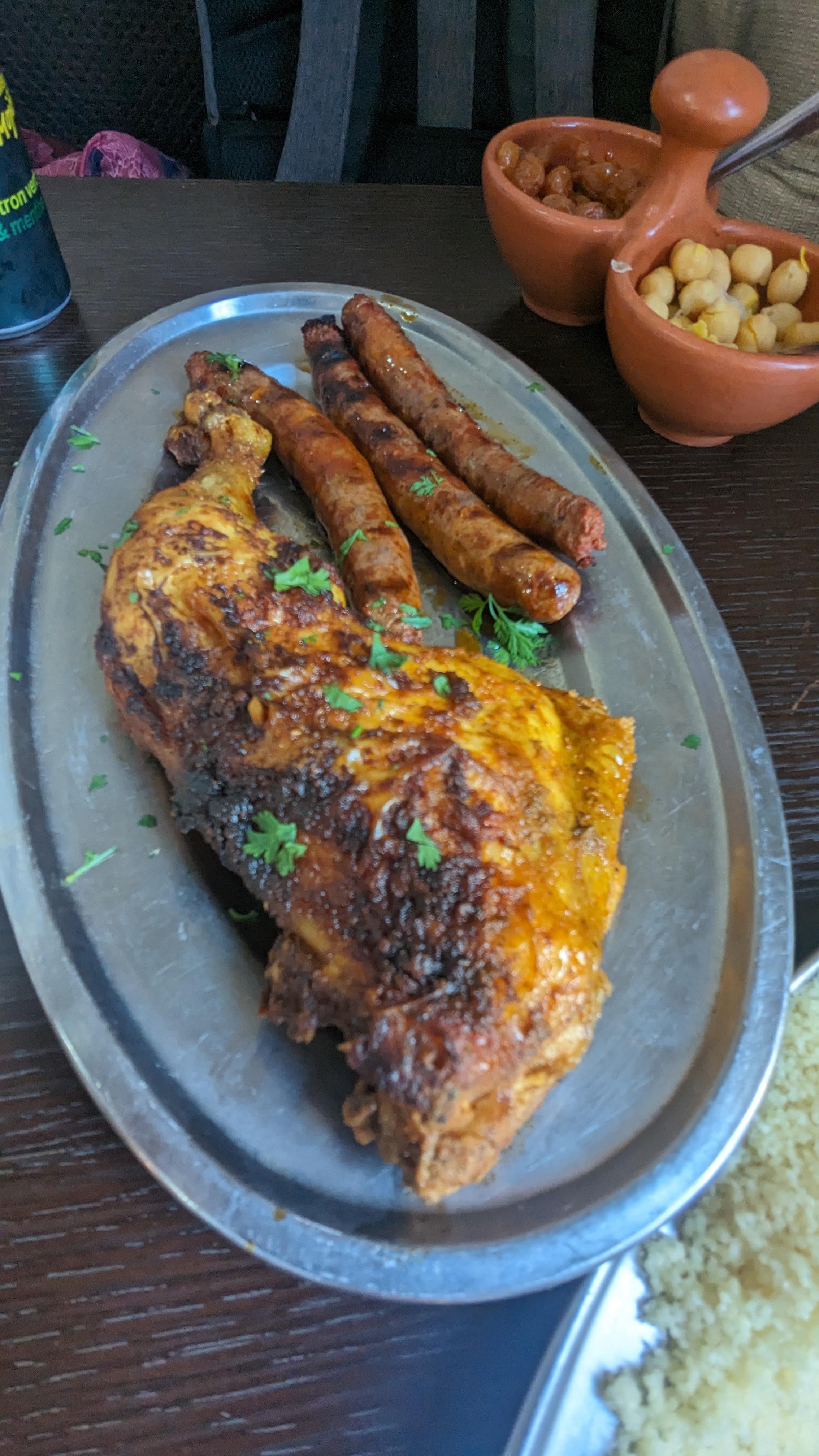 Excellent service, bouffe marocaine authentique et fraîche. Merguez cuites sur le grill, la tajine à l'agneau est équilibrée entre le braisé de l'agneau, les parfums de citrons confits, d'olives et coriandre. Portions généreuses et prix plus sympa qu'au Canada pour un produit moins authentique. Possibilité de commander un steak frites, bavette ou entrecôte si un commensal préfère la bouffe française. Je recommande.