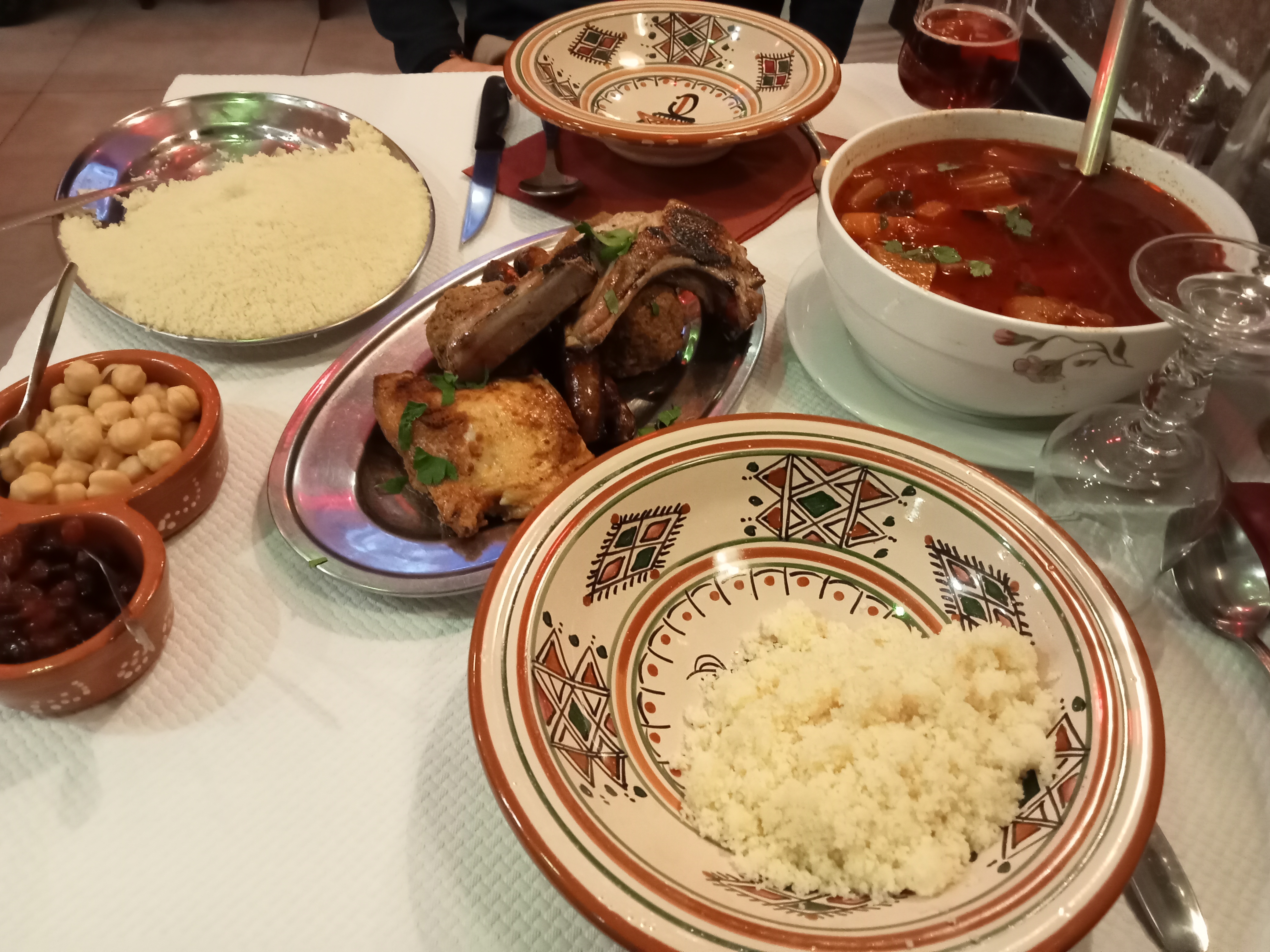 Pris pour 3 personnes à emporter. D'abord bien emballé pour le transport. Portions généreuses et tarifs raisonnables. Semoule fondante, avec beaucoup de légumes et les viandes très bien cuites (côtes d'agneaux grandes et moelleuses). Bouillon gouteux.