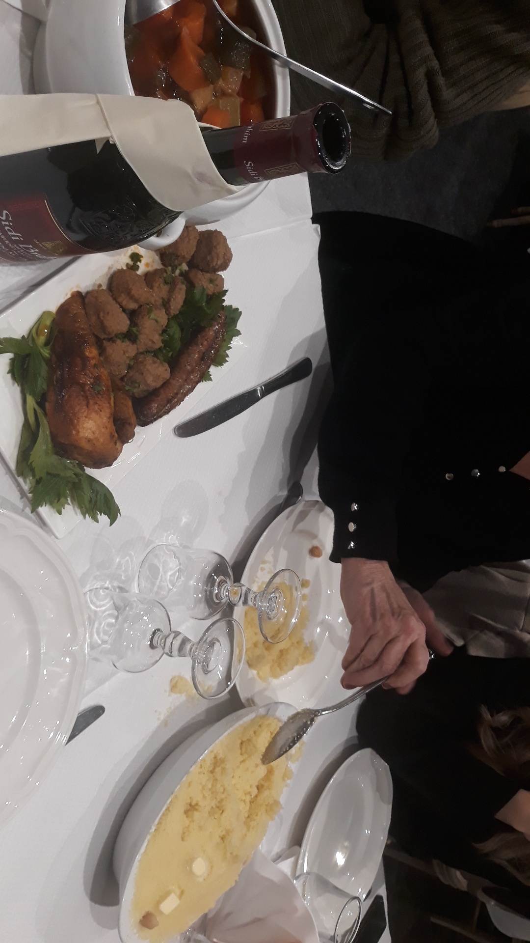 Arrivés à 19h30, nous étions 4. Servis à 21h10. Légumes trop cuits. Poulet trop sec. Merguez sans saveur. Seul le sidi-brahim pouvait être sauvé.
