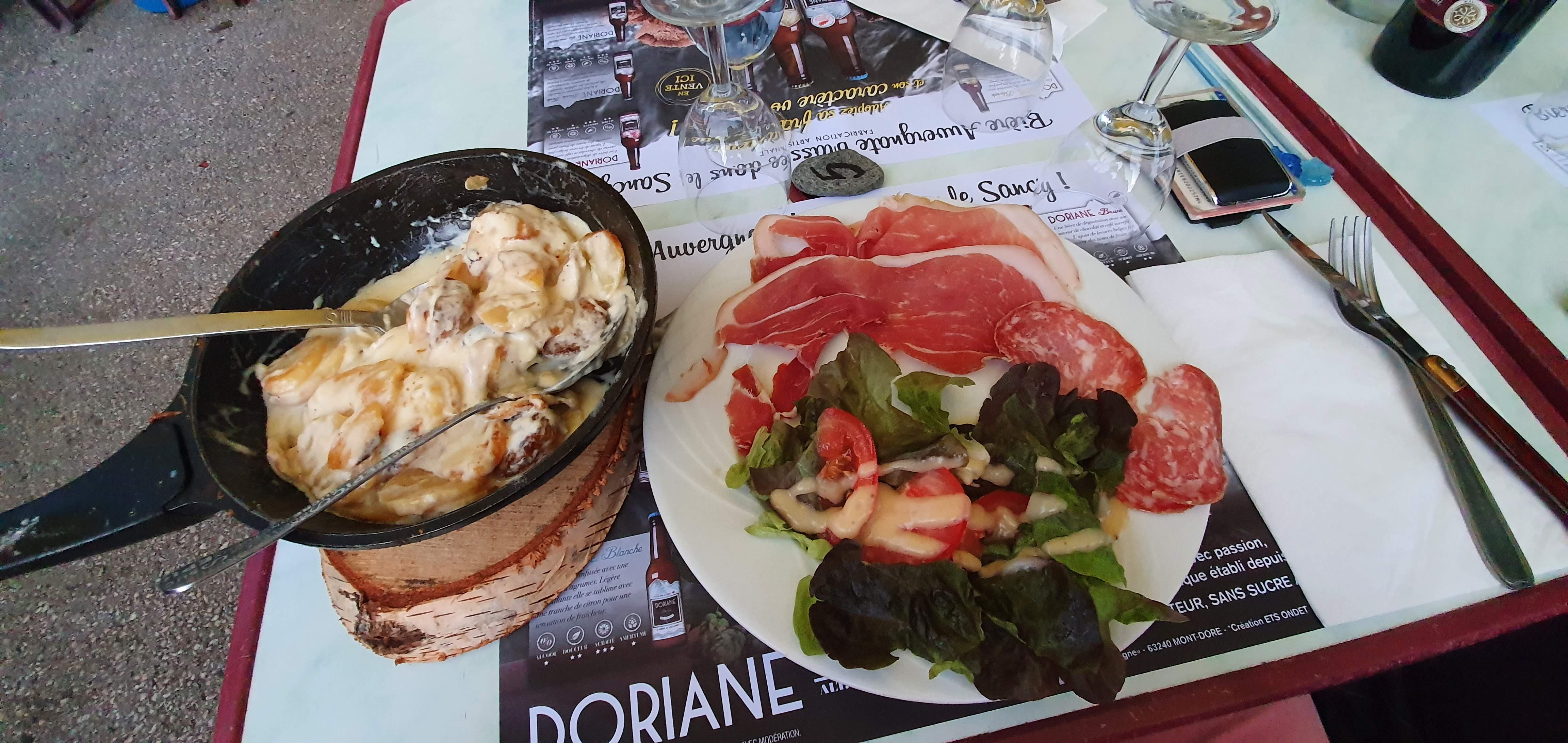 Après une balade, nous avons bu un café en terrasse et, comme midi arrivait, nous avons déjeuné sur place. Délicieuse surprise : tripoux copieux et très bons et une crème brûlée maison comme on n'en avait jamais goûté. Nous reviendrons pour une truffade !!!