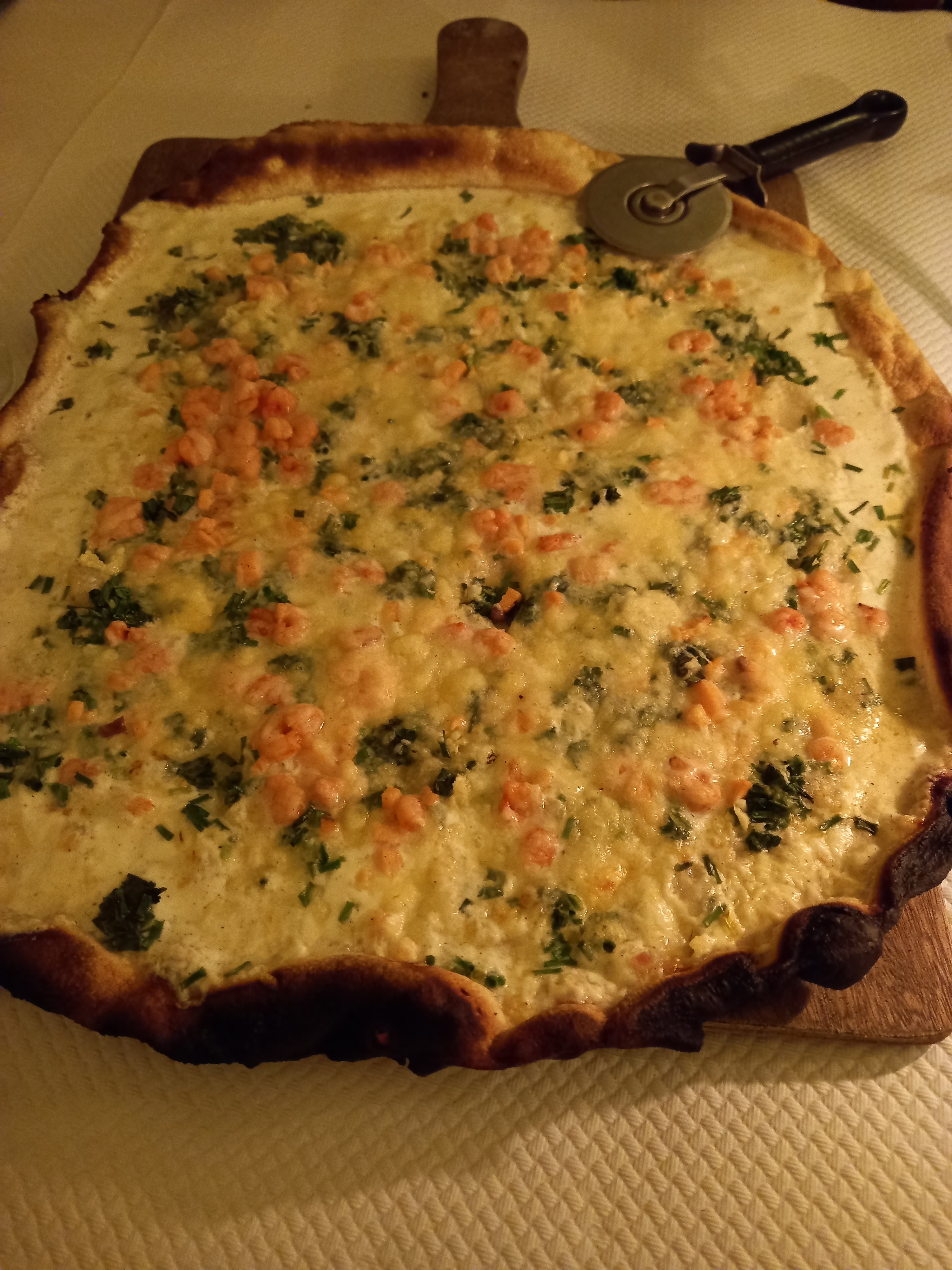 Mon conjoint, ma petite de bientôt 3 ans et moi-même découvront ce restaurant par un couple d'ami. Nous étions donc 4 adultes et 4 enfants. Il est proposé à la carte des pizzas et flammekuech cuitent au feu de bois. Le concept est sympa, nous commandons plusieurs pizza et flammekuech que nous partageons. Les produits étaient bon dans l'ensemble. Nous avons moins apprécié la flammekuech aux crevettes. Unanimement nous avons trouvé que les crevettes manquaient de goût. Nous portons également un avis défavorable à la qualité de l'accueil. Non pas de la part du serveur qui a été agréable mais de celle du patron. Je ne pourrais que conseiller aux personnes avec enfants de choisir un autre lieu. Ce restaurant n'est pas le 1er que je fais et je n ai jamais eu à faire avec une telle attitude de la part d'un patron.Je ne m'etalerait pas plus sur le sujet ne souhaitant pas faire un melo drame sur cet avis google 🤣. Malheureusement cela a apporté un gout d'amertume à cette soirée. Dernier point il manque d eclairage à l'avant du restaurant c est pas très secure.. voilà.