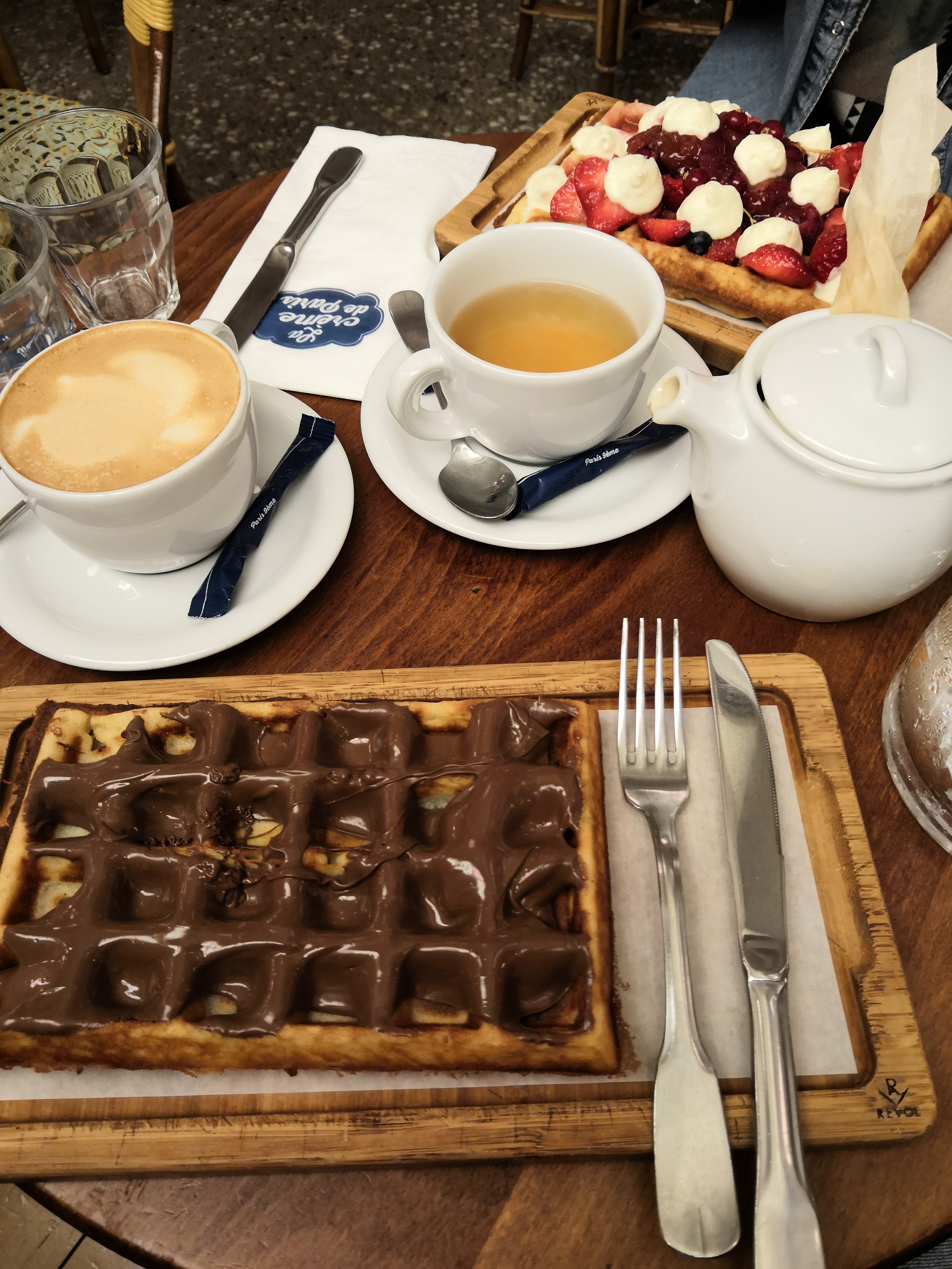 Nous sommes arrivés vers 17h00. La salle était comble. Nous avons dut patienter plusieurs minutes. Cependant l’attente n’était pas désagréable car il est possible de voir les gaufres, les crêpes, les jus se faire devant nos yeux. Le cadre est sympathique sans être ni pompeux ni négligé. Parfait pour un rendez-vous ou un moment en couple ou entre amis décidé sur l’instant. Malgré que le restaurant n’est pas de port, on ne sent aucunement le froid de la rue. La salle est grande, mais les tables ont une certaines promiscuités, si vous voulez un repas d’affaires laissez tomber ou alors pour se relaxer, se détendre. Nous étions juste à côté des toilettes, mais aucune gêne (odeur, bruit,...) a mon grand soulagement. Le personnel est adorable, prêt à venir aider des indécises comme je suis tellement j’ai envie de tout essayer. Les cocktails sont délicieux (Je recommande celui à base de gingembre) et vous en avez pour tous les goûts. Concernant les plats un délice. Je n’ai goûté que la gaufre aux fruits rouge mais c’était un délice. Les fruits sont pleins de saveur, rehaussé par un sirop d’érable goutu. La gaufre est fondante, avec une légère note de sucrée qui fait valser vos papilles. Mon ami avait pris un modèle plus gourmand encore que j’ai pu apprécié avec une bouchée. En bref, une envie de sucrée dans une ambiance chaleureuse (avec un bon rapport qualité/prix) ? La Crème de Paris n’attend plus que vous.