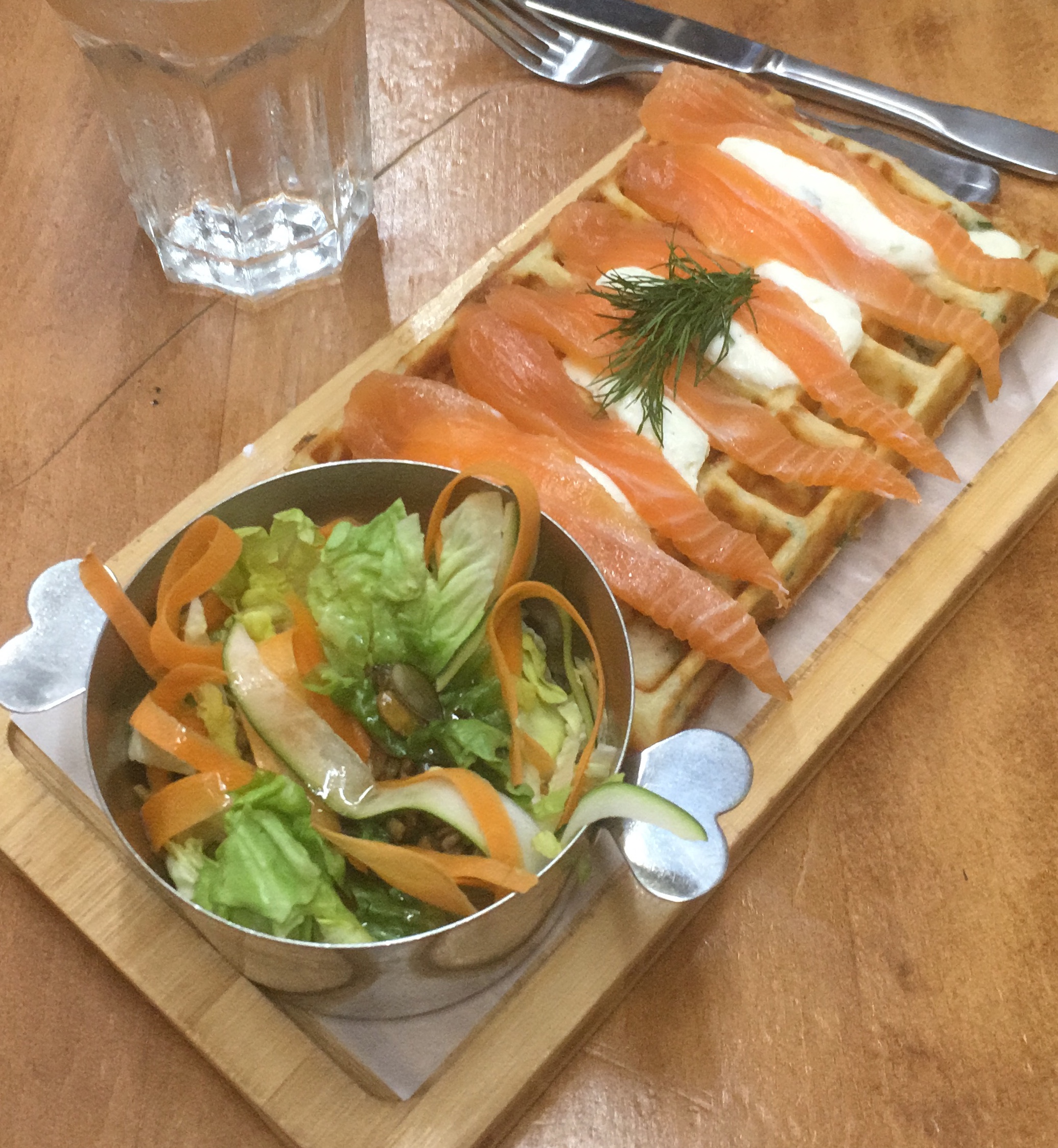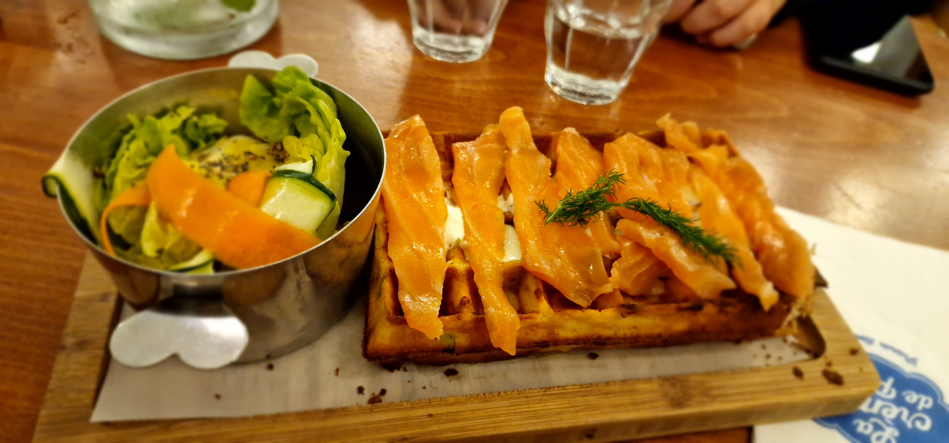Très belle surprise !! Nous avons beaucoup hésité avant renter... La carte nous disait bien, mais beaucoup trop du monde. Finalement nous avons décidé de rester et aucun regret. Personnel très gentil, ils ont tout fait pour qu'on puisse rentrer avec la poussette et ils ont même proposé de chauffer de l'eau pour le biberon du bébé si nous avons besoin. Nous avons pris gaufre pastrami et gaufre saumon, juste délicieux qui sont servis avec une salade très savoureuse. En dessert nous avons partagé une crêpe caramel beurre salé... Un délice !! Un caramel pas comme les autres ! Très belle expérience !! Nous allons revenir sûrement !!