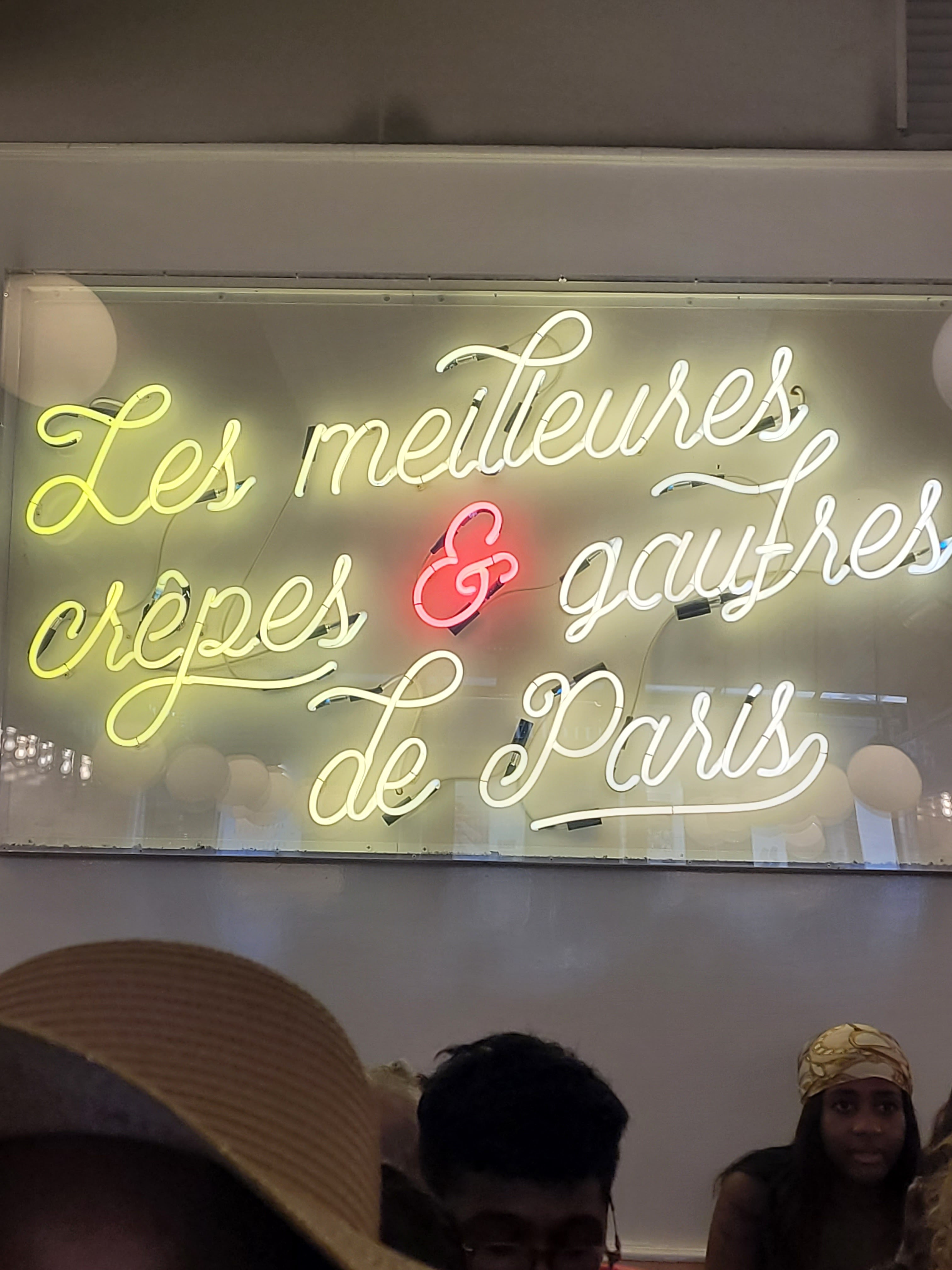 Entièrement d’accord avec ce néon placé au fond de ce petit restaurant. La carte propose de nombreux choix de garniture pour les gaufres et crêpes qui, elles, sont légères et douce en bouche. Un délice ! Les milkshakes aux fruits sont également très bons.