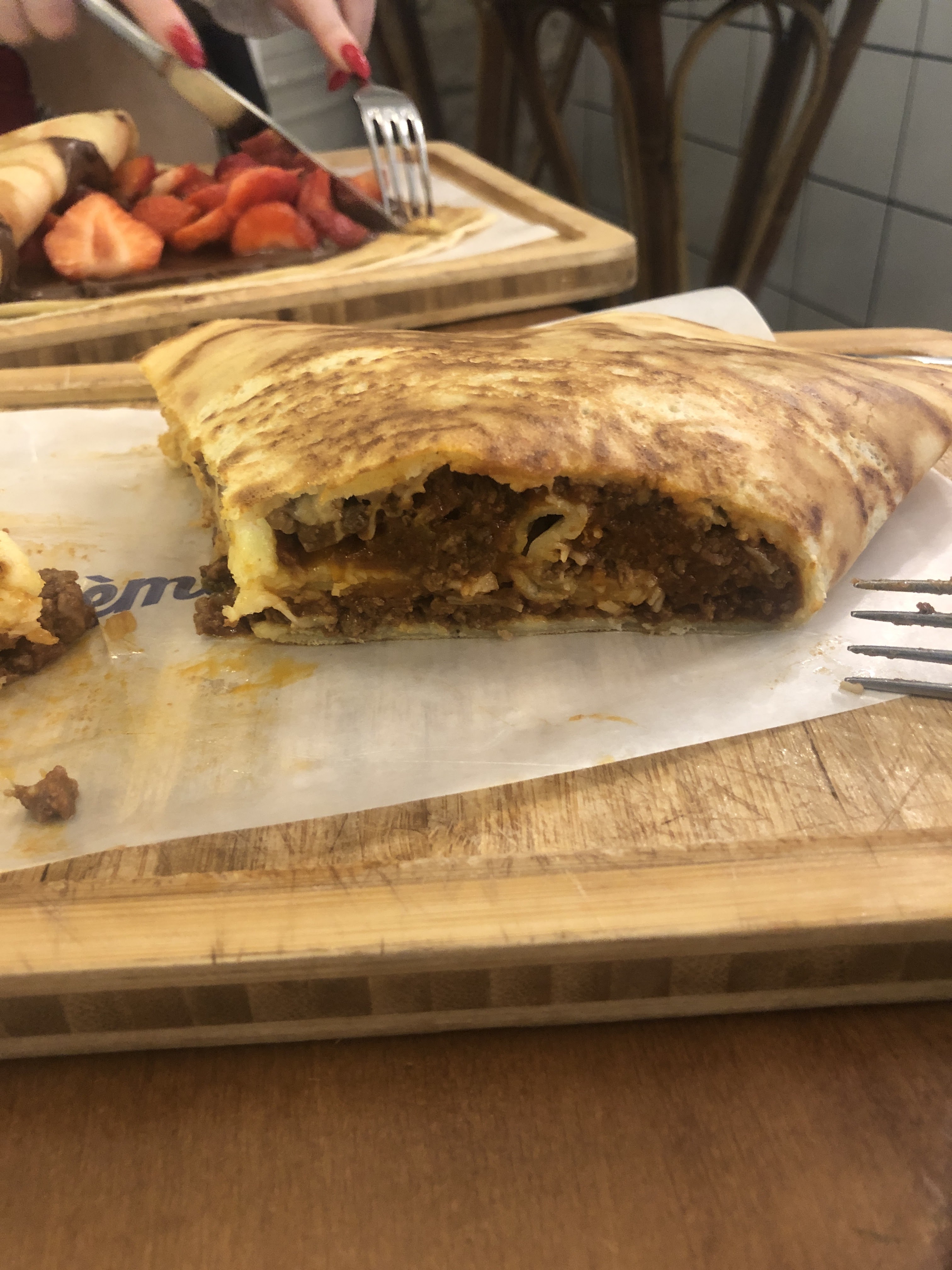 L'endroit parfait. D'énormes portions de délicieuses crêpes pour 10€. Pour 1,5€ supplémentaire, vous pouvez ajouter de la bolognaise, ce qui double la quantité de garniture et rend la crêpe tout simplement énorme.