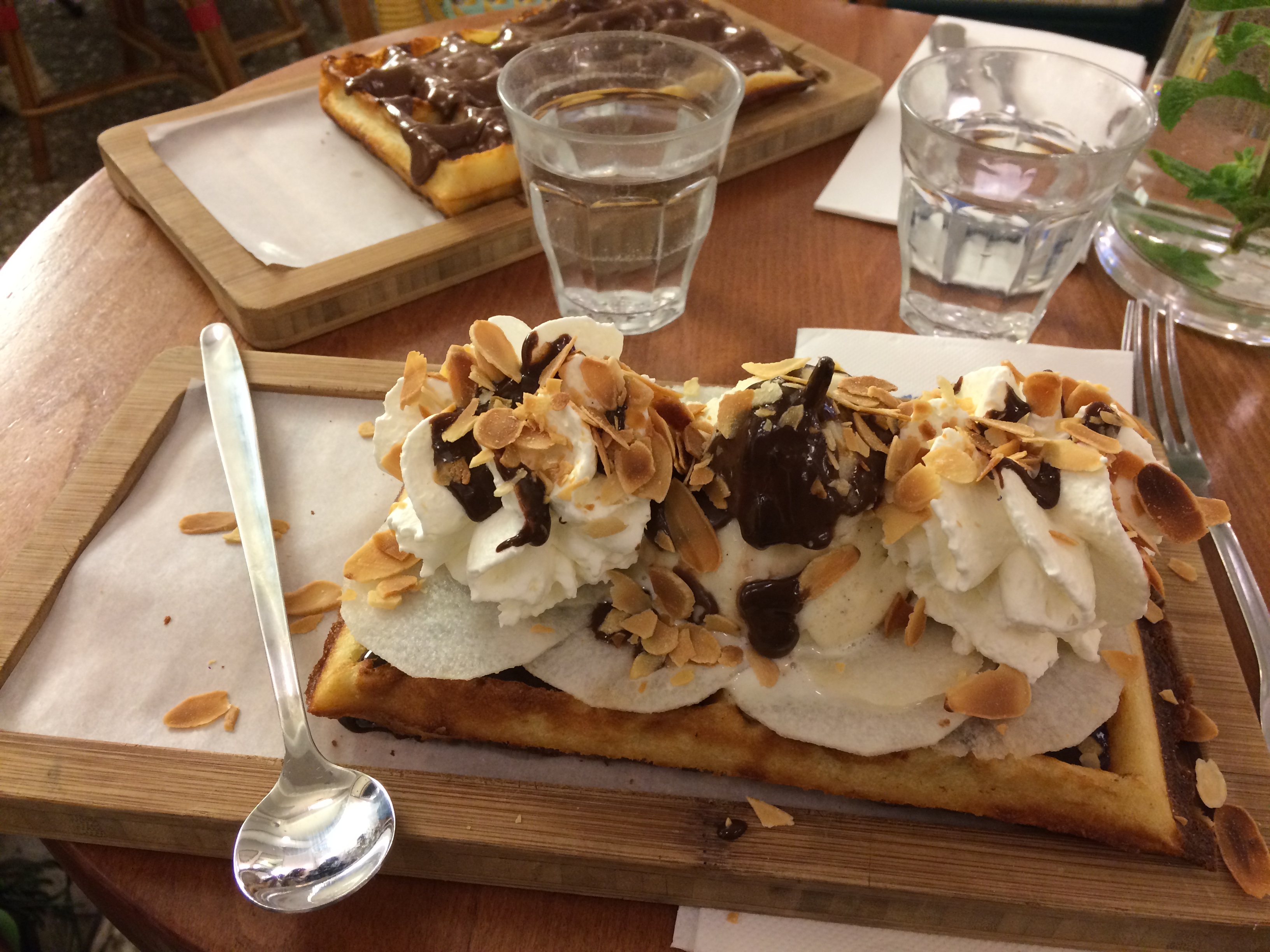 Je ne recommande pas les gaufres, malgré qu'elles soient faites sur place, on dirait qu'elles sont réchauffées au micro-ondes, trop moelles. L'idée de la feuille de menthe dans la carafe est très bonne.