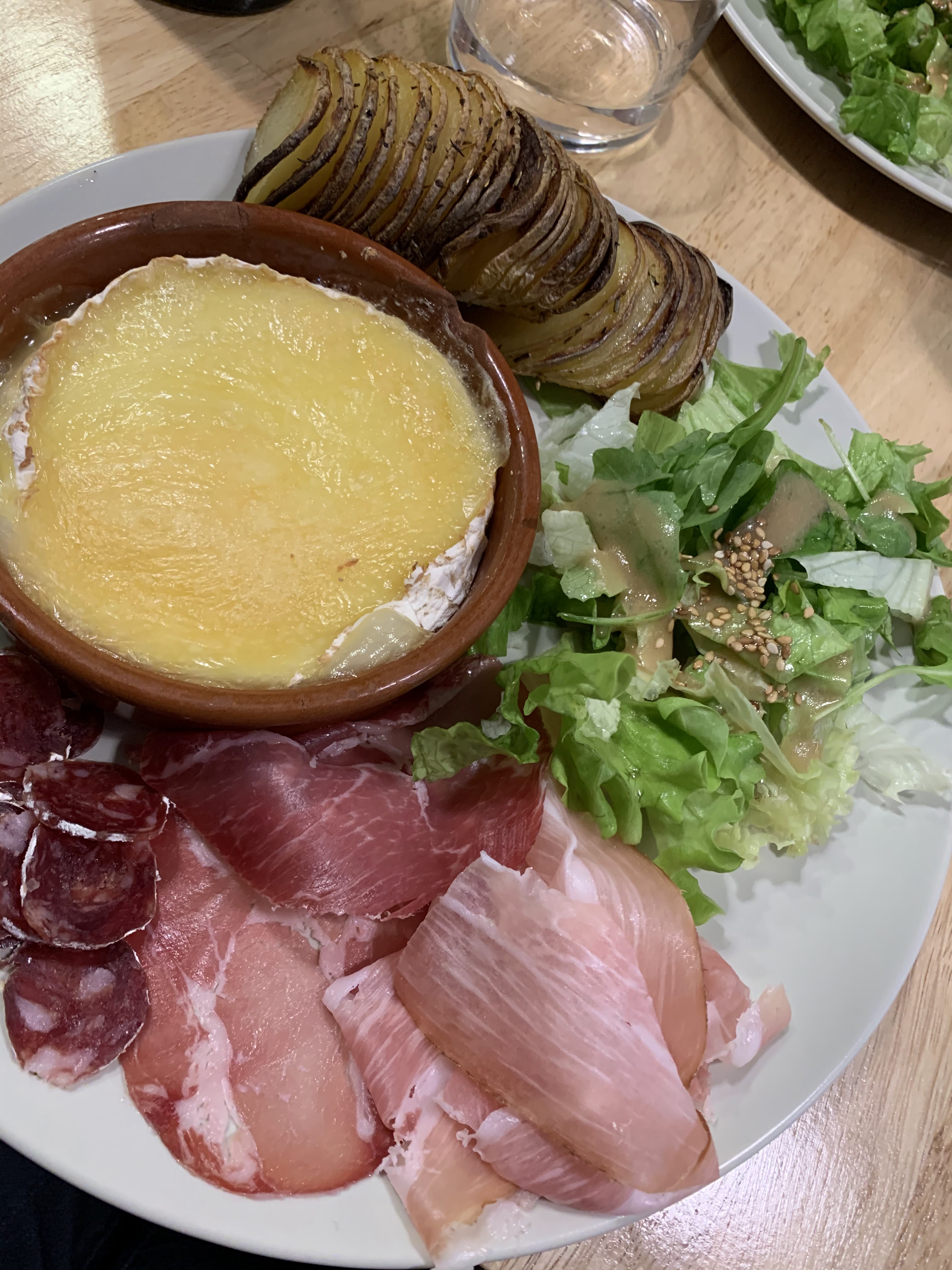 Très belle expérience Le personnel est très agréable Le rapport qualité prix est incomparable Les avis précédents sont justifiés, je vous l'assure Pour notre part, nous avons pris le plat de jour (tarte avec salade et Charcuterie) ainsi qu'un camembert rôti (avec salade et Charcuterie également)