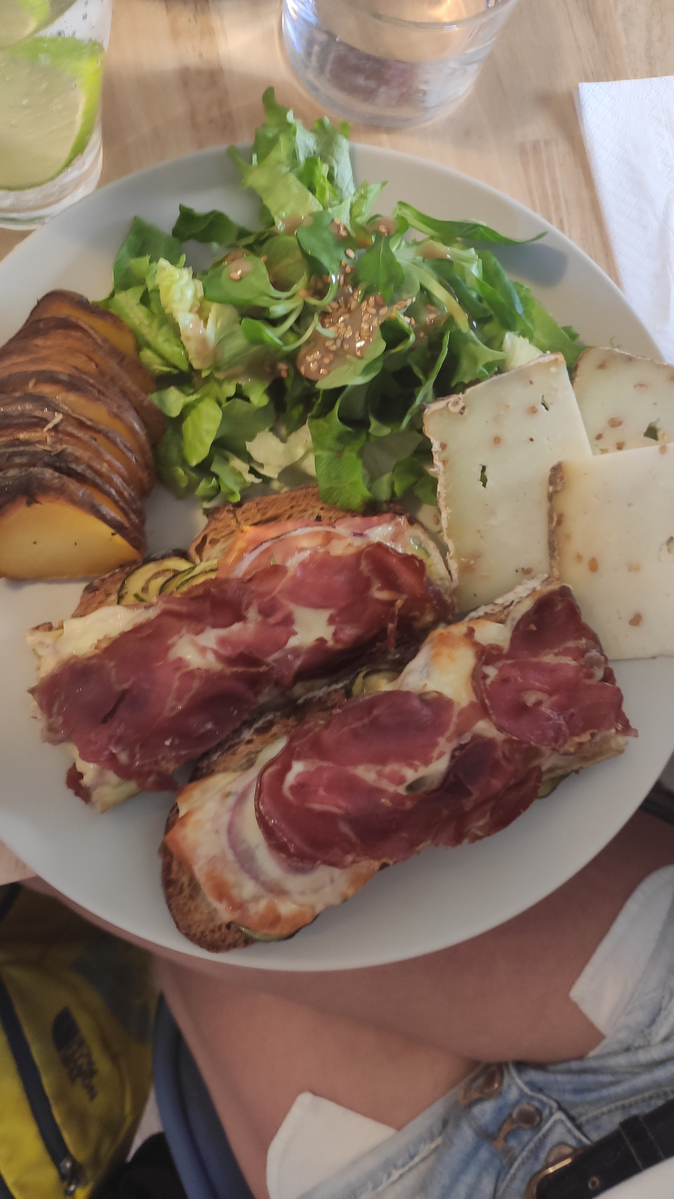 Nous nous sommes arrêtés pour le déjeuner et avons essayé le plat de jour qui était du pain grillé garni de légumes et de fromage et une assiette de fromages et de charcuterie - les deux étaient servis avec une salade verte et des pommes de terre rôties. C'était un délicieux déjeuner simple et léger et une excellente occasion d'essayer une sélection de fromages et de petits produits.