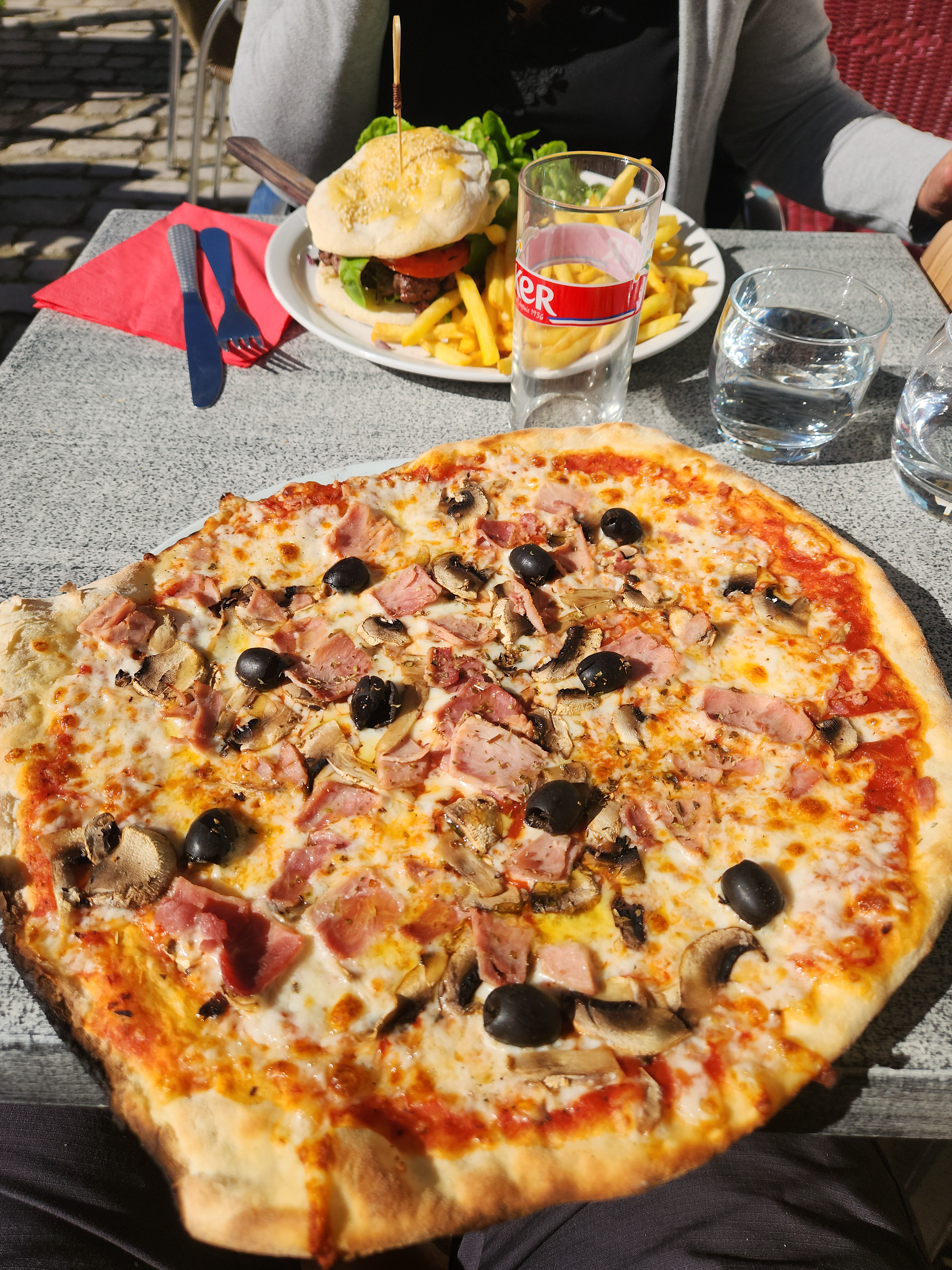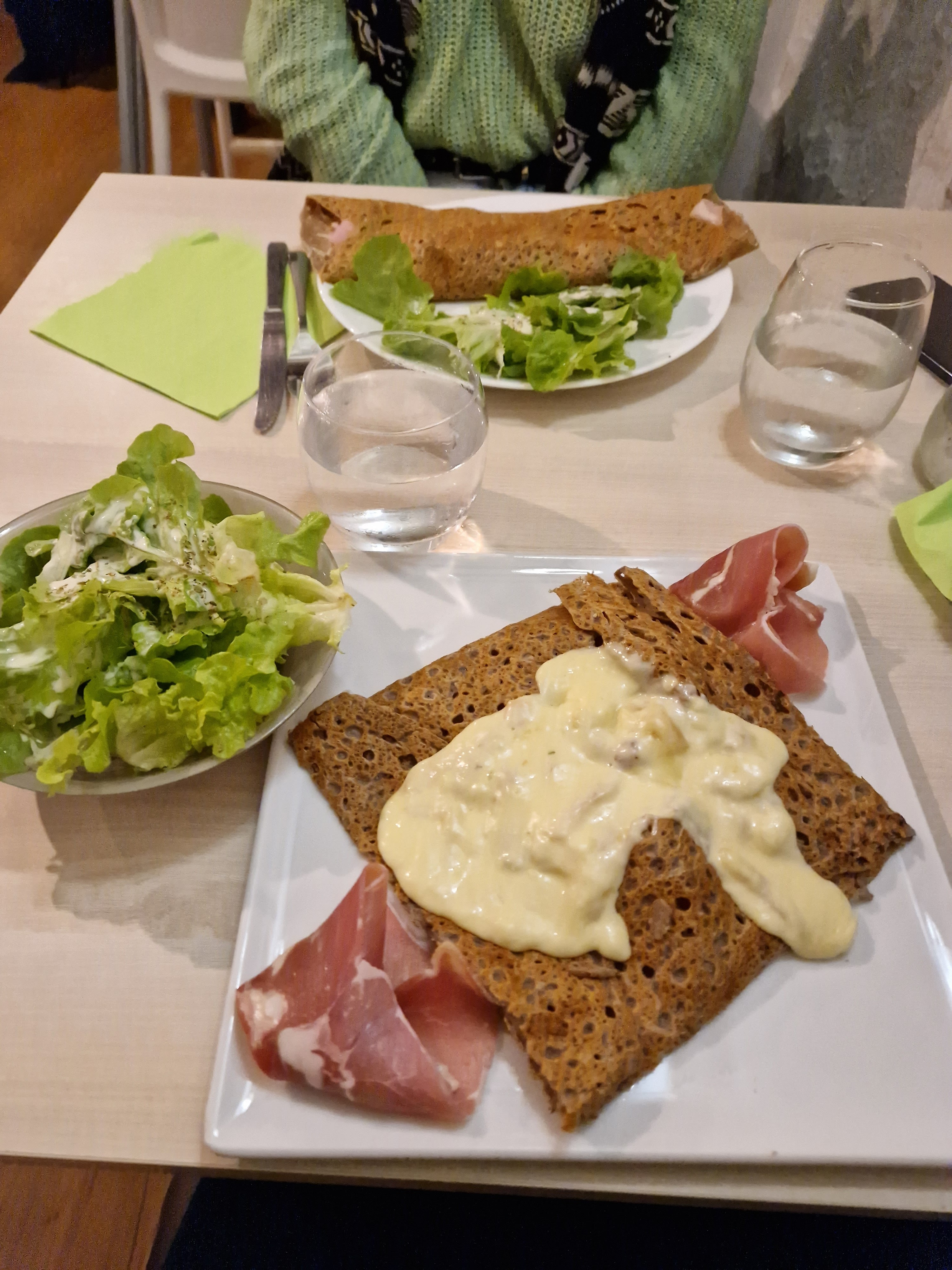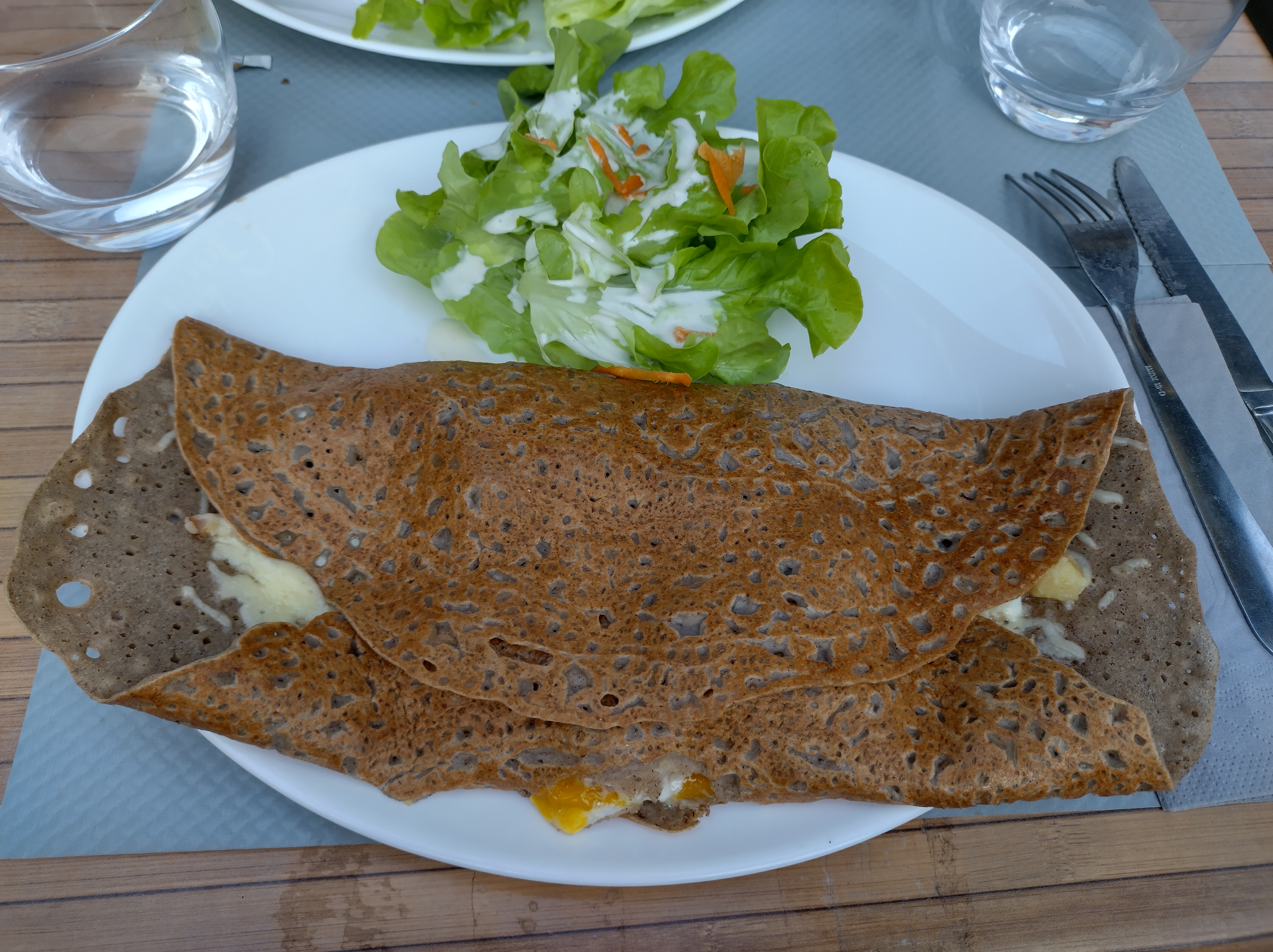 Une arrivée tardive où les cuisiniers ont eu la gentillesse de nous recevoir. Au menu une galette, un crousti et une pizza suivi de 3 crêpes pour le dessert, on s'est régalé, encore merci