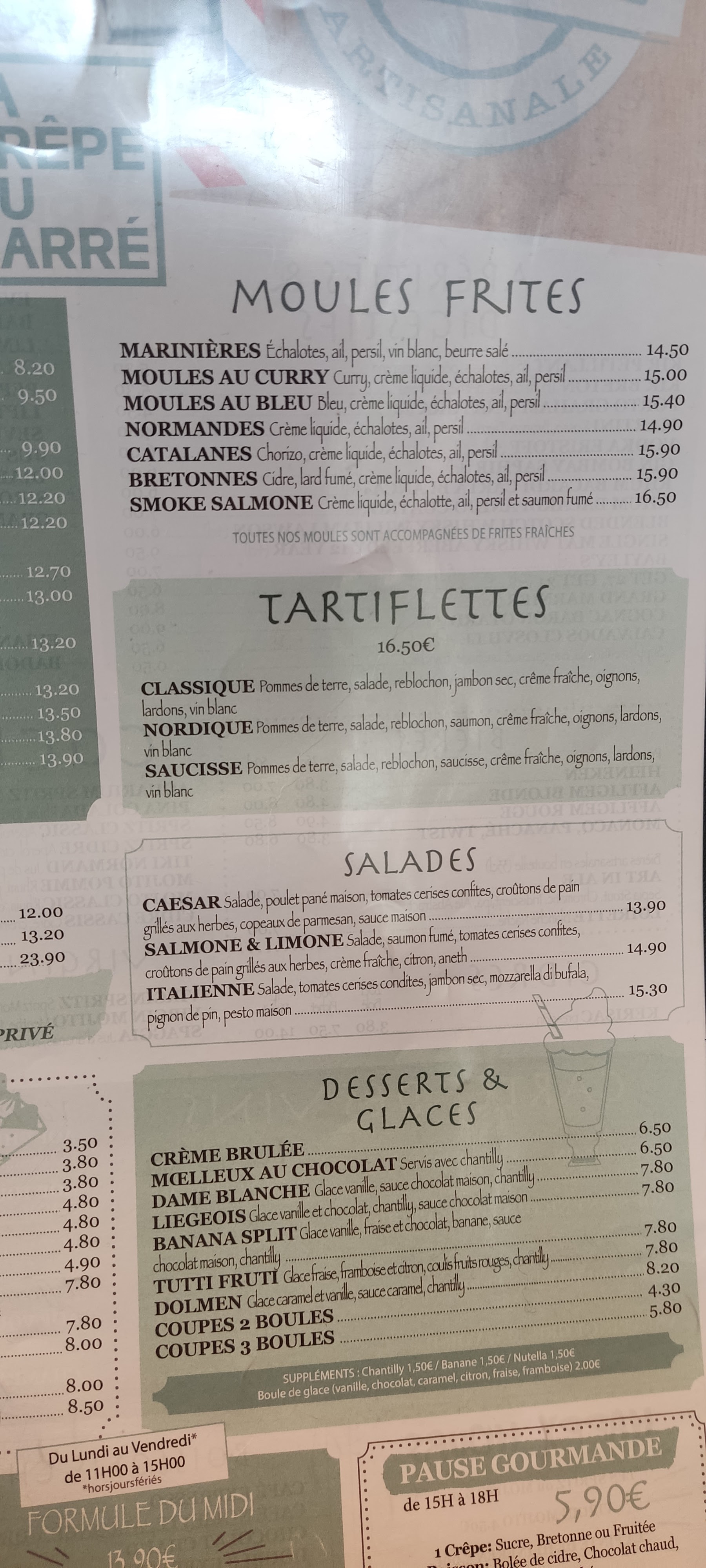 Je suis venue à 2 reprises tartiflette c'est un gratin dauphinois, 2eme fois Moule au bleu !!! Ou est le bleu!!! et moule pas cuite frites froide, restez aux crêpes il paraît qu'elle sont bonnes