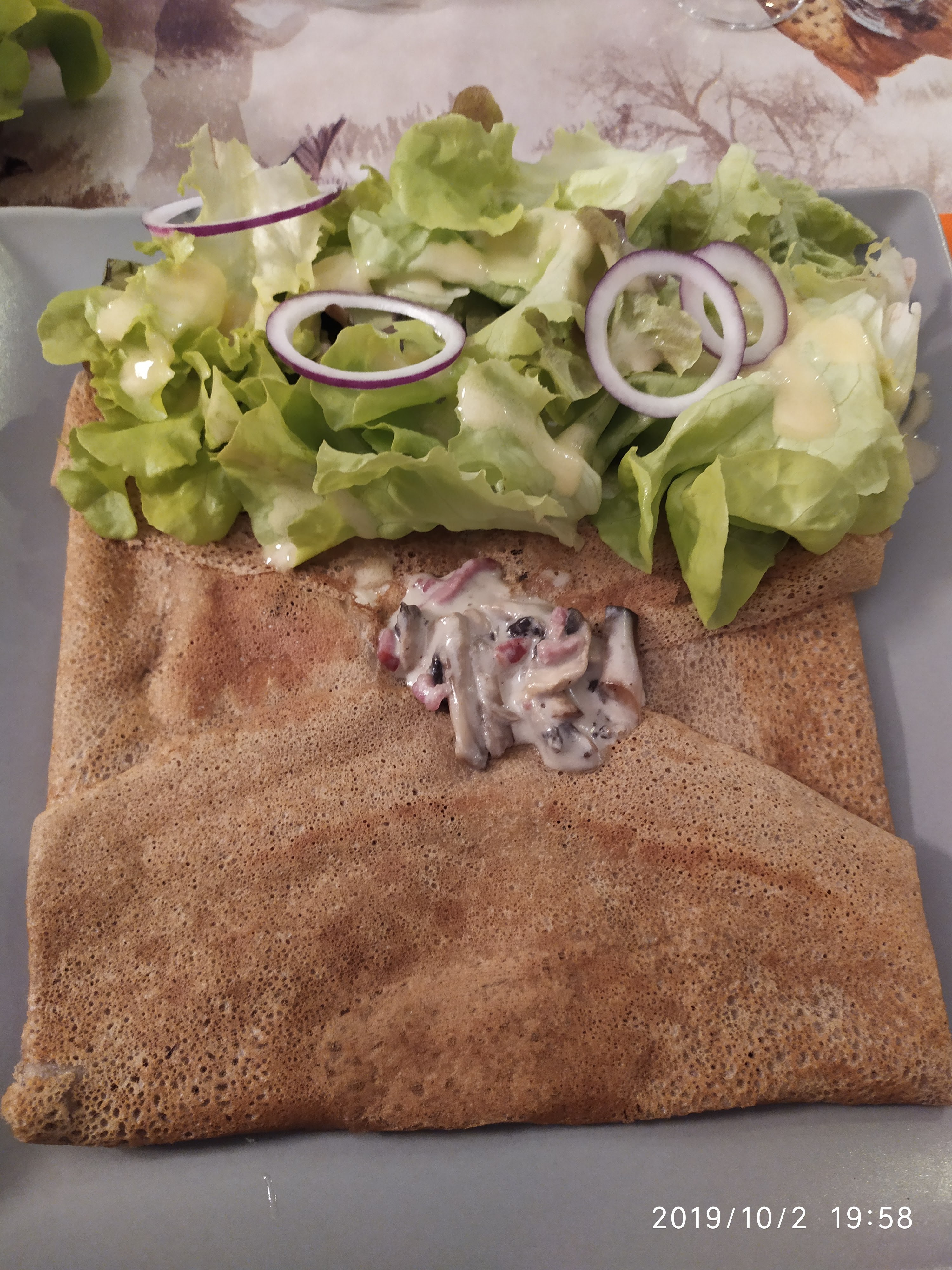 C'est un endroit très simple avec une nourriture très abordable et bonne. Ma salade de chèvre était simple et savoureuse. Ma crêpe (bretonne) était plutôt bonne aussi, les ingrédients étaient très savoureux, mais ma femme et moi l'avons trouvée un peu sèche. Un peu de crème ou de sauce l'aurait rendu excellent. On peut y manger pour 20€ avec une belle salade en entrée, une crêpe et une boisson. Le propriétaire (je suppose) était seul, servant, cuisinant, etc. C'était bien au début mais quand le restaurant est devenu moins vide, c'est devenu un peu long pour nous, surtout avec des enfants.