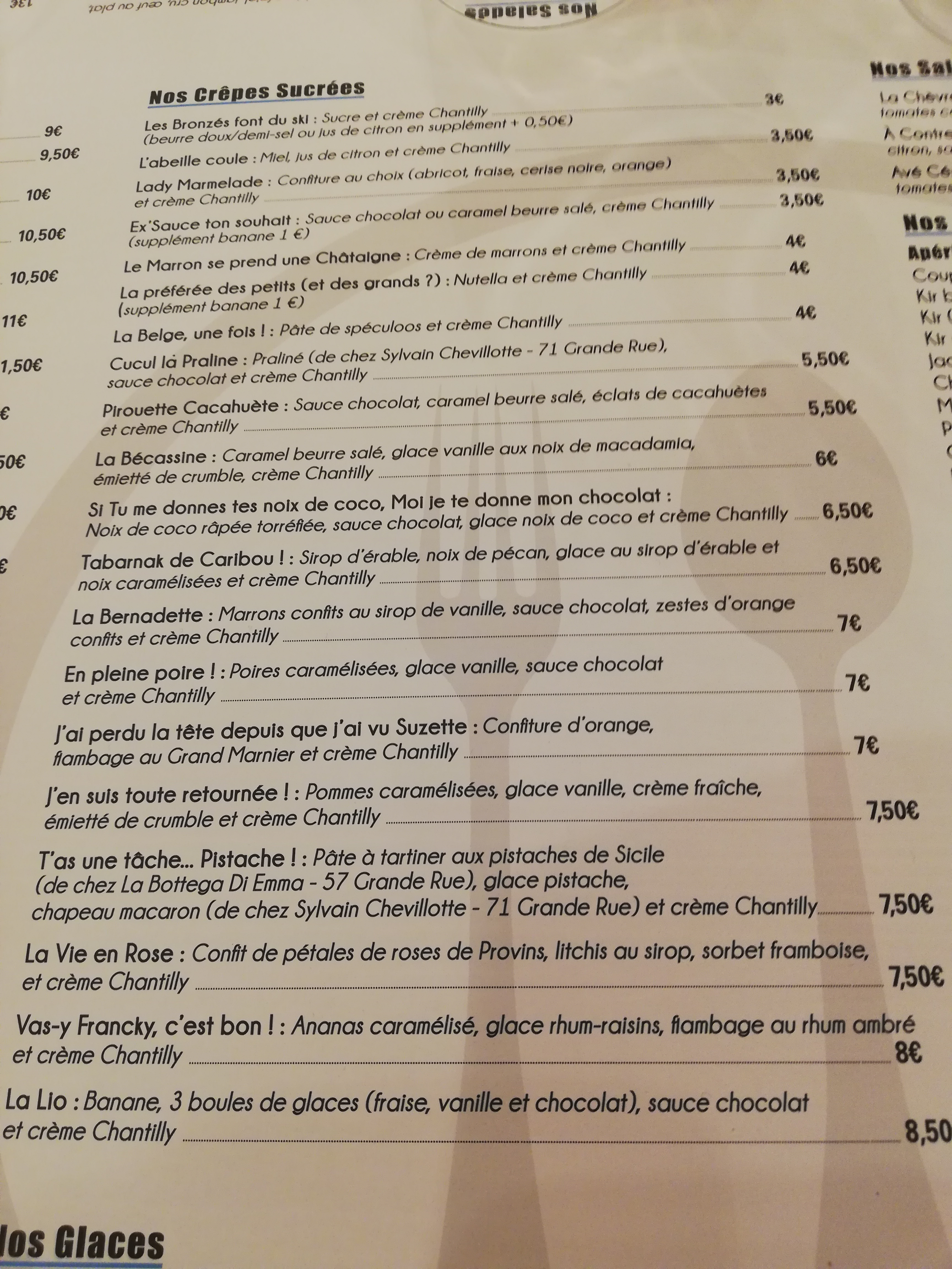 Des crêpes classiques ou originales, avec des intitulés qui sont à l'image du nom du restaurant. Ces délicieuses crêpes sont à un prix très abordable 50 euros à 3 avec les boissons. De plus les serveurs sont très agréables.