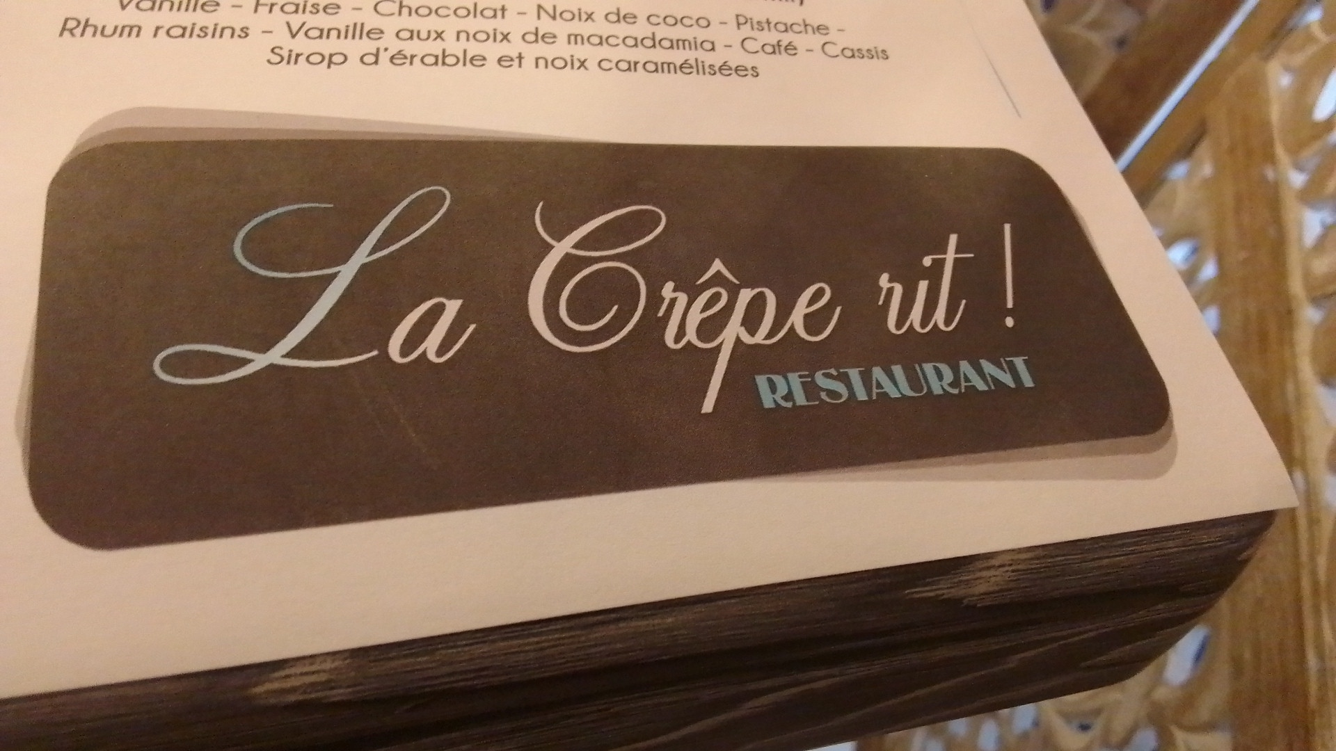 Belle carte de crêpes salées et sucrées à la présentation humoristique imagée. Terrasse ensoleillée.